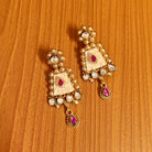 Embrace the opulent beauty of our Kundan Polki set with Meenakari work! The vibrant red ruby and dazzling CZ stones will make you stand out in any occasion. The 18kt gold plating adds a touch of luxury while the perfect matching earrings complete the look. Elevate your style on your special day!