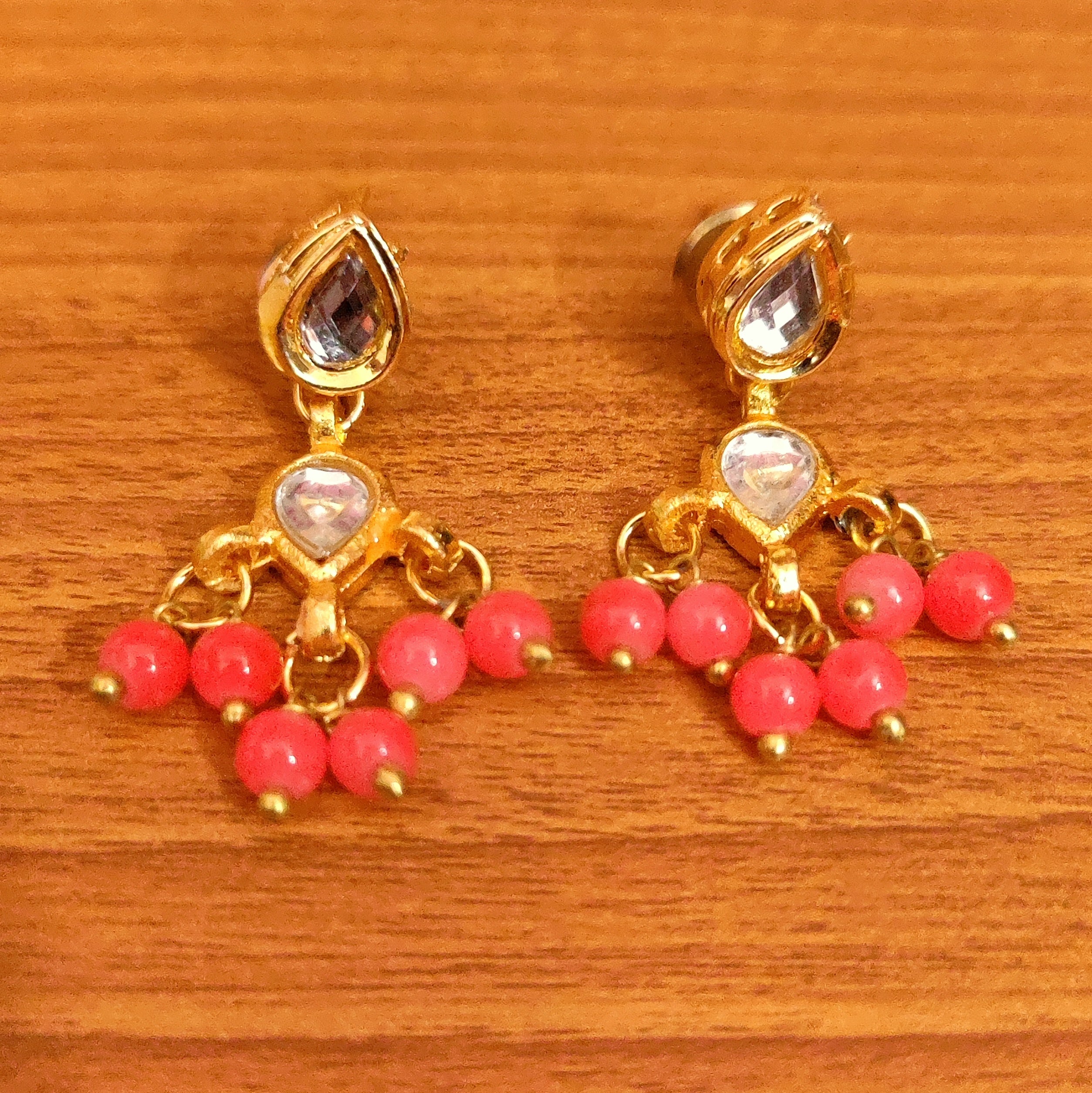 These kundan polki studs are handcrafted in brass alloy with imitation baby pink colour pearls of very fine quality. these artistic yet modern studs are plated with high quality gold rhodium. the earrings are very light in weight.