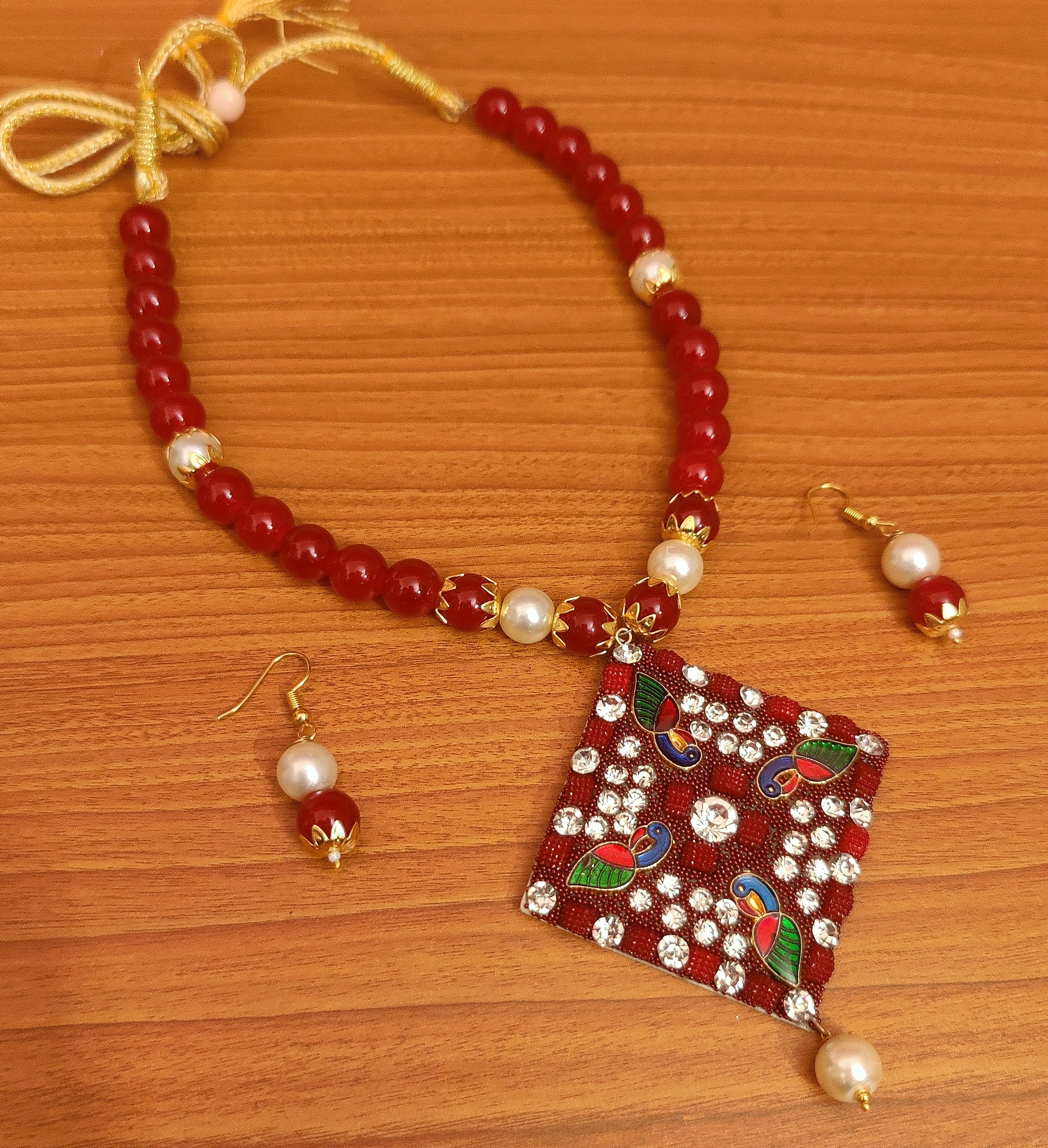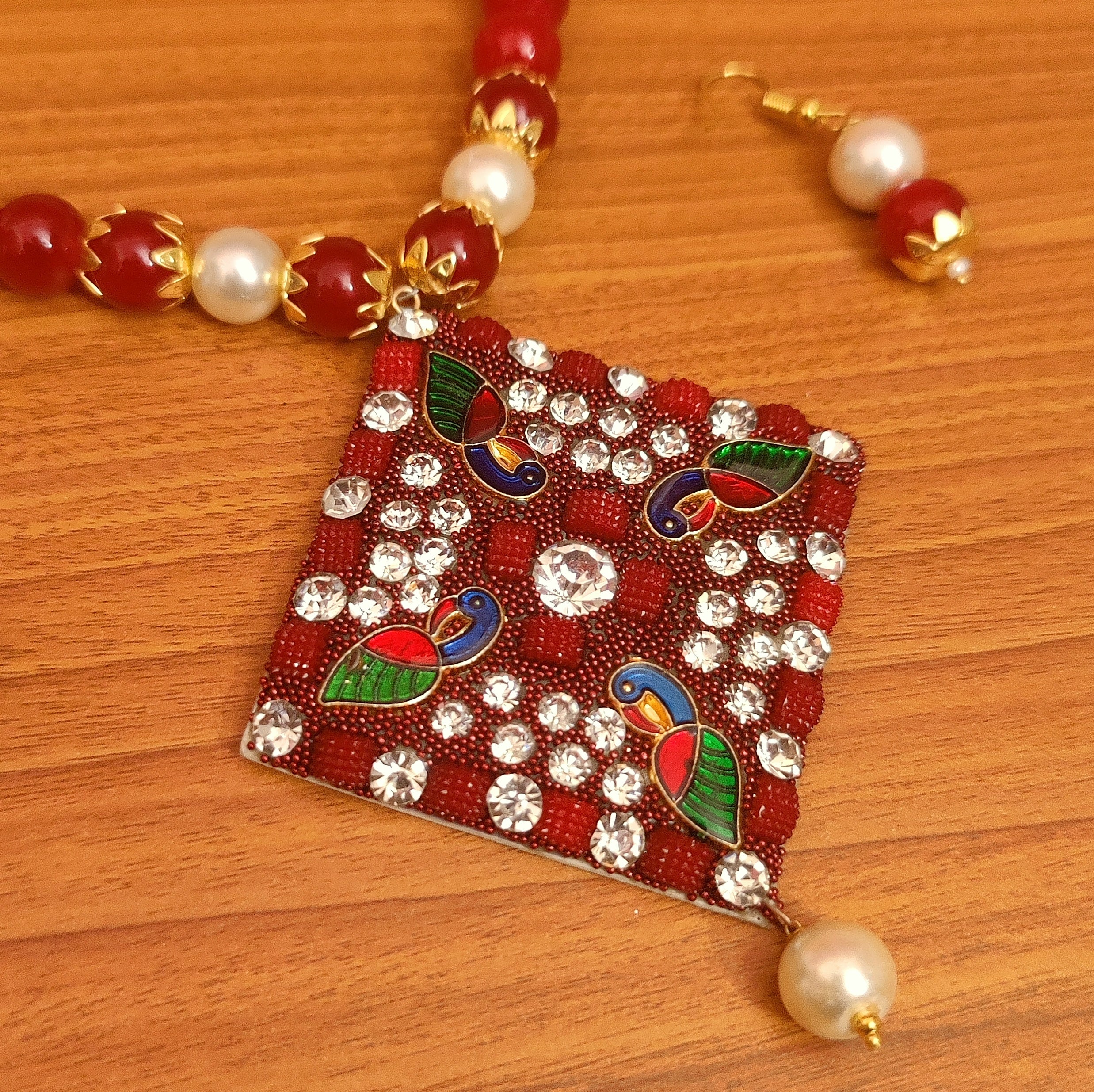 This imitation necklace set is handcrafted in copper alloy with imitation red colour beads of very fine quality . This necklace set is plated with gold plating and is light in weight.