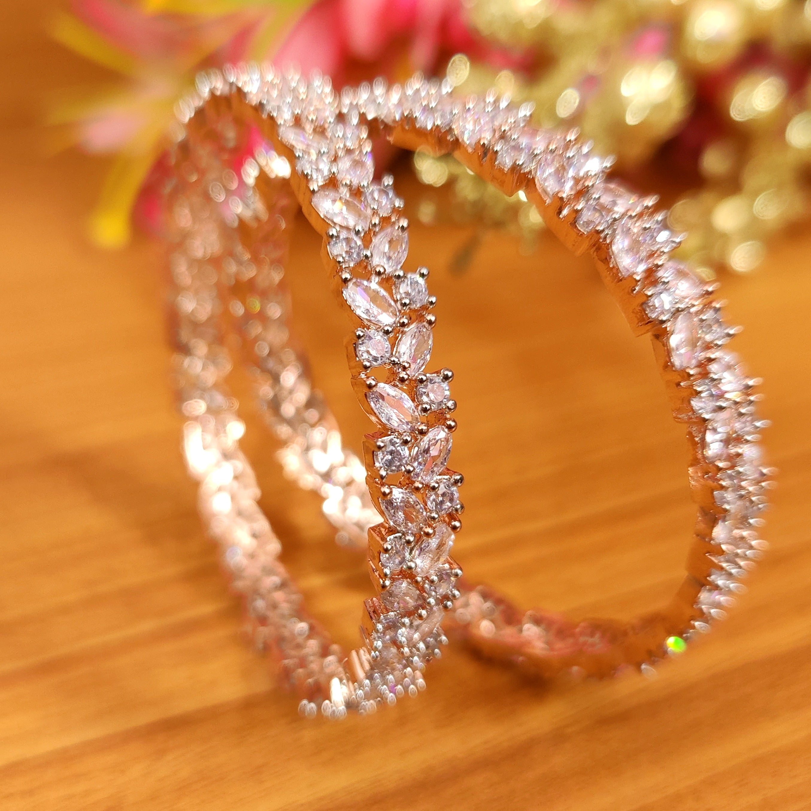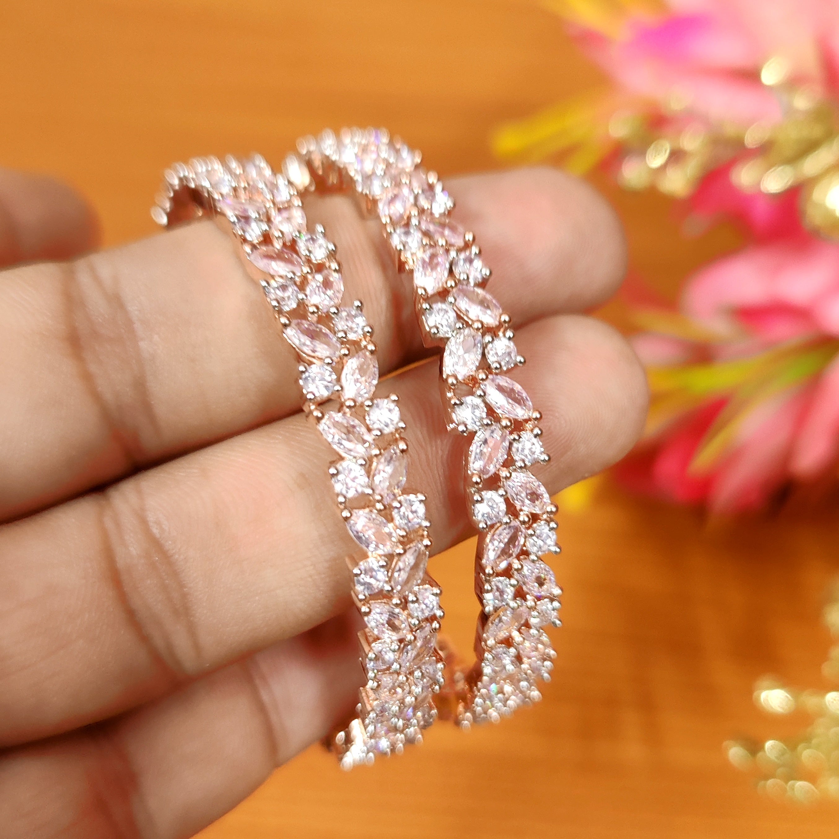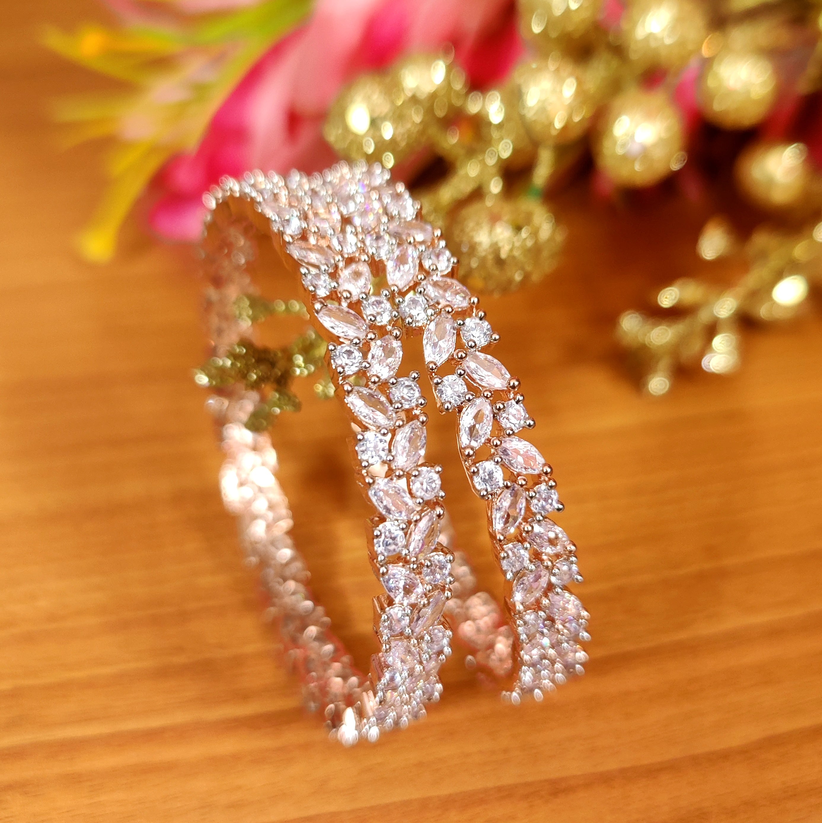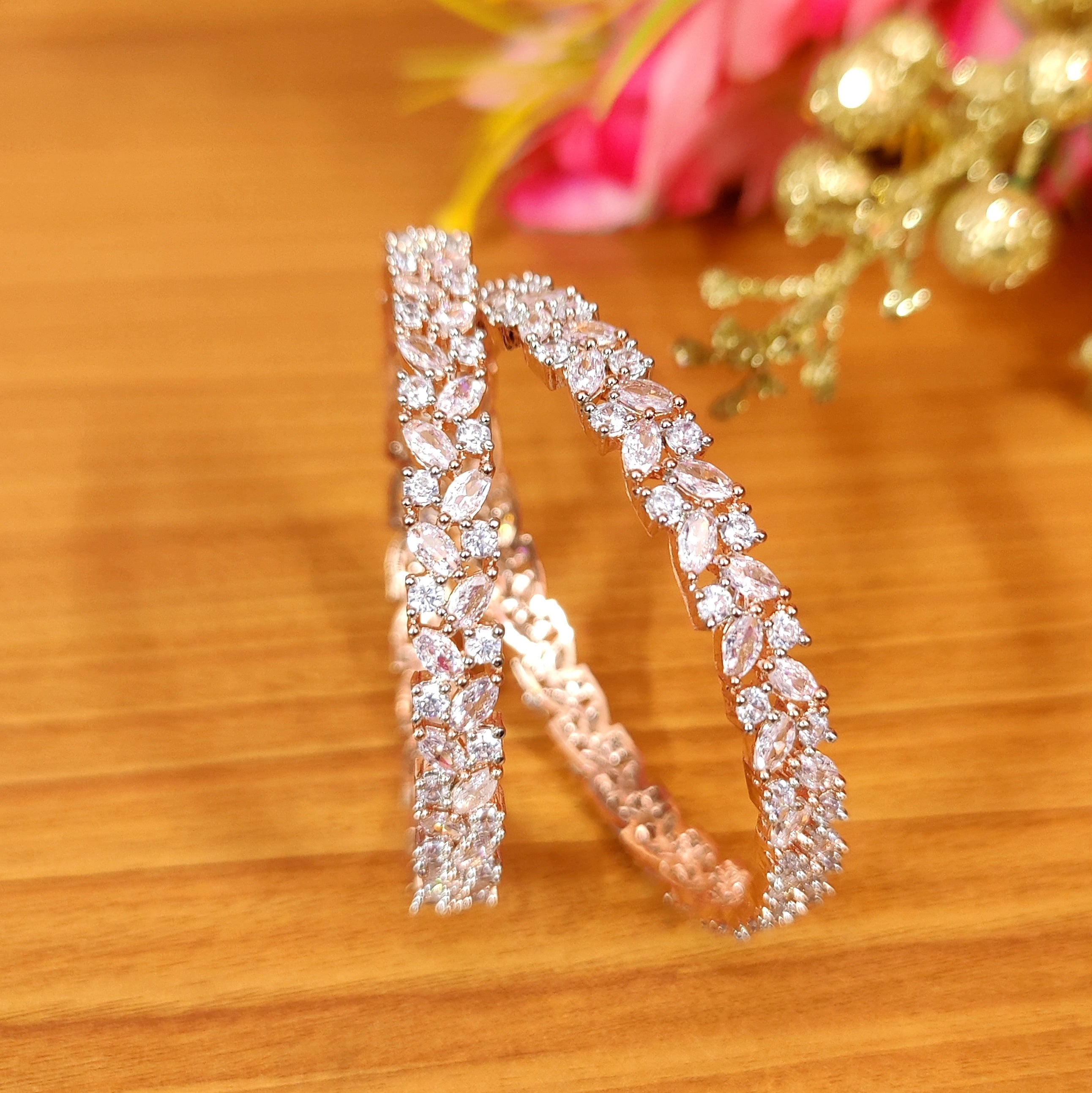 Elevate your style with the Marquise CZ Diamond Look Gold Plated Bangles from Sanvi Jewels. These stunning bangles feature marquise-shaped cubic zirconia stones that offer a dazzling diamond-like sparkle, set in a luxurious gold-plated frame. Perfect for weddings, festive events, or adding a glamorous touch to everyday attire, these bangles blend timeless elegance with modern charm.
