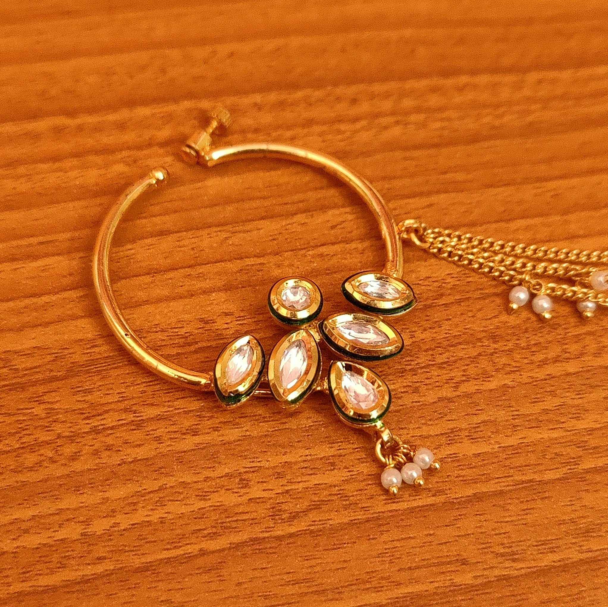 This beautiful nose ring is handcrafted in brass alloy with imitation pearls and kundan with meenakari work of very fine quality . this nose ring is coated with 18 kt gold polish which give it a real look . an absolutely stunning piece to own and is very light in weight.