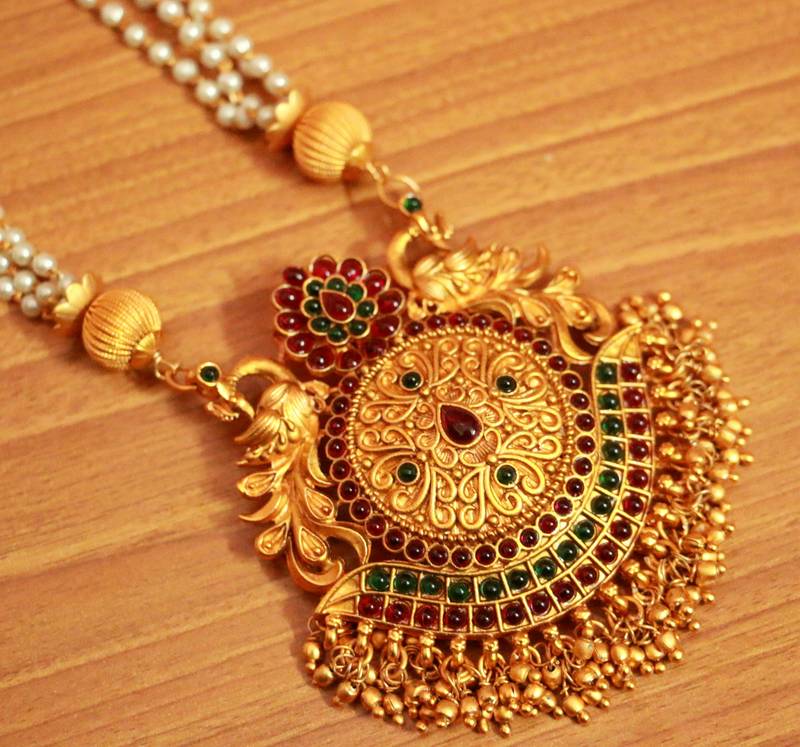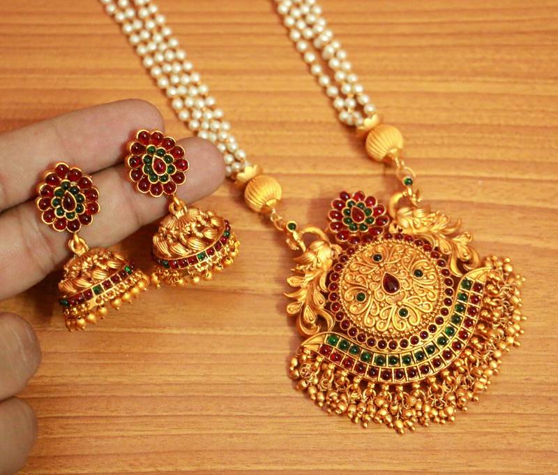 Matt Gold Finish Kempu Stone Pearl Necklace Set