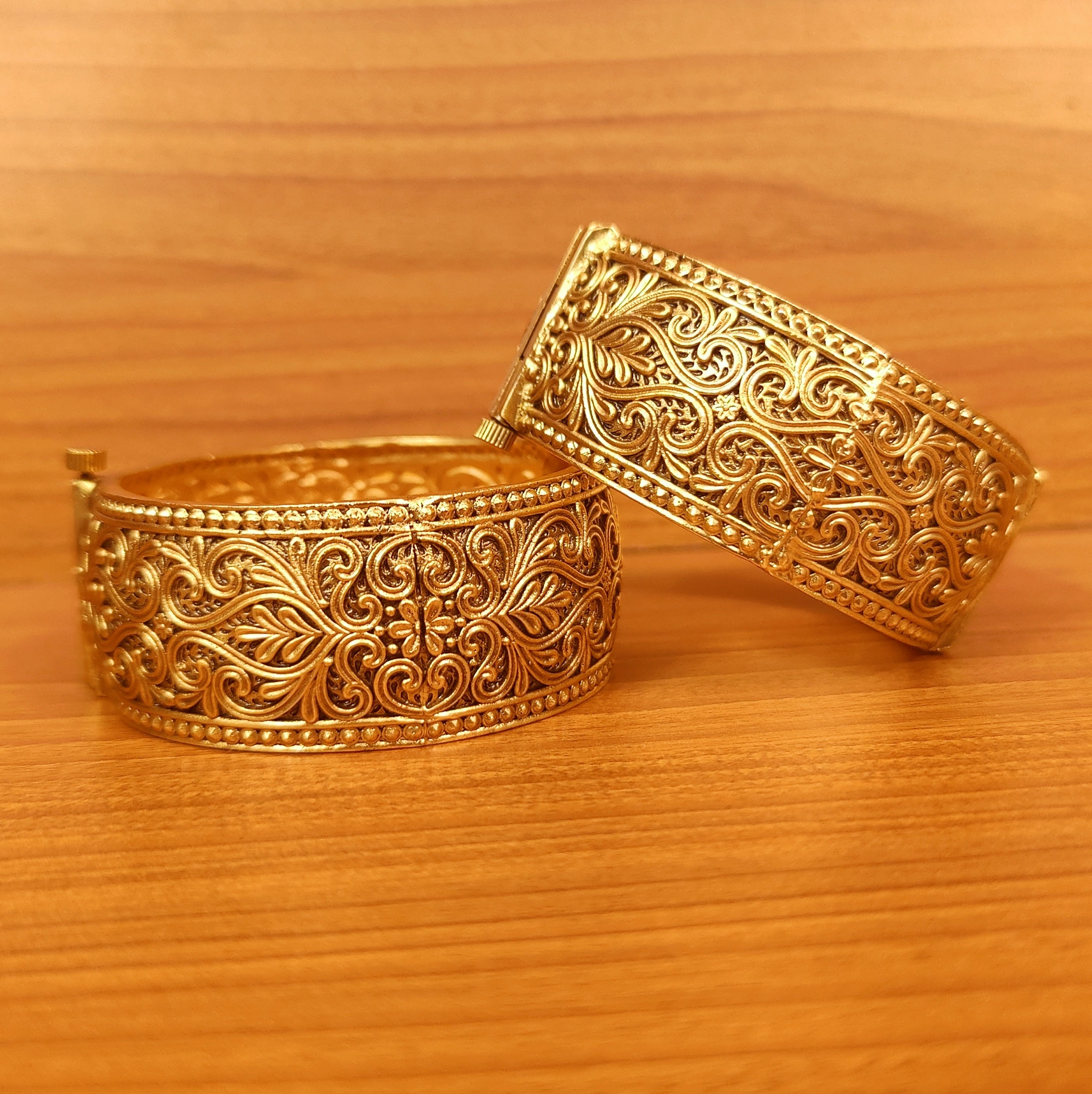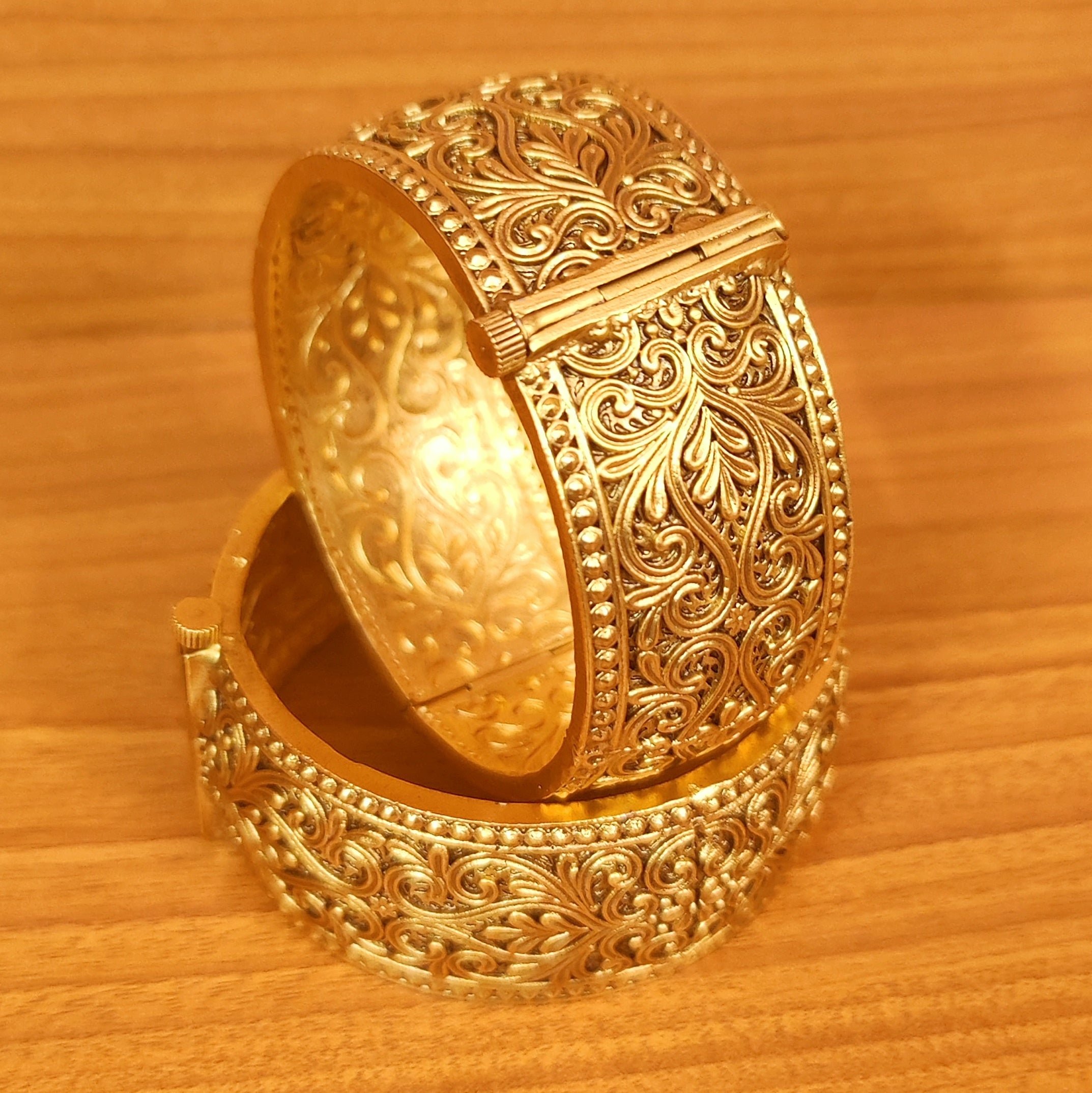 These premium gold look bangle are handcrafted in silver and brass alloy with intricate handcarving work of very fine quality . These bangles are openable and are coated with 22 Kt matt gold plating which gives the design a real gold look . An absolutely gorgeous statement piece of royality to own.