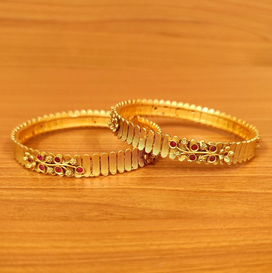 These matt gold look bangles are handcrafted in copper alloy with imitation red colour stones & intricate gold work of very fine quality . These bangles are coated with 22Kt matt gold plating which gives the design a real gold look . The bangles are very light in weight and perfect for occasional wear.
