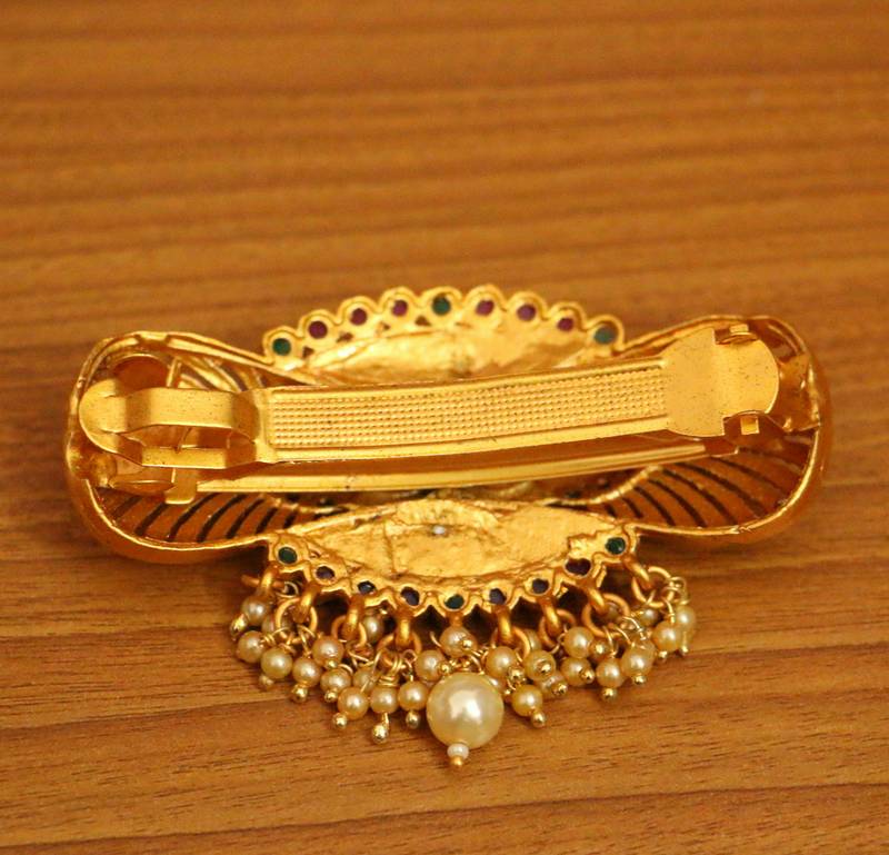 This Pecock Pattern Polki Hairclip Is Handcarfted In Copper Alloy With Imitation Red Green Stone & White Pearl Of Very Fine Quality , The Hairclip Is Light In Weight And Plated With 18kt Matt Gold Rhodium To Give It A Real Gold Look.
