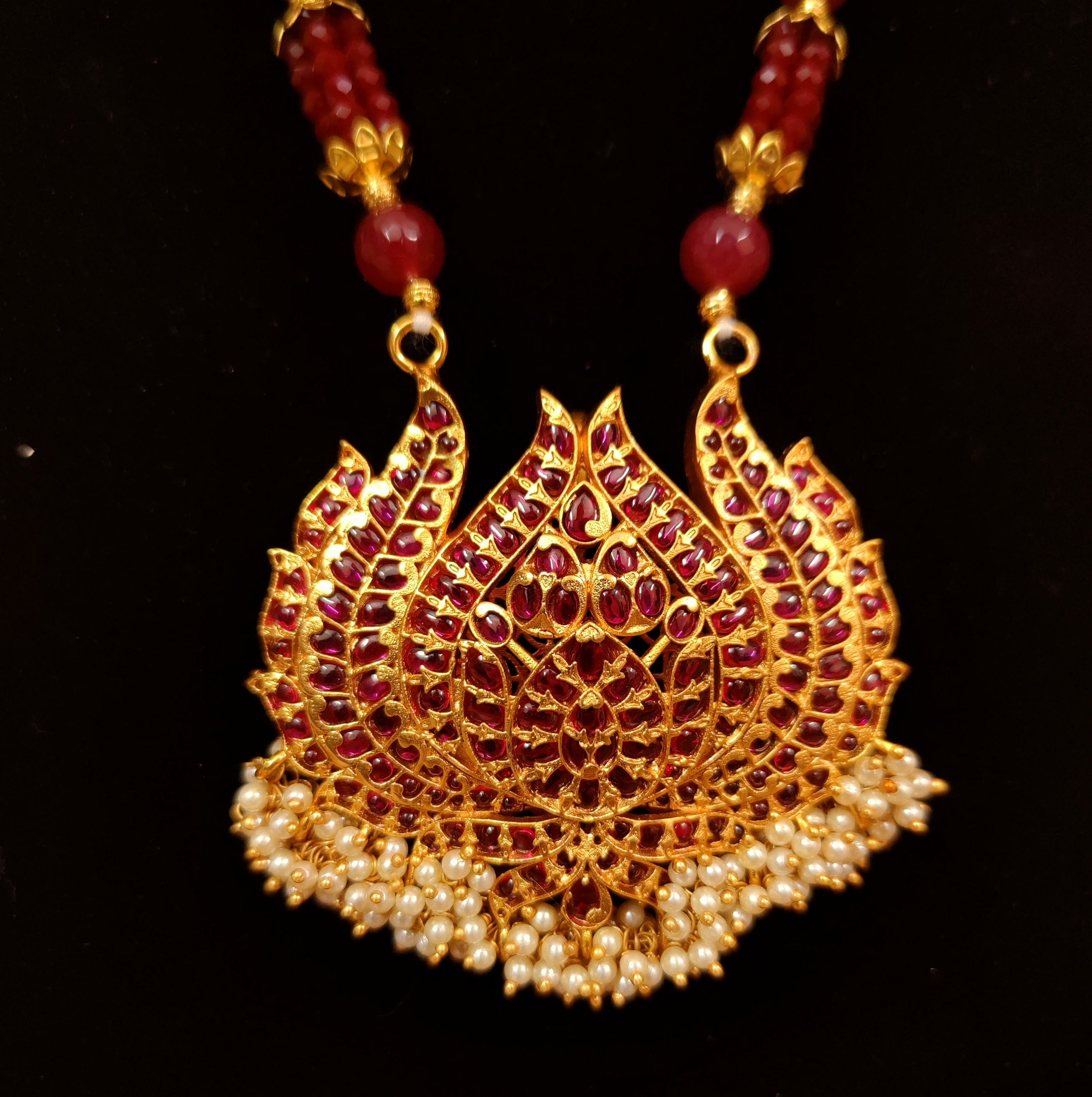 This gorgeous ruby necklace set is handcrafted in copper & silver alloy with imitation swarovski crystal beads, onyx stones, pearls and hand cut kempu stones of very fine quality. This gorgeous necklace set is plated with fine 22kt nickle free gold rhodium that gives the design a real gold look . The necklace comes with a matching pair of jhumka's which are very light in weight.