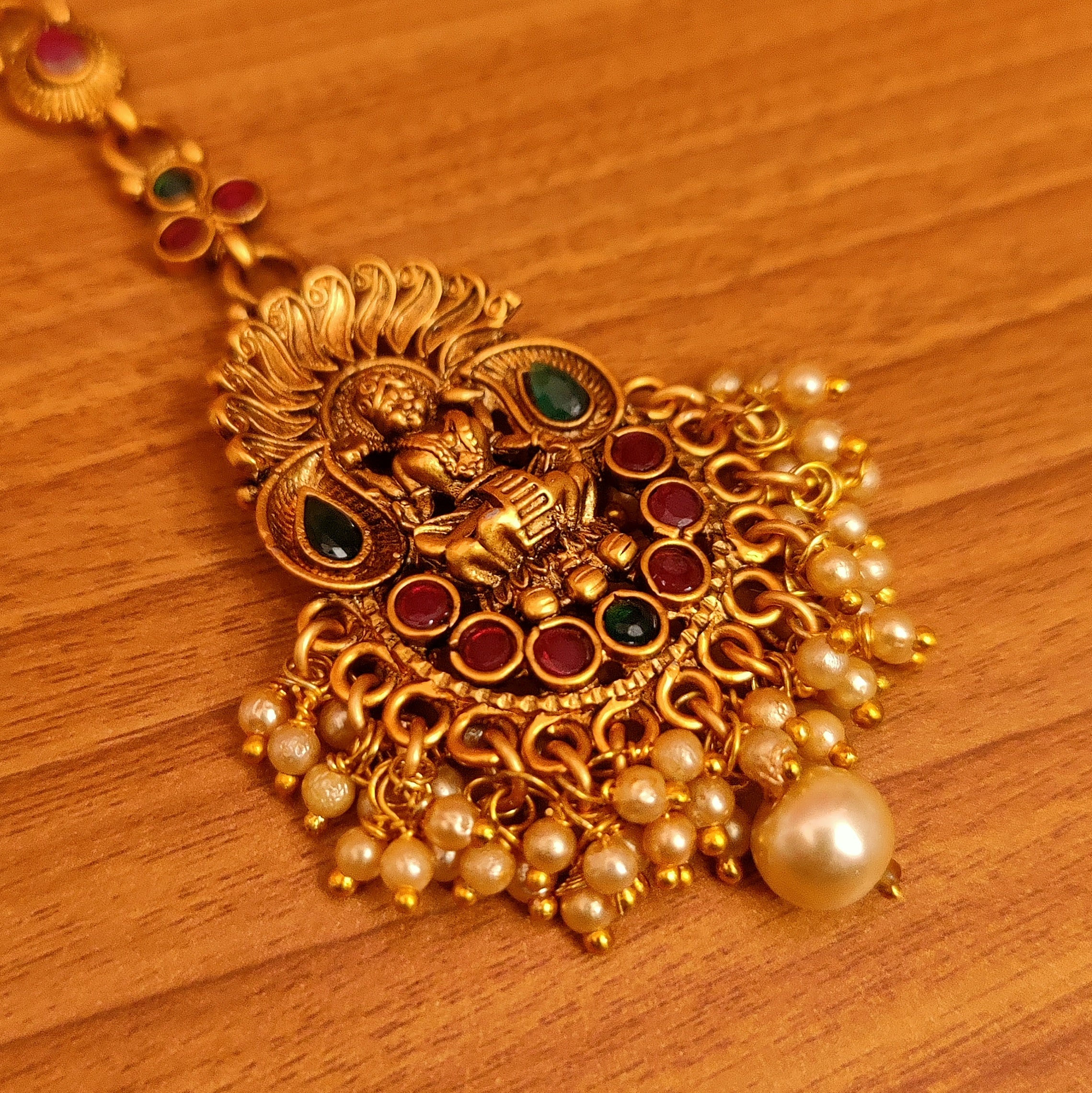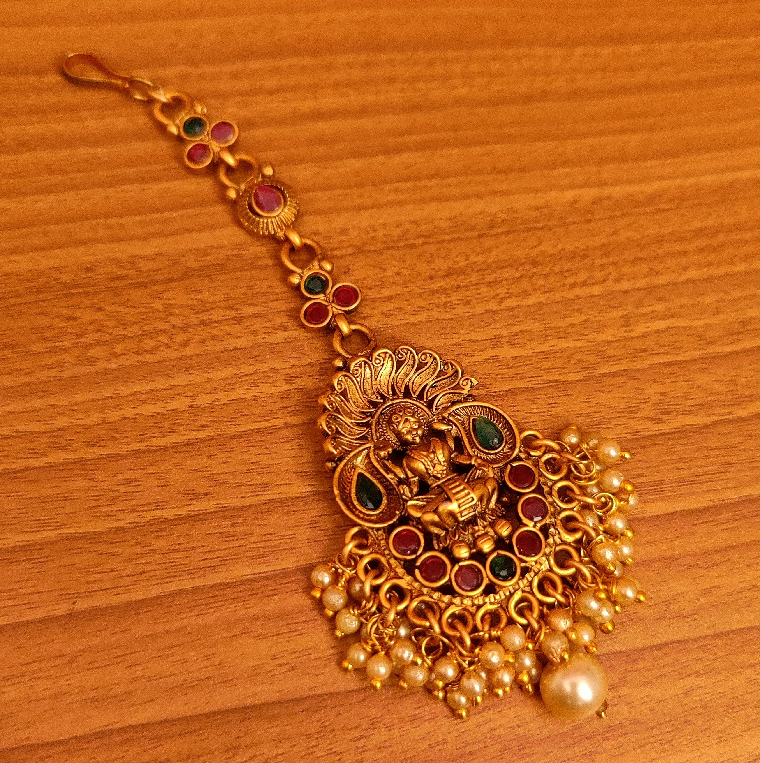 This goddess laxmi maang tikka is handcrafted in matt alloy with imitation red & green colour stone and semi precious pearls of very fine quality . this maang tikka is coated with 18 kt matt gold polish which give it a real look . an absolutely stunning piece to own and is very light in weight.