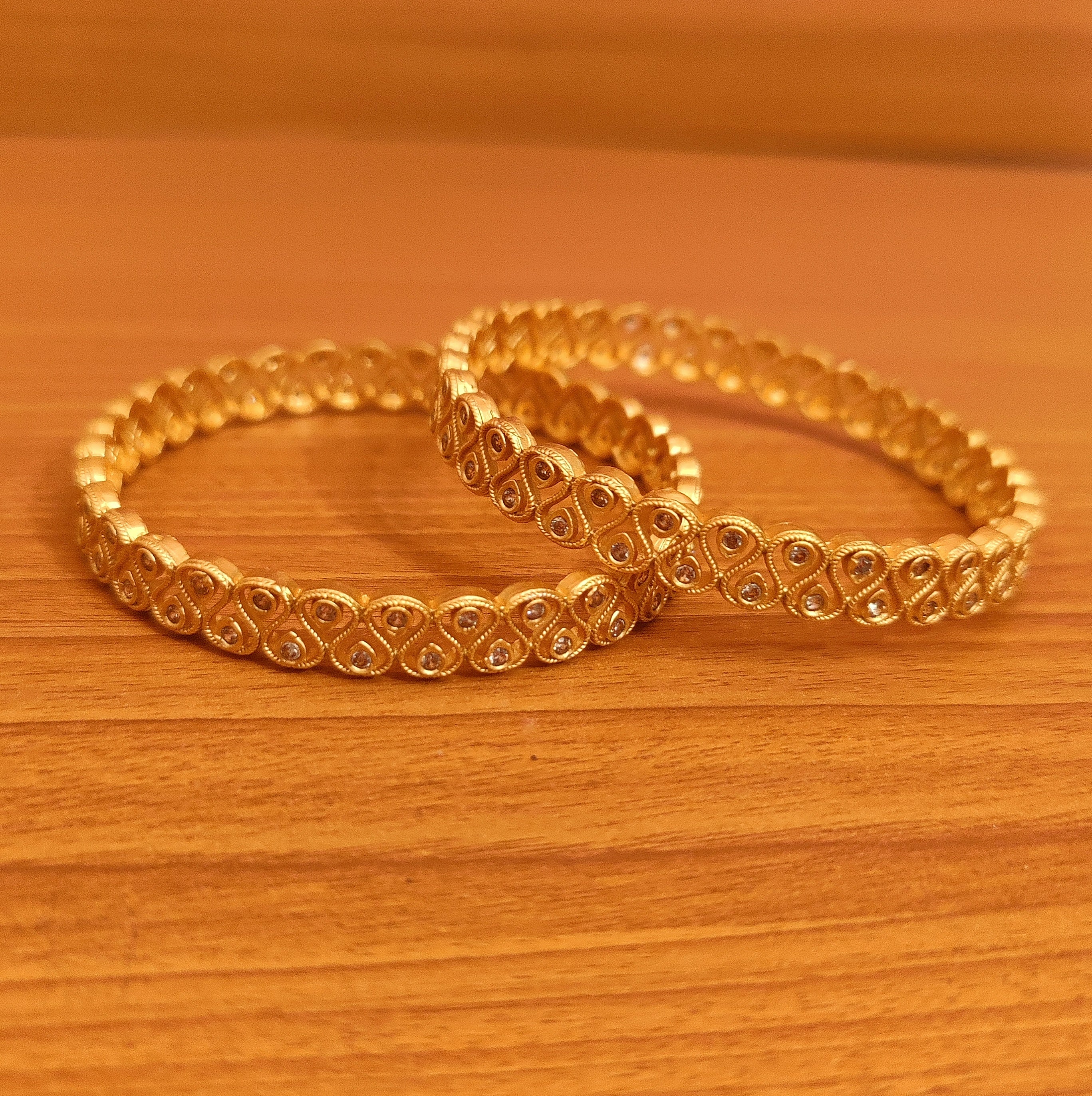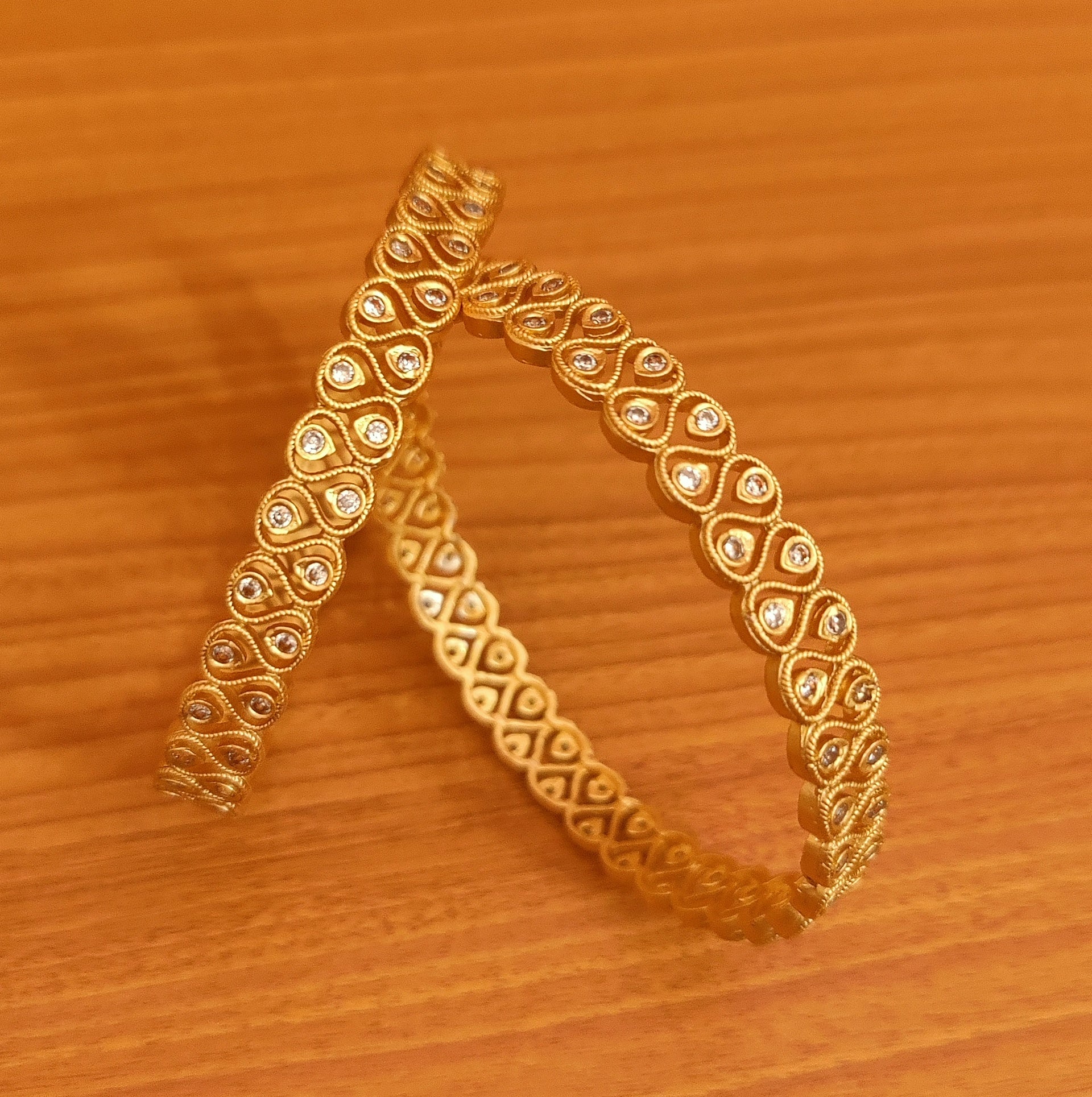 These matt gold look bangless are handcrafted in copper alloy with imitation zircon of fine quality. These artistic yet modern bangless are plated with fine nickle free matt gold rhodium to avoid any allergies to the skin.