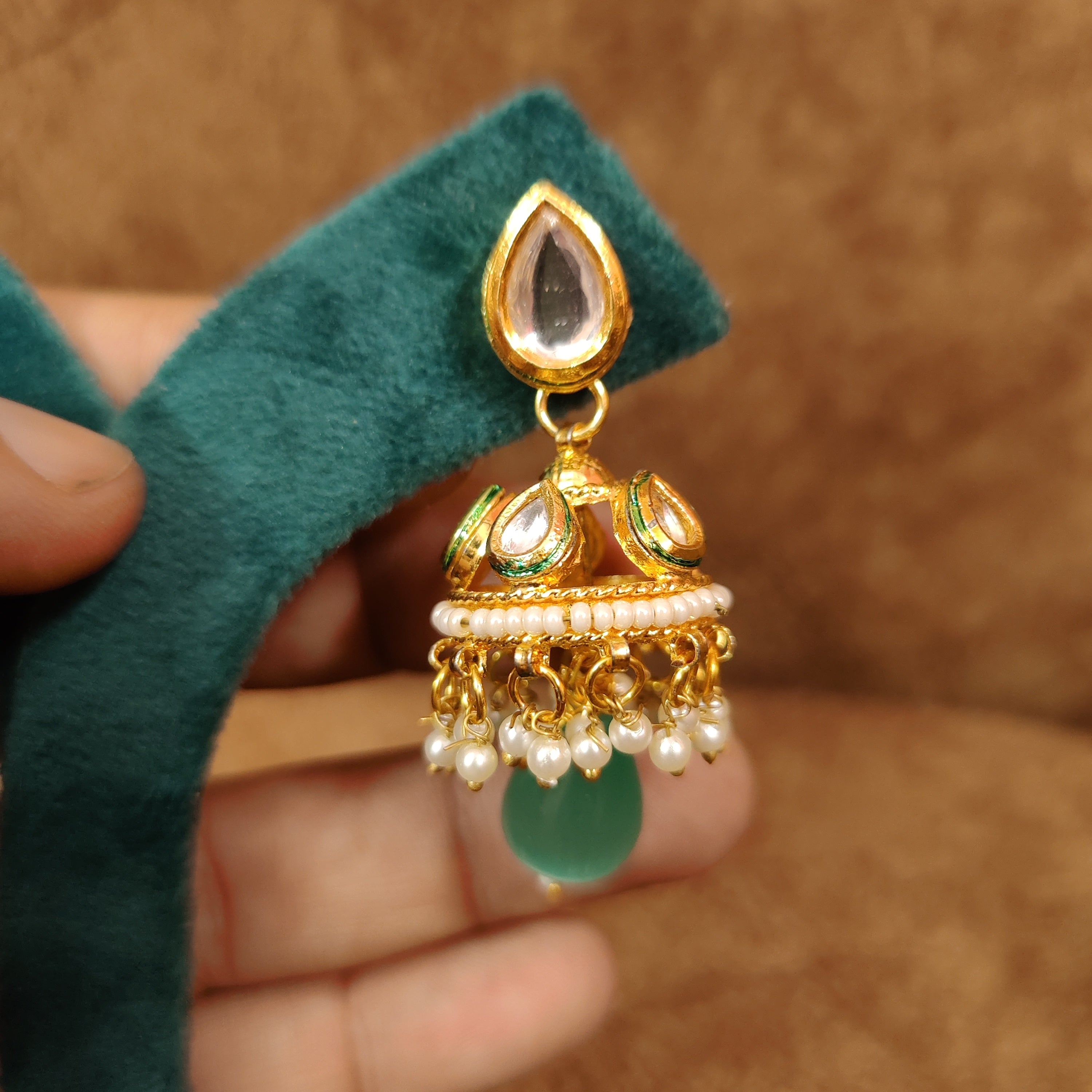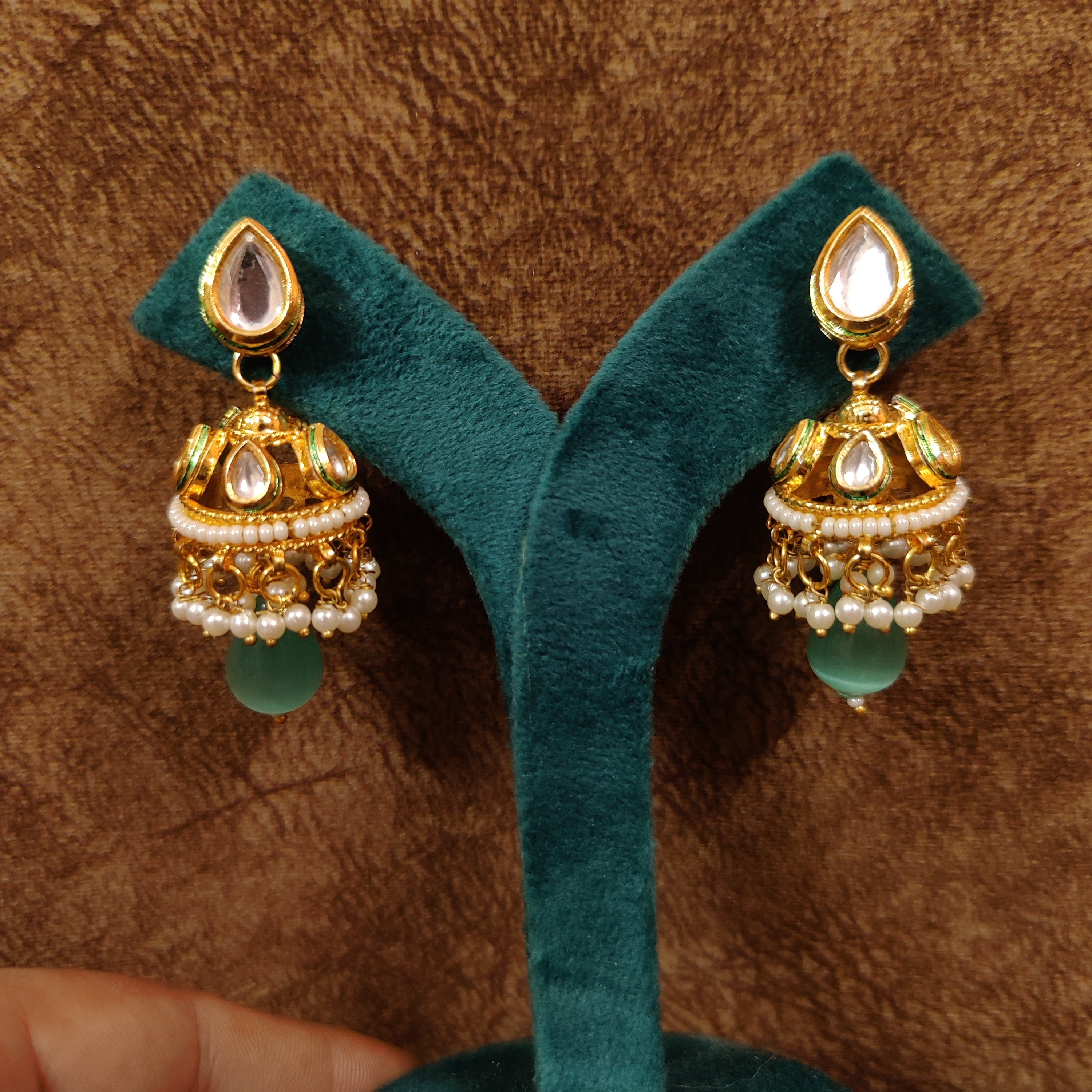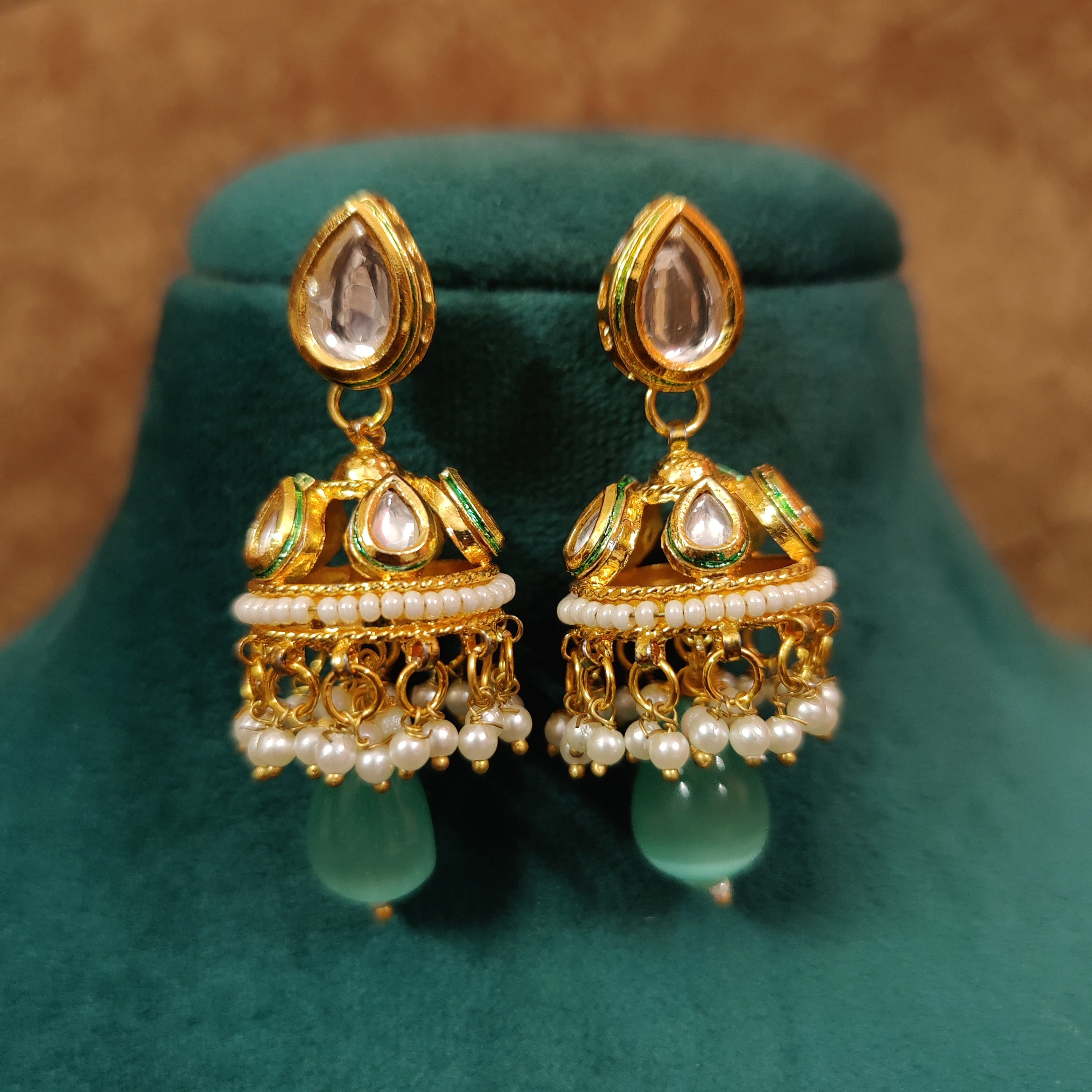 These beautiful earrings are handcrafted in brass alloy with imitation pearl & kundan with meenakari work of very fine quality. These earrings are coated with 18 kt gold polish which give them a unique look . An absolutely stunning piece to own and are very light in weight.