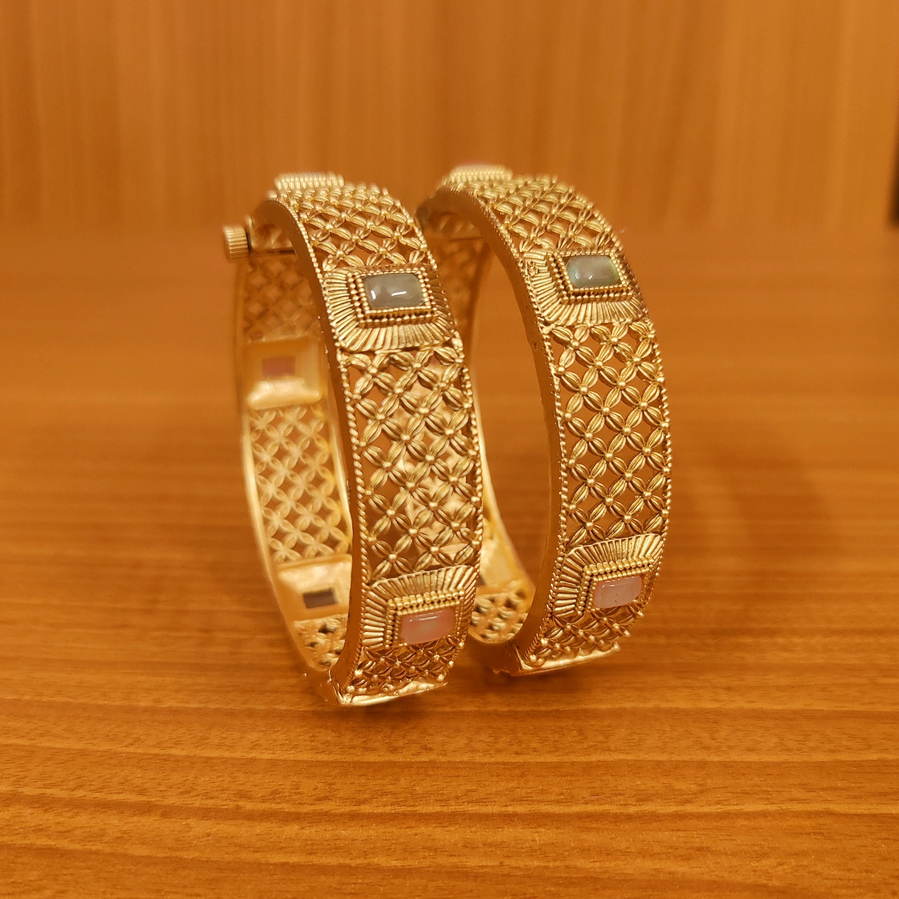 These beautiful royal matt gold bangles are handcrafted in copper alloy with imitation mint green & pink colour stones with fine hand carved motifs of very fine quality. These bangles are coated with 22 kt matt gold rajwadi plating that gives a real look to the design and these openable bangles comes with a set of 2 bangles.