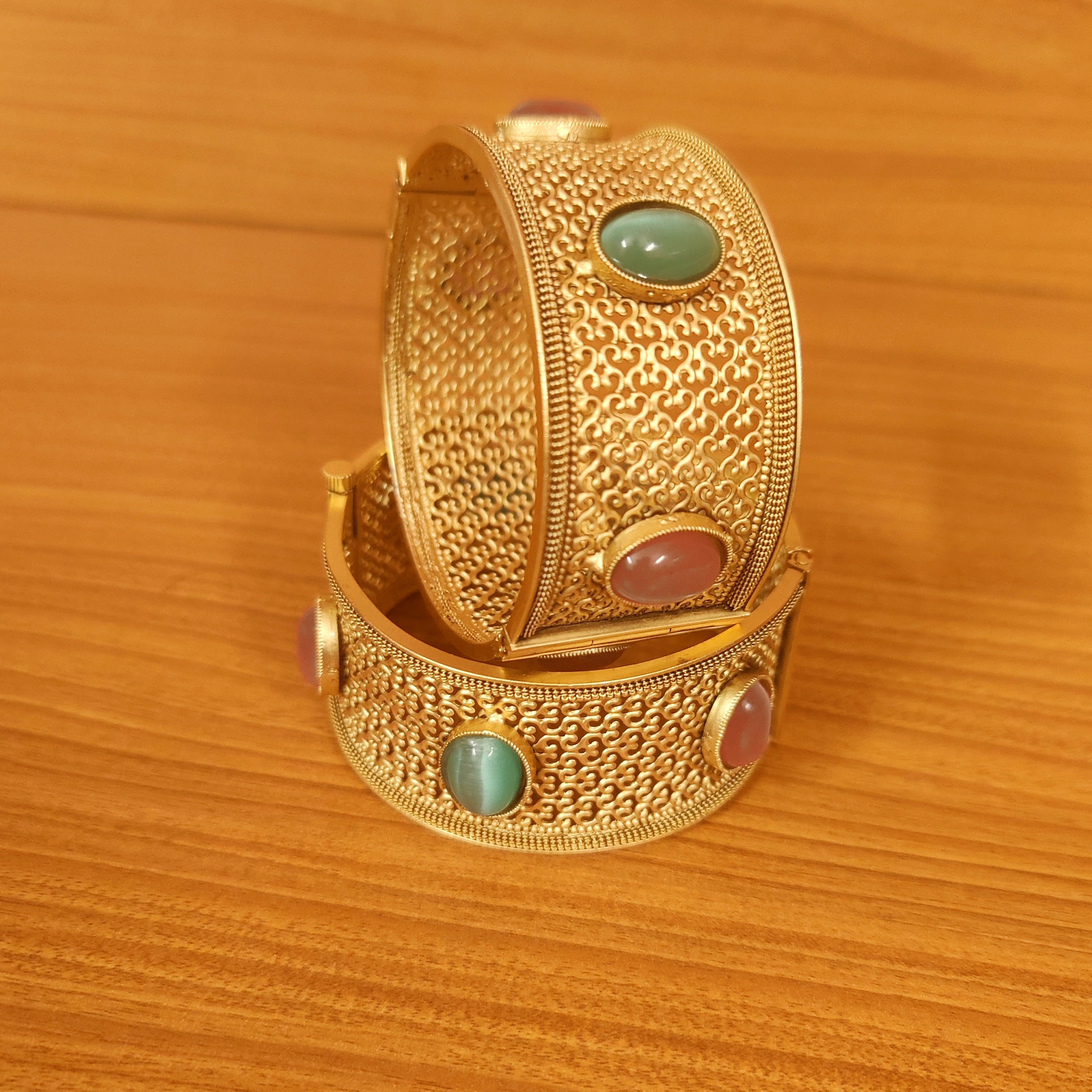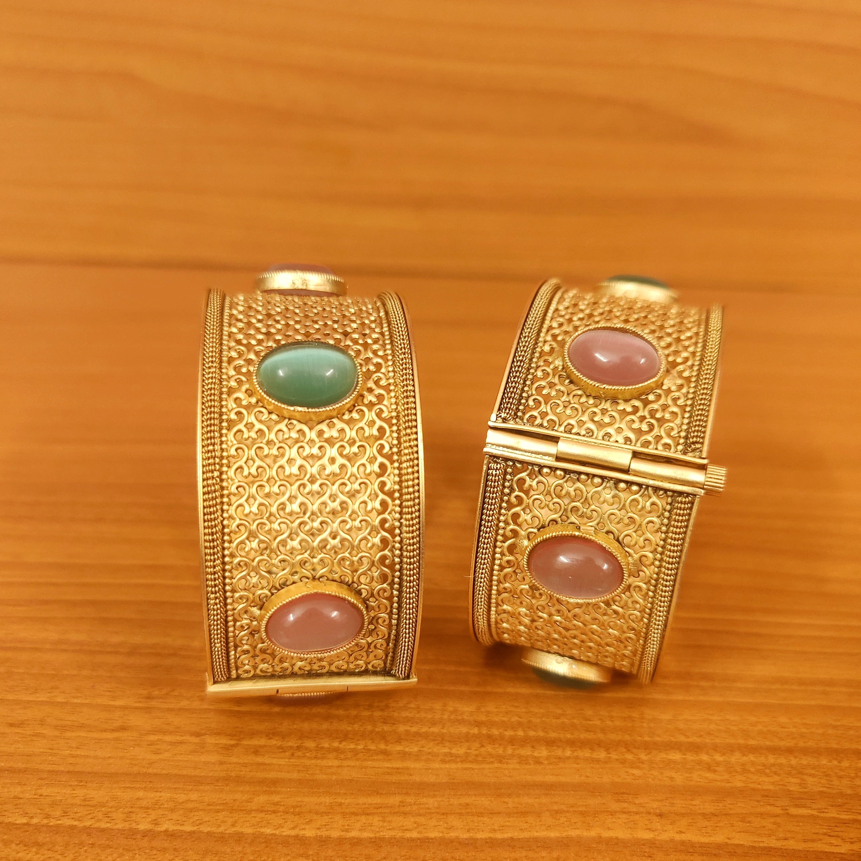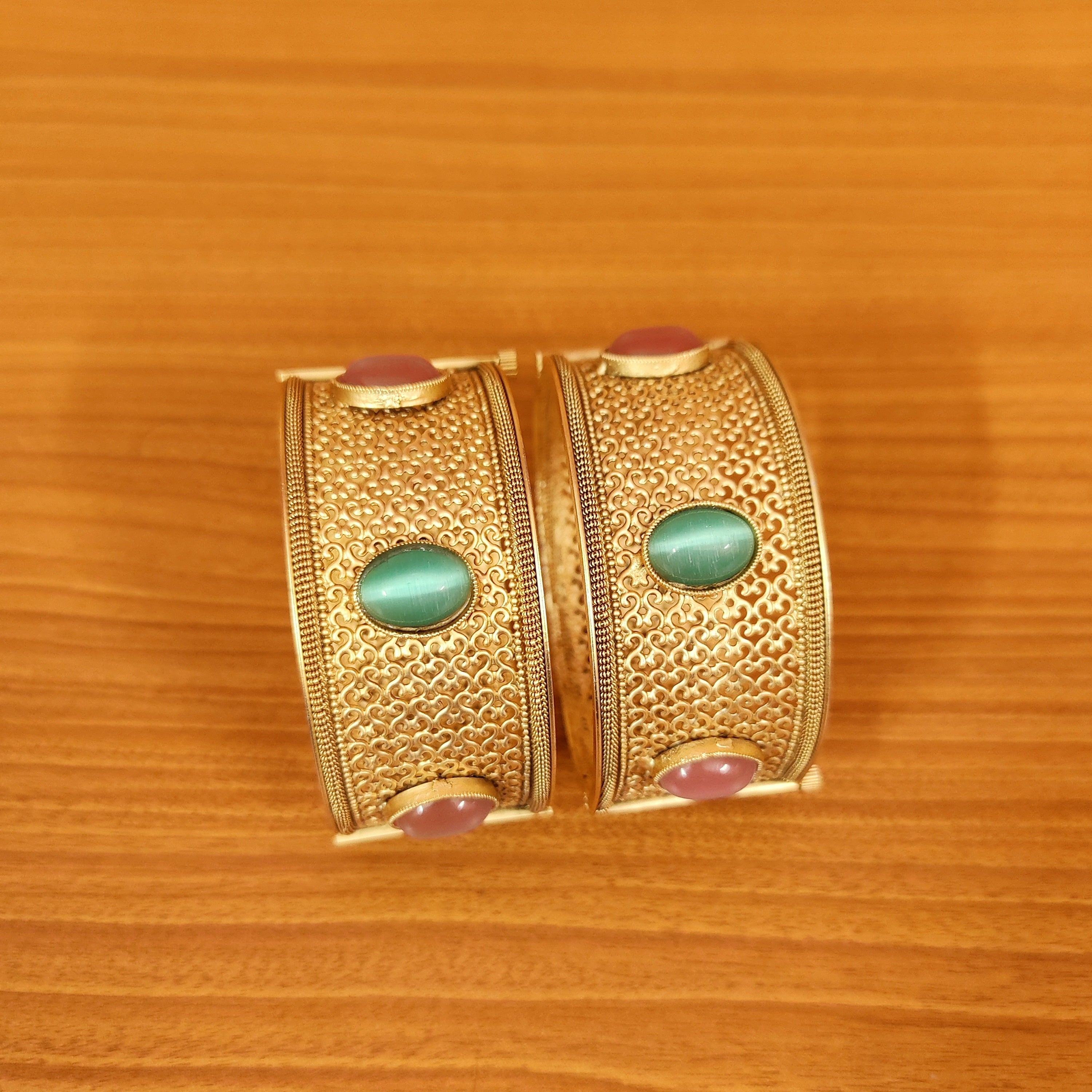 These beautiful matt gold bangles are handcrafted in copper alloy with imitation mint green & pink colour stones with fine filigree work of very fine quality. These bangles are coated with 22 kt matt gold rajwadi plating that gives a real look to the design and these openable bangles comes with a set of 2 bangles.