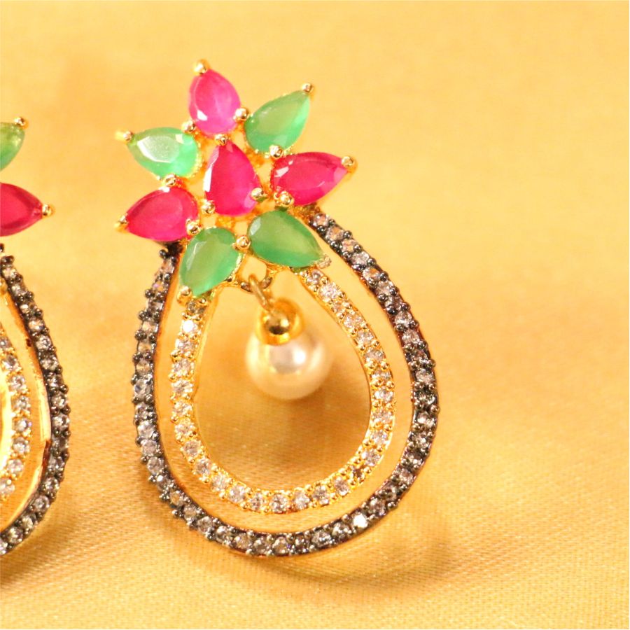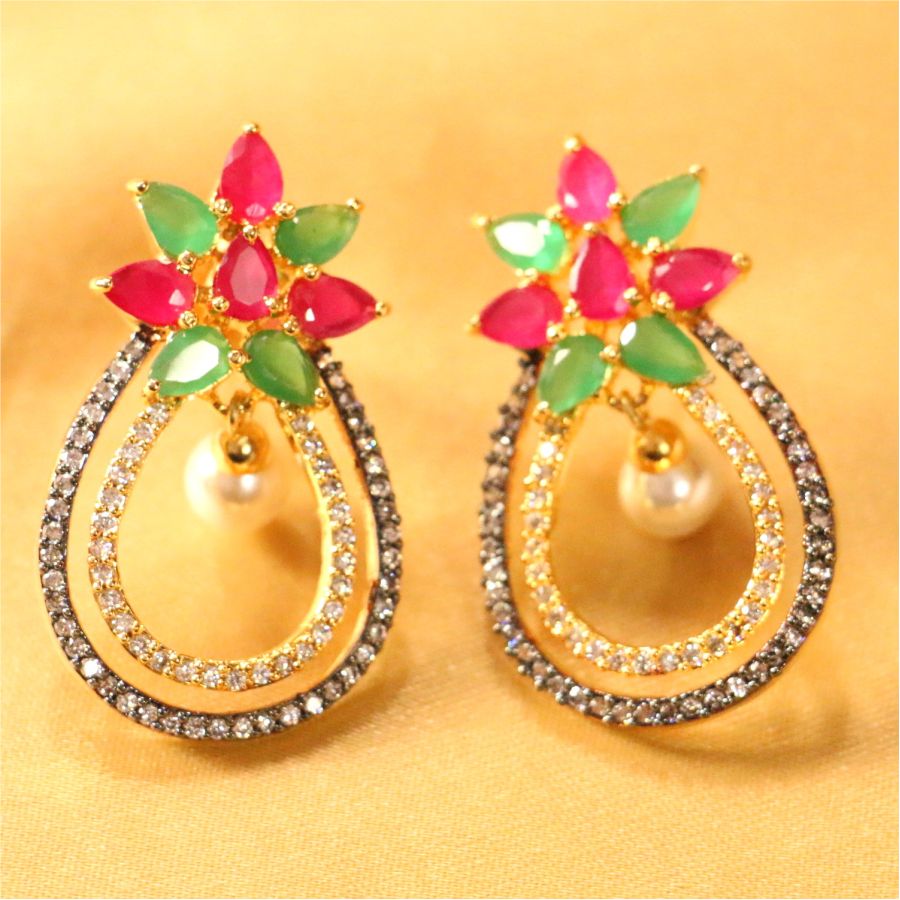 These beautiful Earrings are handcrafted in silver alloy with imitation American diamond,Pearl and semi precious stones of very fine quality. These earrings are coated with 18 kt gold polish which give them a unique look . An absolutely stunning piece to own and are very light in weight.