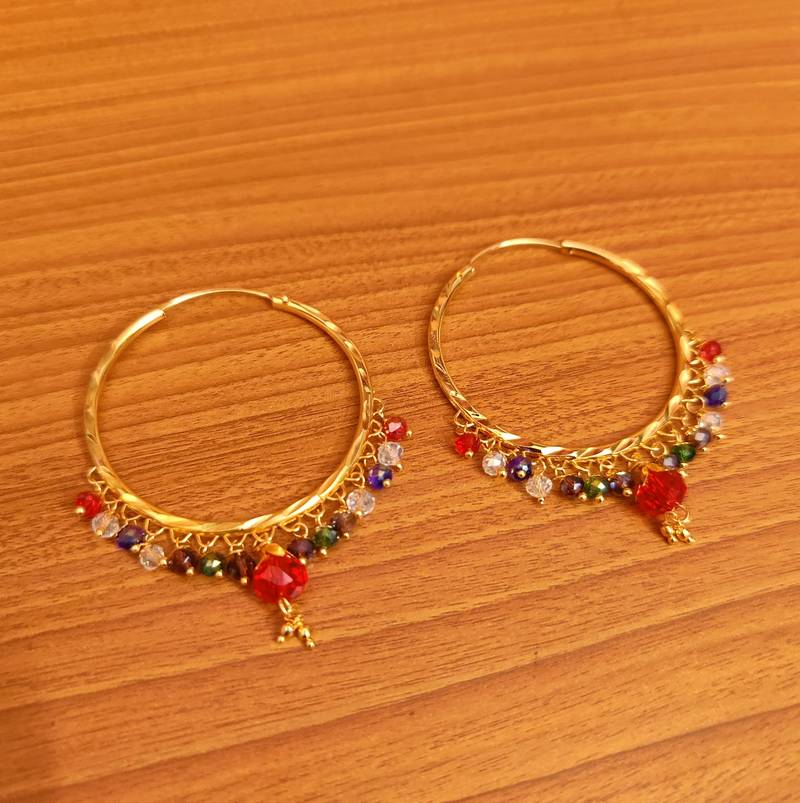 These Hoops Are Handcrafted In Copper Alloy With Imitation Multicolour Swarovski Crystal Beads Of Very Fine Quality. These Artistic Yet Modern Hoops Are Plated With High Quality Gold Rhodium. The Earrings Are Very Light In Weight.