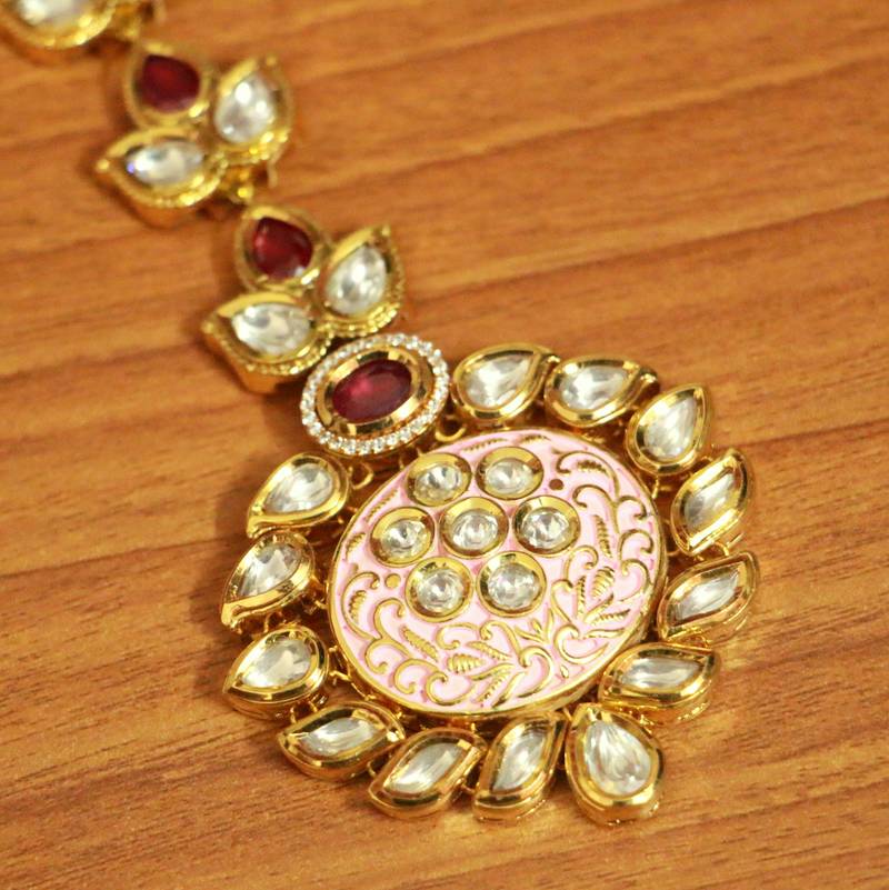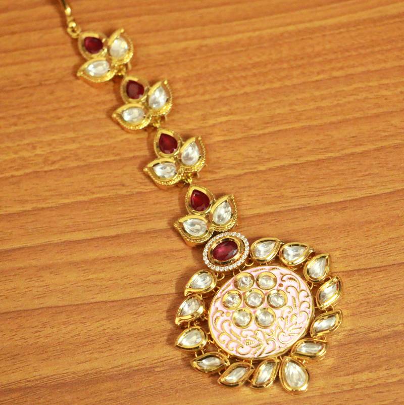 This Bridal Maang Tikka Is Handcrafted In Silver Alloy With Fine Kundan Stones And Imitation Ruby Stones Of Fine Quality , The Maang Tikka Is Very Light In Weight And Is Plated With 18 Kt Gold Plating To Give It A Real Look.