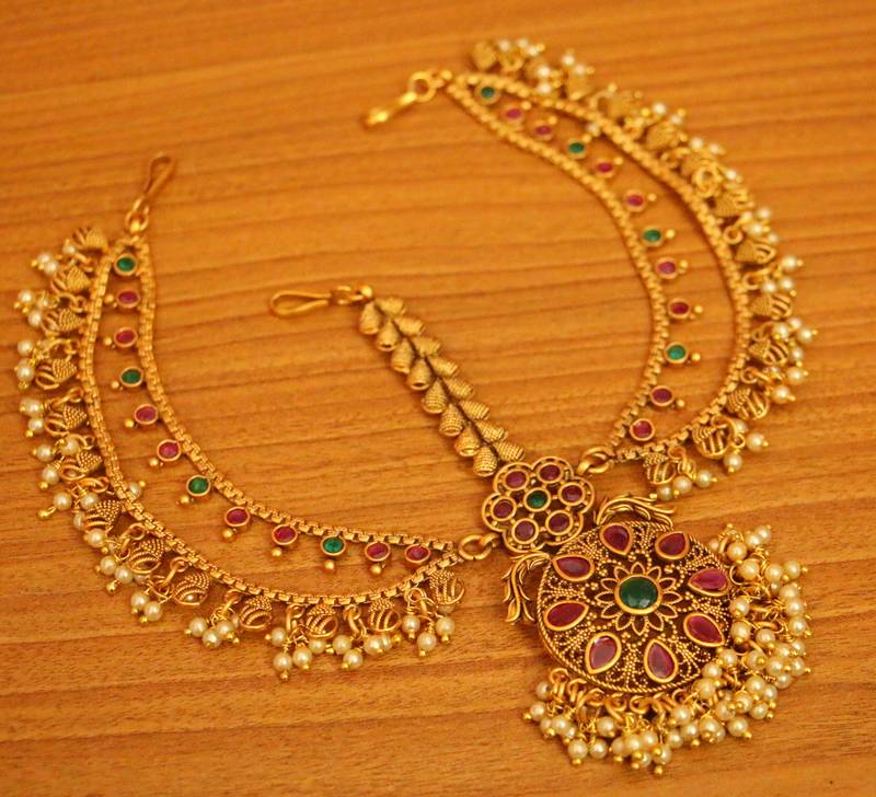 This Gold Look Bridal Mathapatti Is Handcarfted In Copper Alloy With Imitation Red, Green And Semi Precious White Pearls Of Very Fine Quality , The Mathapatti Is Light In Weight And Plated With 18kt Matt Gold Rhodium To Give It A Real Gold Look.