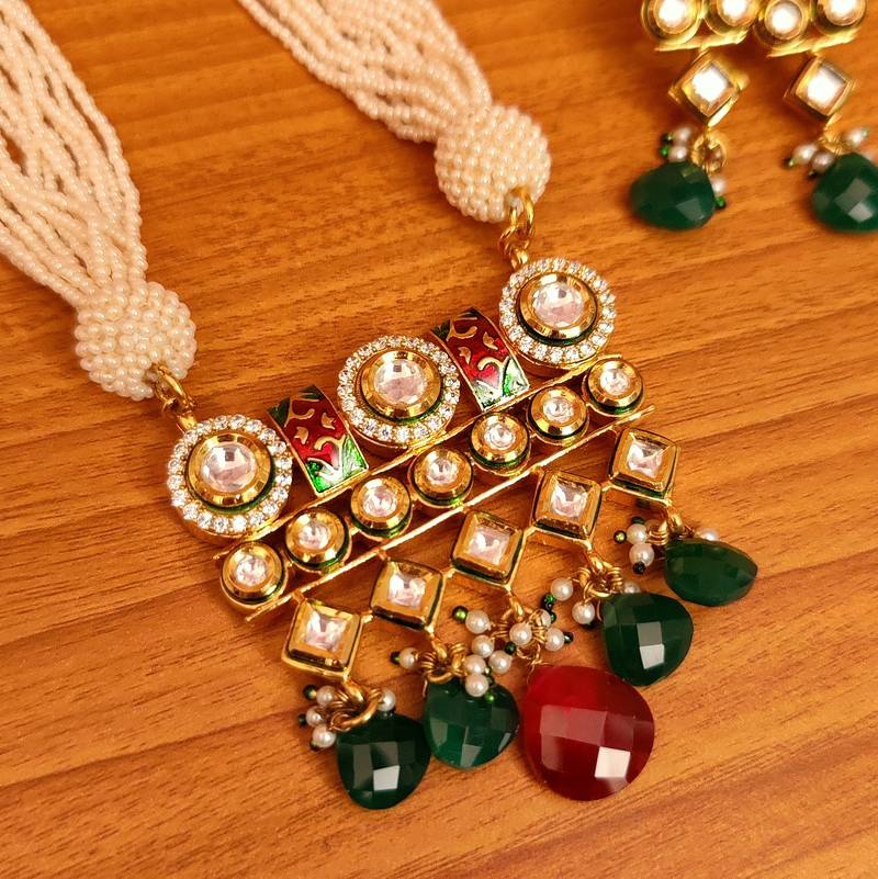 This kundan polki Necklace Set Is Handcrafted In brass Alloy With Imitation red & green colour beads and cz stone Of very Fine Quality , The Necklace Set Is Plated In 18kt Gold Plating And The Design Itself Is Perfect For Wedding Attires.