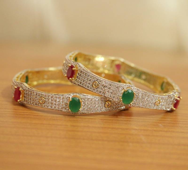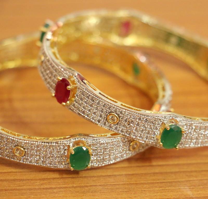 These bangles are handcrafted in silver & brass alloy with imitation red ruby, green onyx & cz stones of very fine quality. These artistic yet modern bangles are plated with fine nickle free gold rhodium to avoid any allergies to the skin.