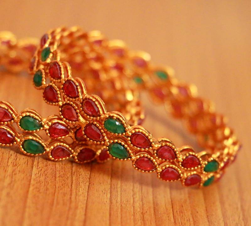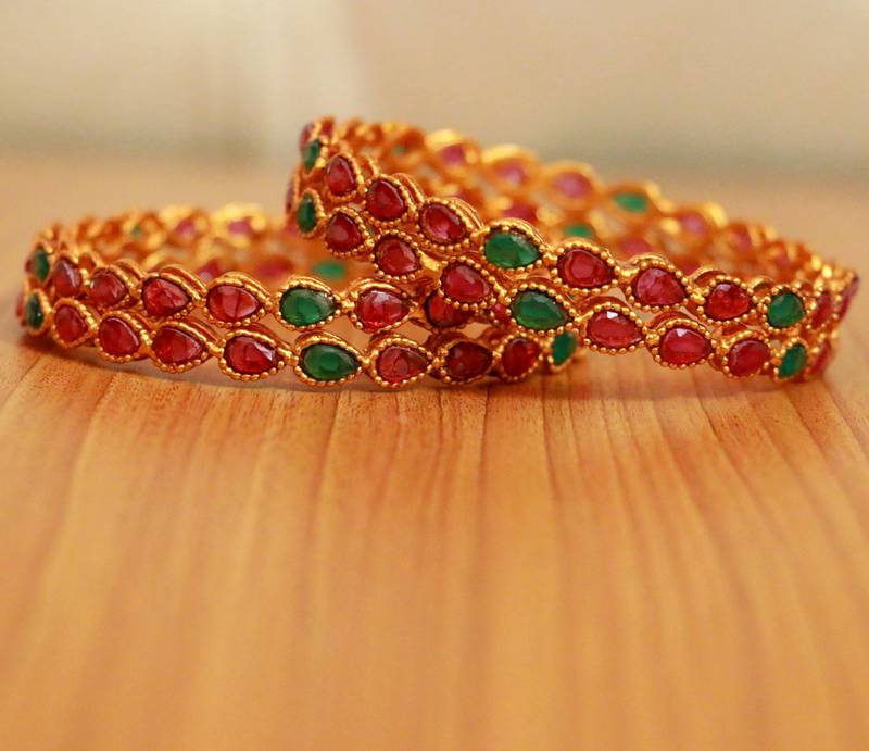 These bangles are handcrafted in copper alloy with imitation red & green colour stone of very fine quality. These artistic yet modern bangles are plated with fine nickle free gold rhodium to avoid any allergies to the skin.