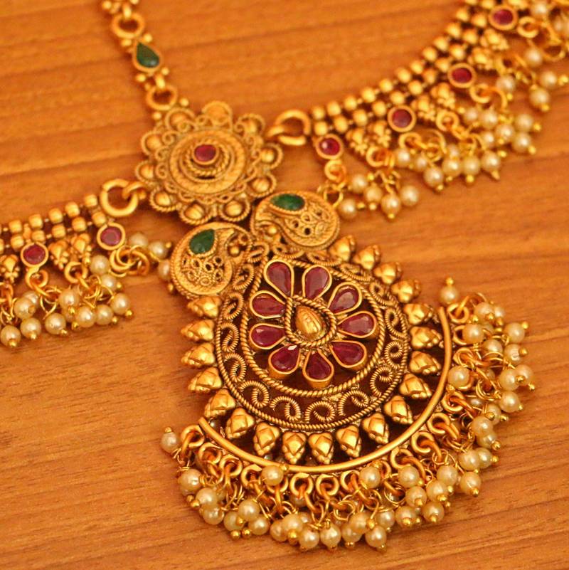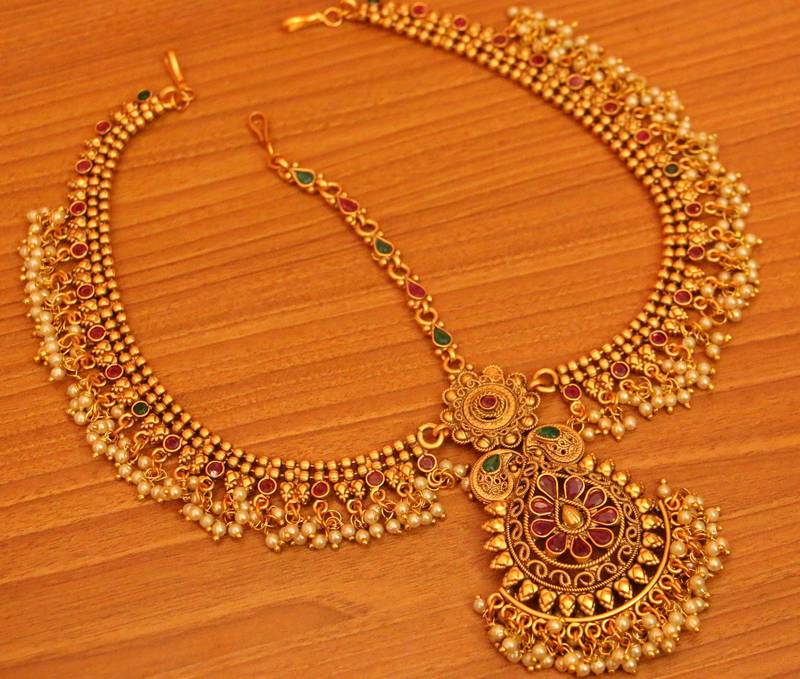 This Matt Gold Look Bridal Mathapatti Is Handcrafted In Copper Alloy With Imitation Coloures Stones And Pearls With 18kt Fine Gold Plating . This Mathapatti Is Very Light In Weight And Gives You A Real Gold Look. An Absolutely Stunning Piece To Own And Are Very Light In Weight.