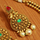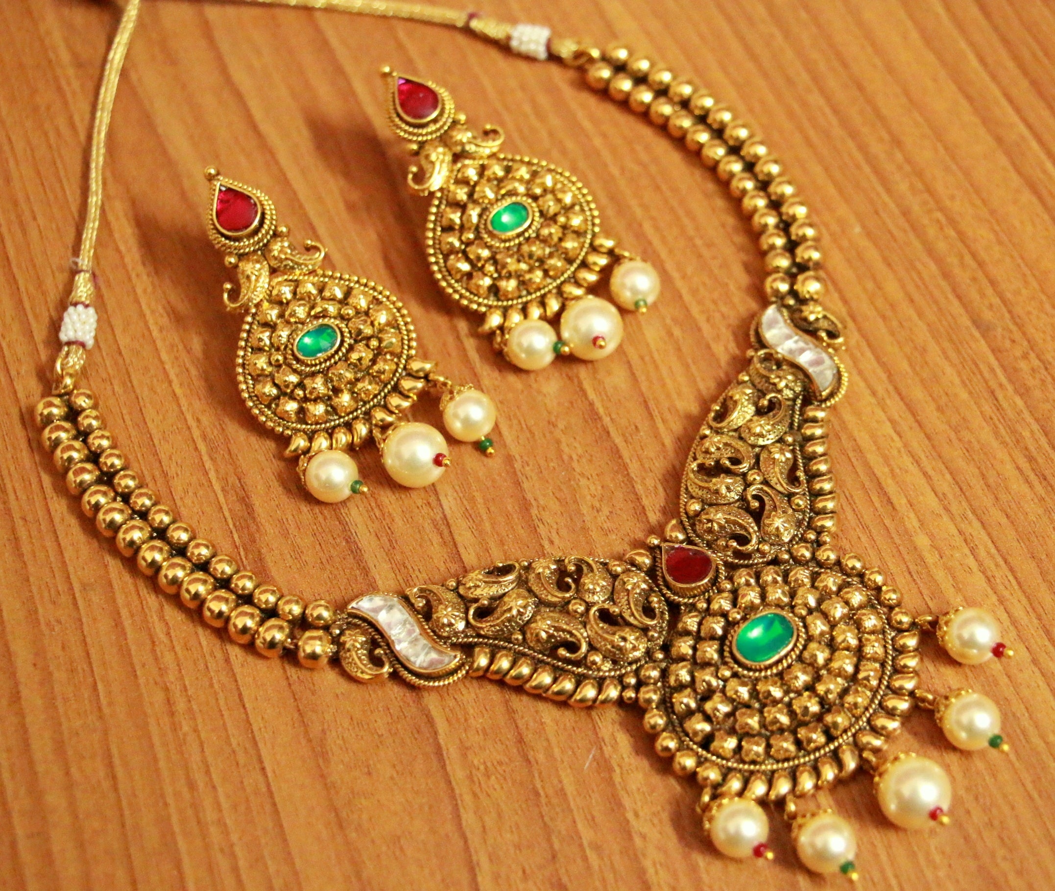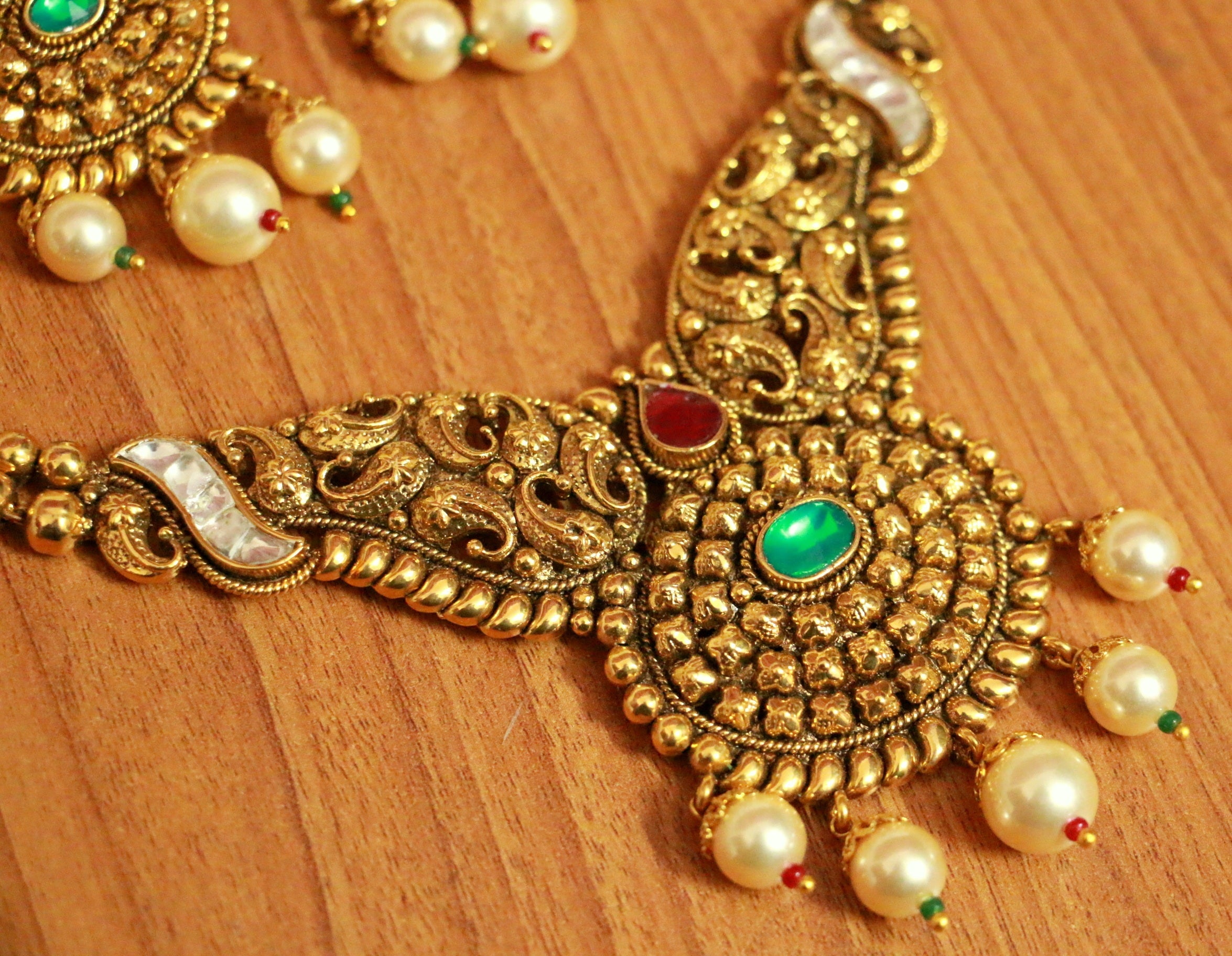 This beautiful necklace set is handcrafted in brass alloy with imitation pearls,kundan & polki work of very fine quality . This neckace set is coated with 18 kt gold polish which give them a unique look . An absolutely stunning piece to own and are very light in weight.