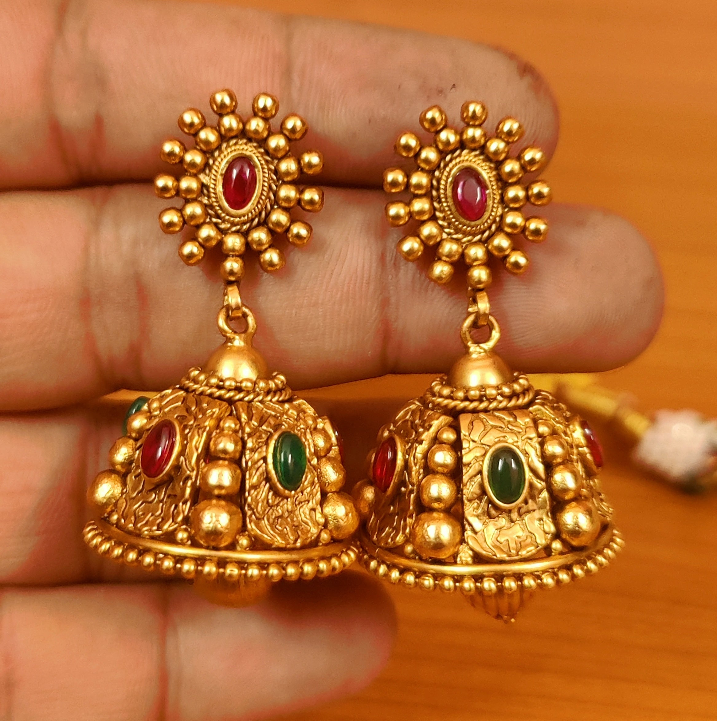 This beautiful necklace set is handcrafted in copper alloy with imitation red & green colour stone and gold polki work of very fine quality . this necklace set is coated with 18 kt gold rhodium plating that gives a real gold look . an absolutely stunning piece to own and are light in weight.