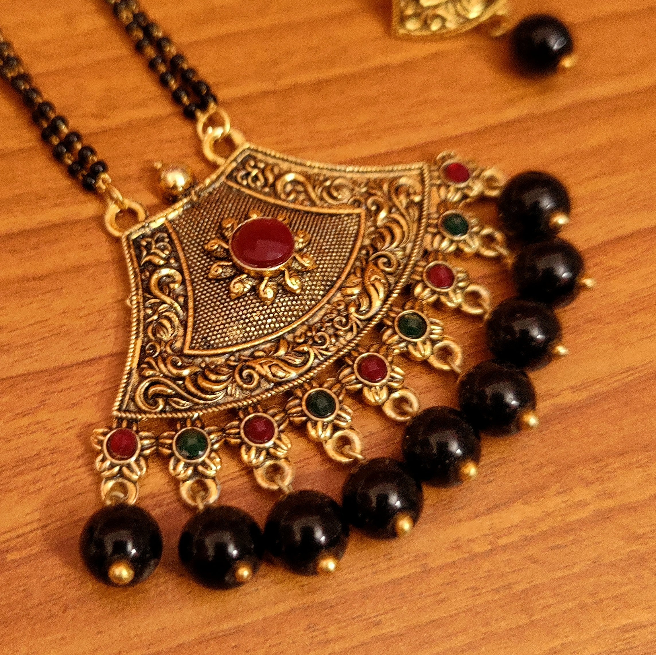 This beautiful antique gold polki mangalsutra is handcrafted in copper alloy with imitation red & green colour stone and black colour beads of very fine quality , this mangalsutra is coated with 18 kt nickle free antique gold plating to avoid skin allergies and its very light in weight .