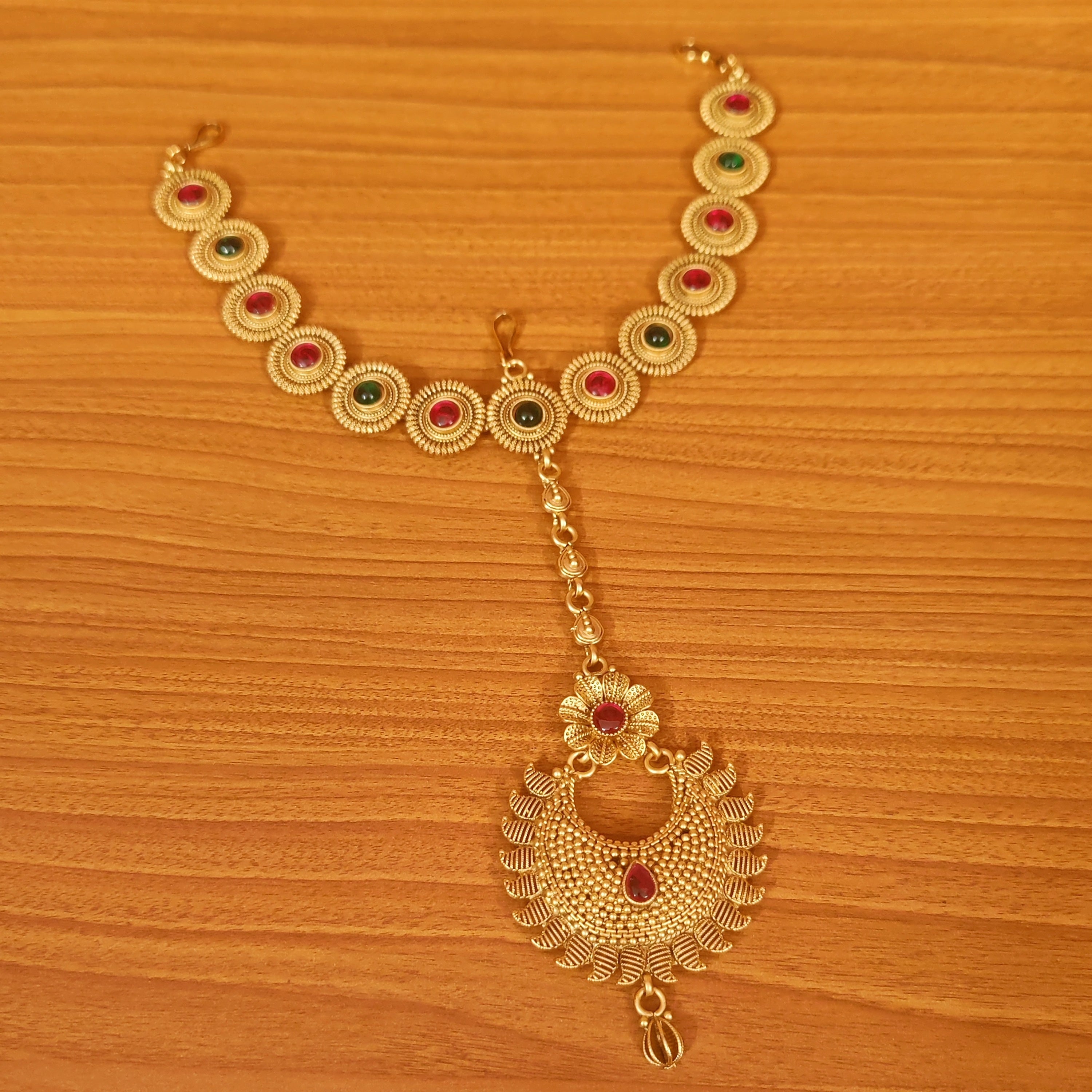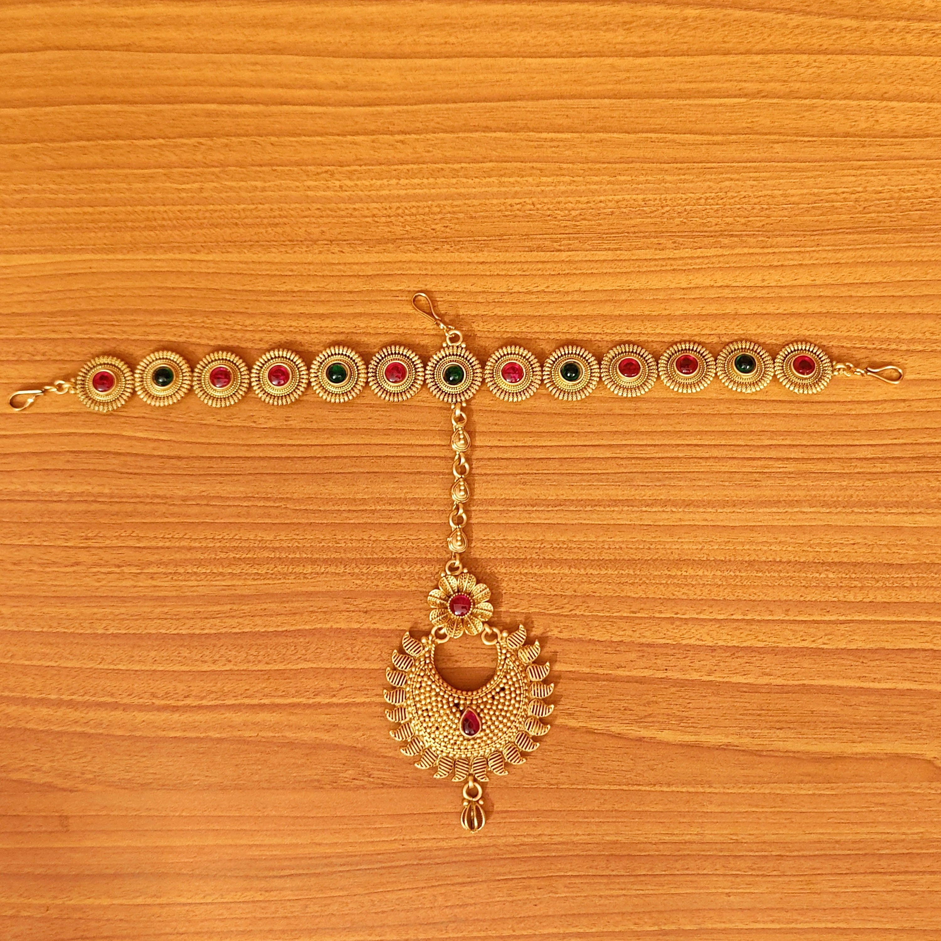 This antique gold look mathapatti is made in copper alloy with imitation red & green colour kempu stones of very fine quality. This gorgeous wedding mathapatti is handcrafted to perfection with intricate hand carvings and gold motifs. This mathapatti is plated with 22kt nickle free matt gold rhodium that gives the design a real gold look and is perfect for bridal wear.