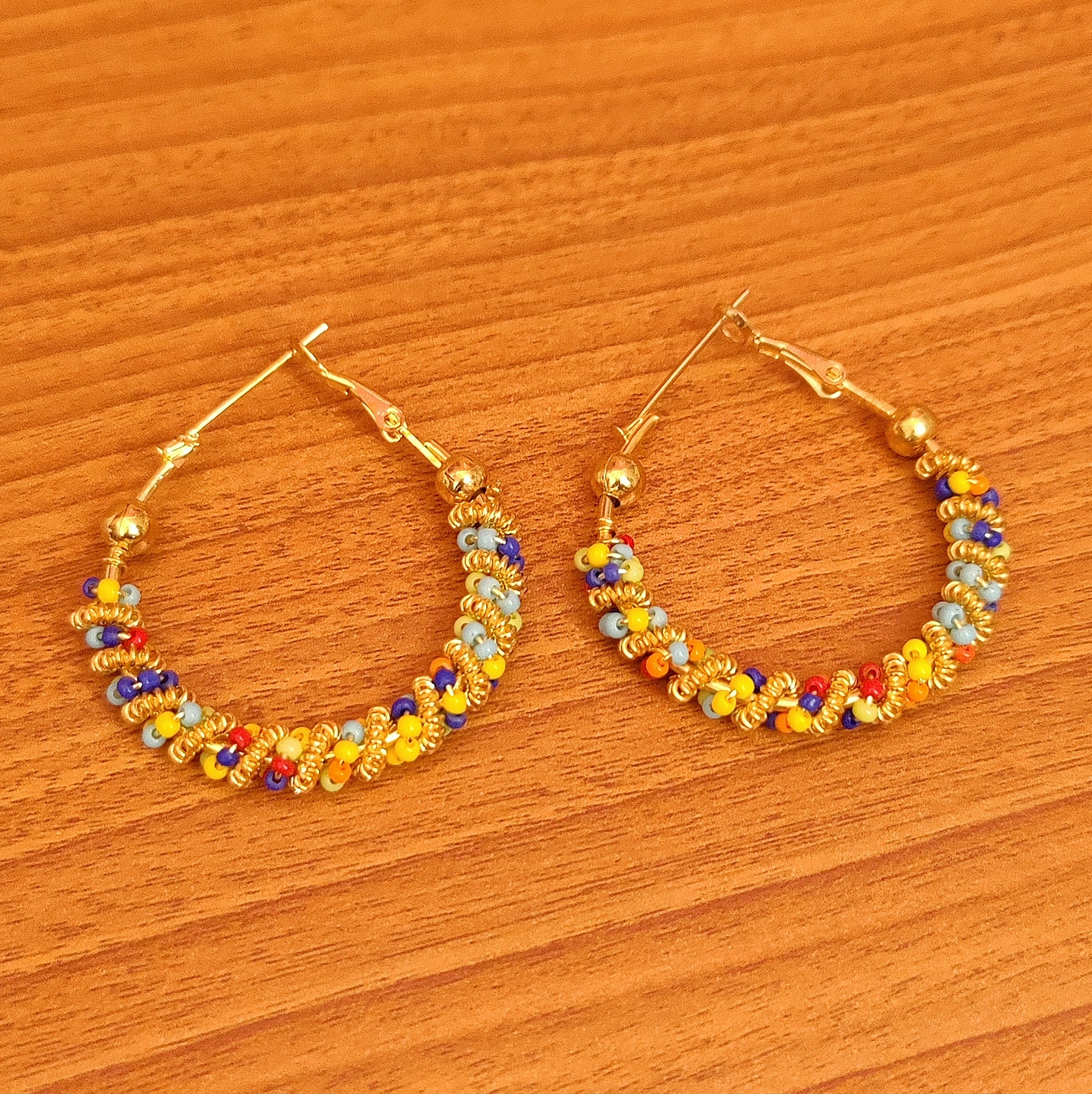 These hoops are handcrafted in brass alloy with imitation semi precious multi colour pearls of very fine quality. these artistic yet modern hoops are plated with high quality gold rhodium. the earrings are very light in weight.