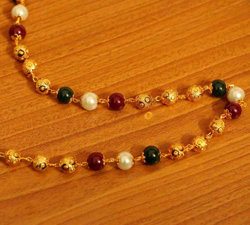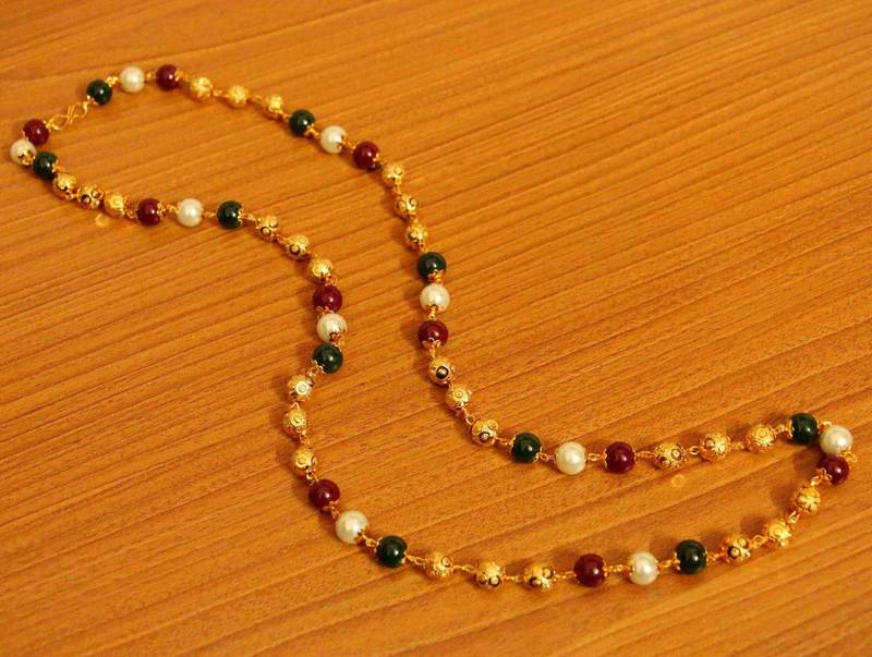 This beautiful necklace is handcrafted in copper alloy with imitation pearls,ruby,green onyx and polki work of very fine quality . This necklace is coated with 18 kt gold polish which give them a unique look . An absolutely stunning piece to own and are very light in weight.