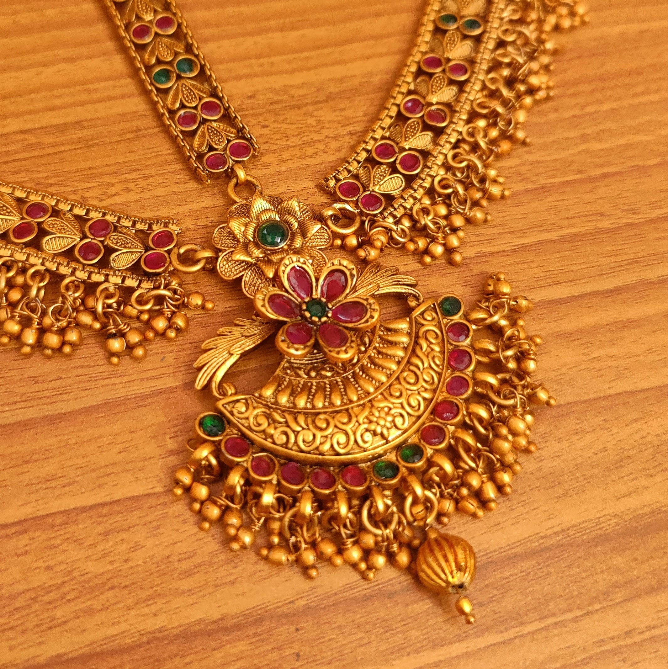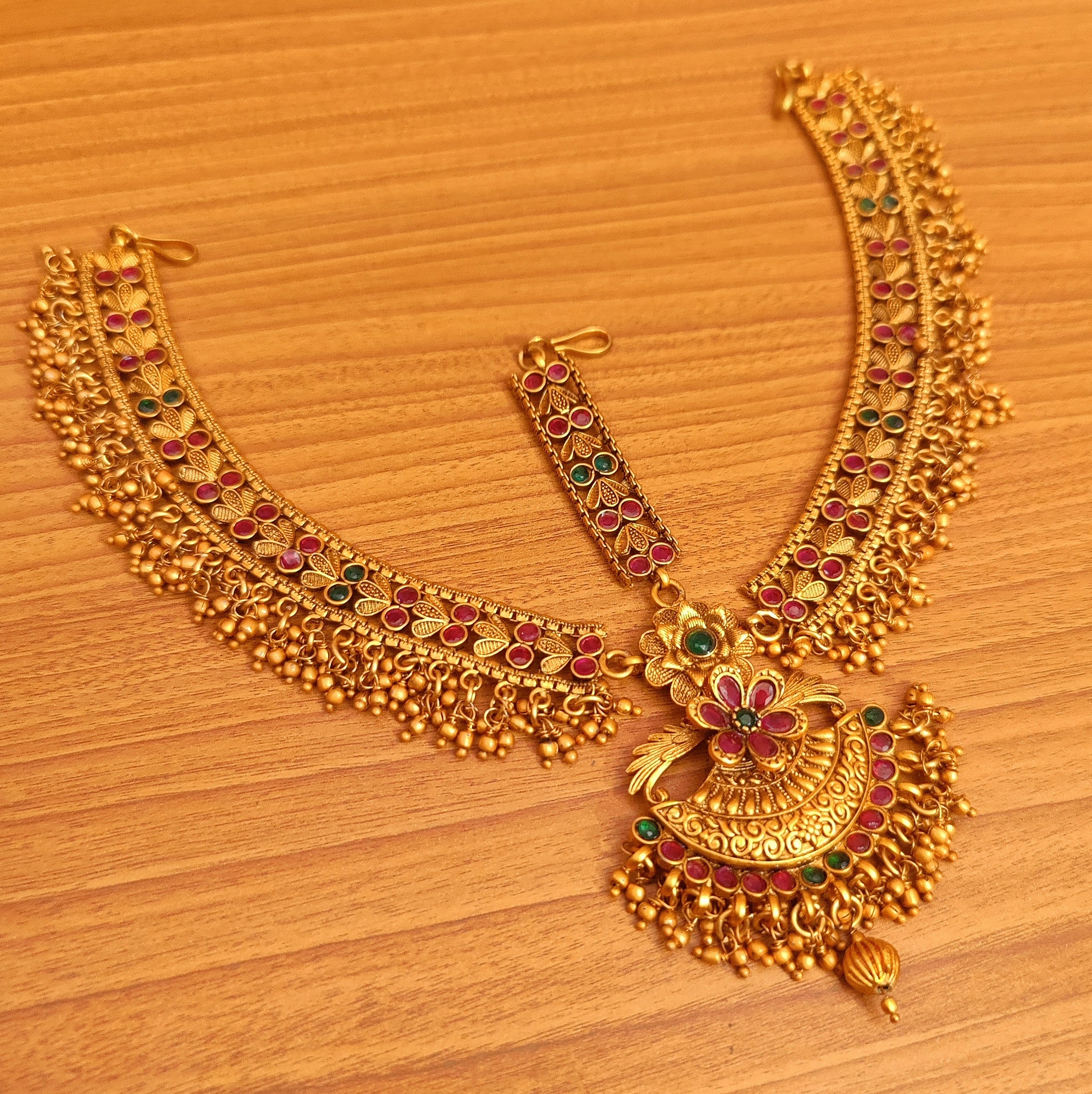 This mathapatti is handcrafted in copper alloy with 18kt fine gold plating and red & green colour stone & semi precious gold beads of very fine quality. this mathapatti is very light in weight and gives you a real gold look. an absolutely stunning piece to own and are very light in weight.