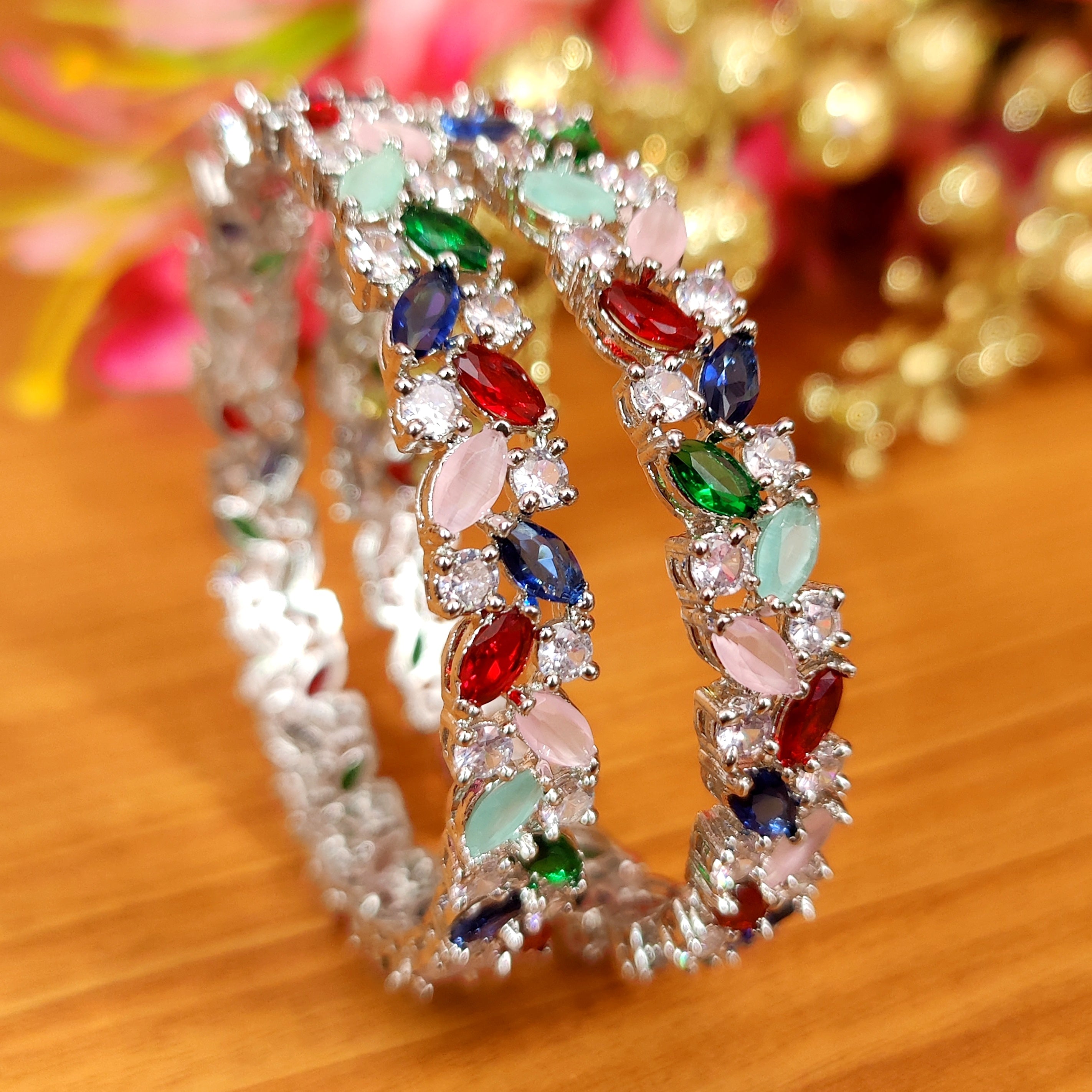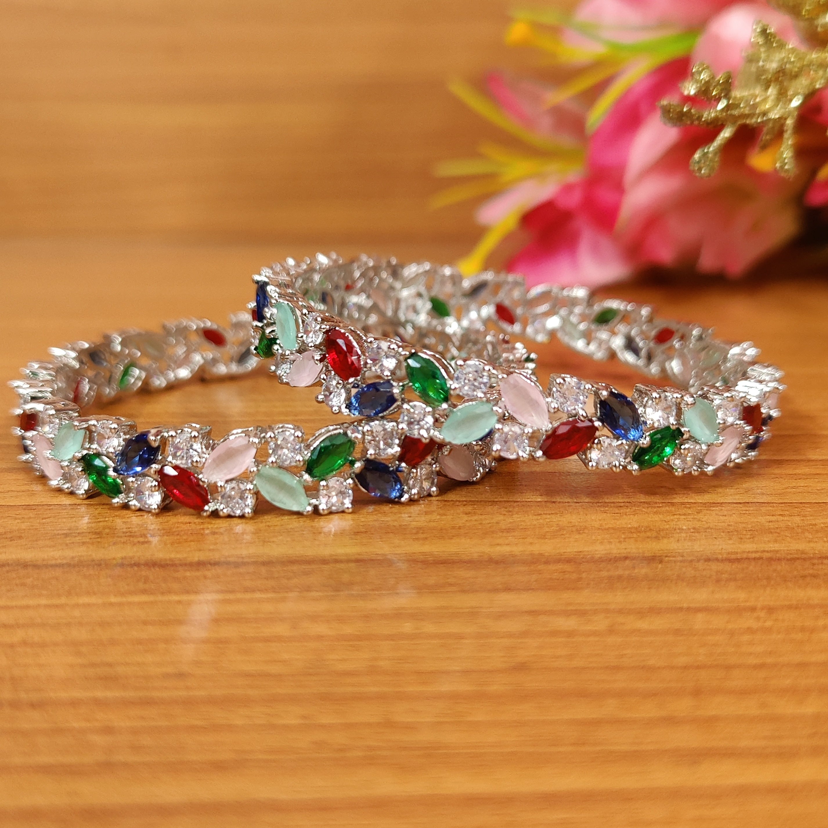 Add a burst of vibrant charm with the Multicolour CZ Studded Silver Look Bangles from Sanvi Jewels. These stunning bangles feature multicolored cubic zirconia stones beautifully set in a sleek silver-look design. Perfect for adding a playful yet elegant touch to your festive or everyday outfits, these bangles offer a unique blend of color and sophistication that complements any style.