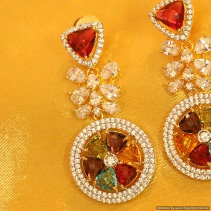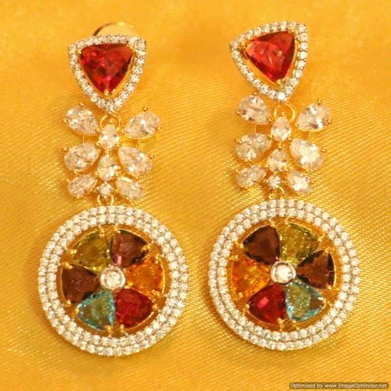 These beautiful earrings are handcrafted in brass alloy with imitation multi gemstone and semi precious american daimonds work of very fine quality. These earrings are coated with 18 kt gold polish which give them a unique look . An absolutely stunning piece to own and are very light in weight.