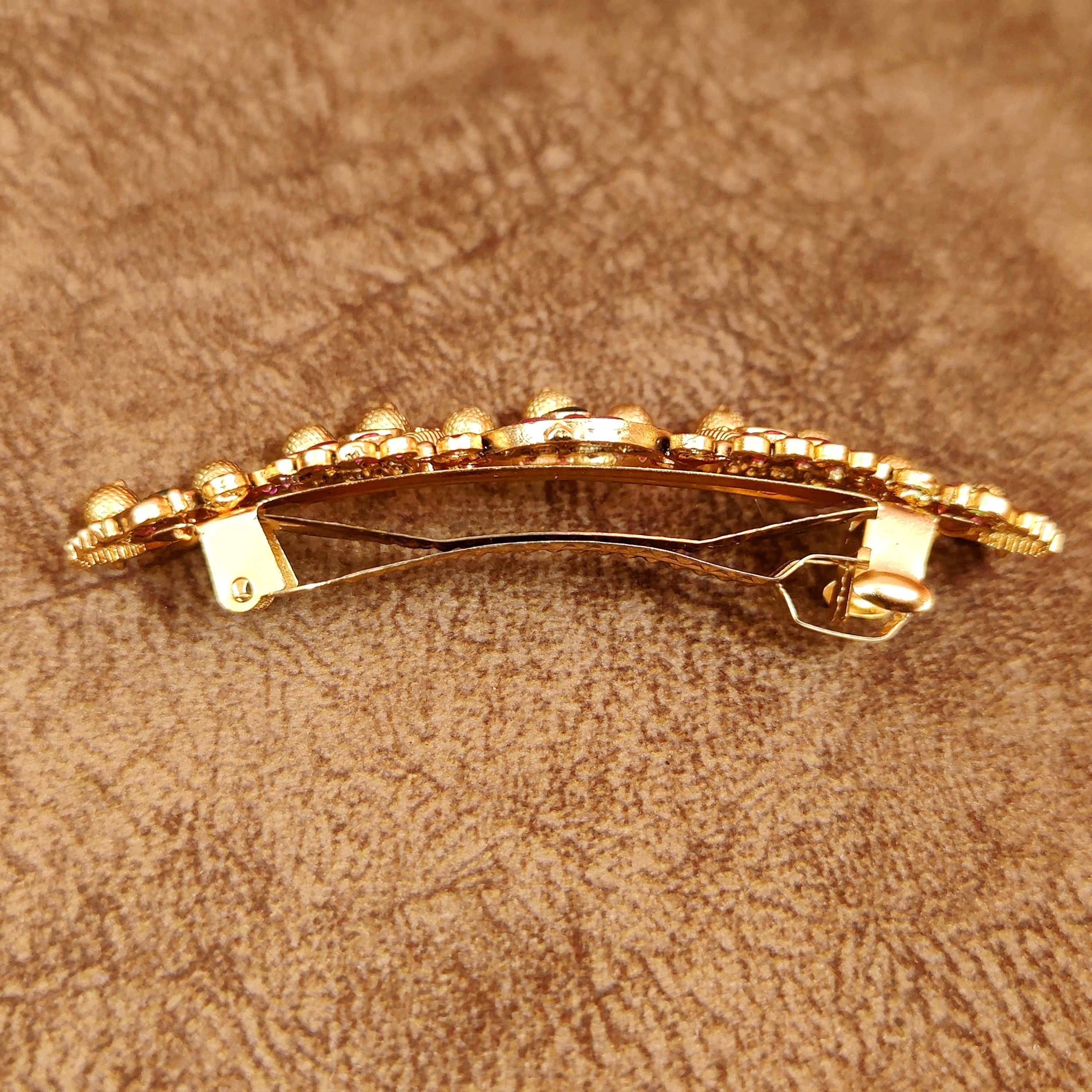 Enhance your traditional look with the Real Kemp Gold Plated Ruby & Emerald Ethnic Hairclip. Designed with authentic Kemp ruby and emerald stones, this exquisite piece boasts an antique gold-plated finish, perfect for weddings, festive occasions, and cultural celebrations. The intricate craftsmanship and secure grip make it both stylish and functional, ensuring a flawless hairstyle with a royal touch.