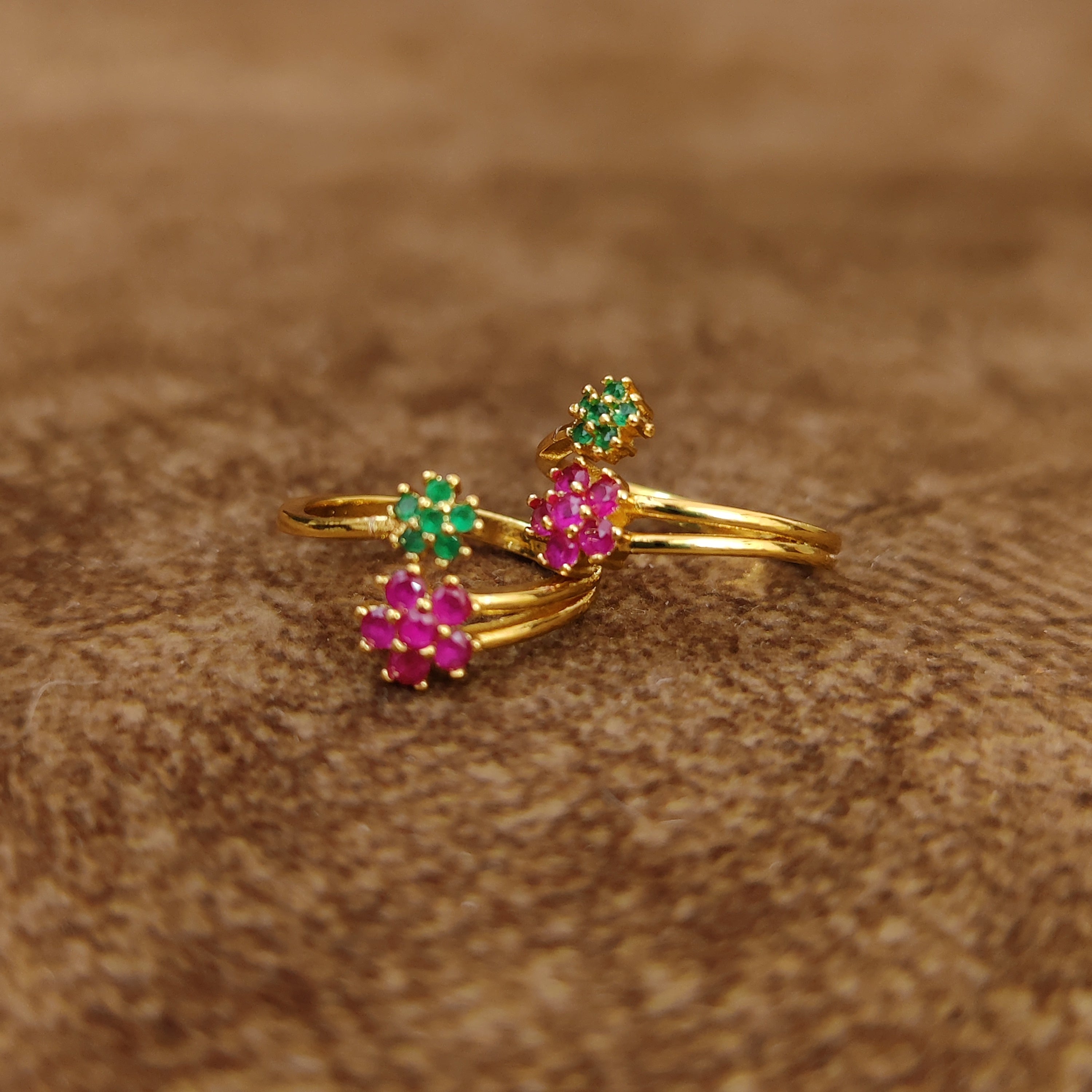 These gold look toe rings are made in silver and brass alloy with imitation ruby and emerald colour cz stones of very fine quality. These cute toe rings are handcrafted to perfection with high quality finish as seen in real diamond jewellery and are plated with 18kt nickle free gold rhodium that gives the design a real look.