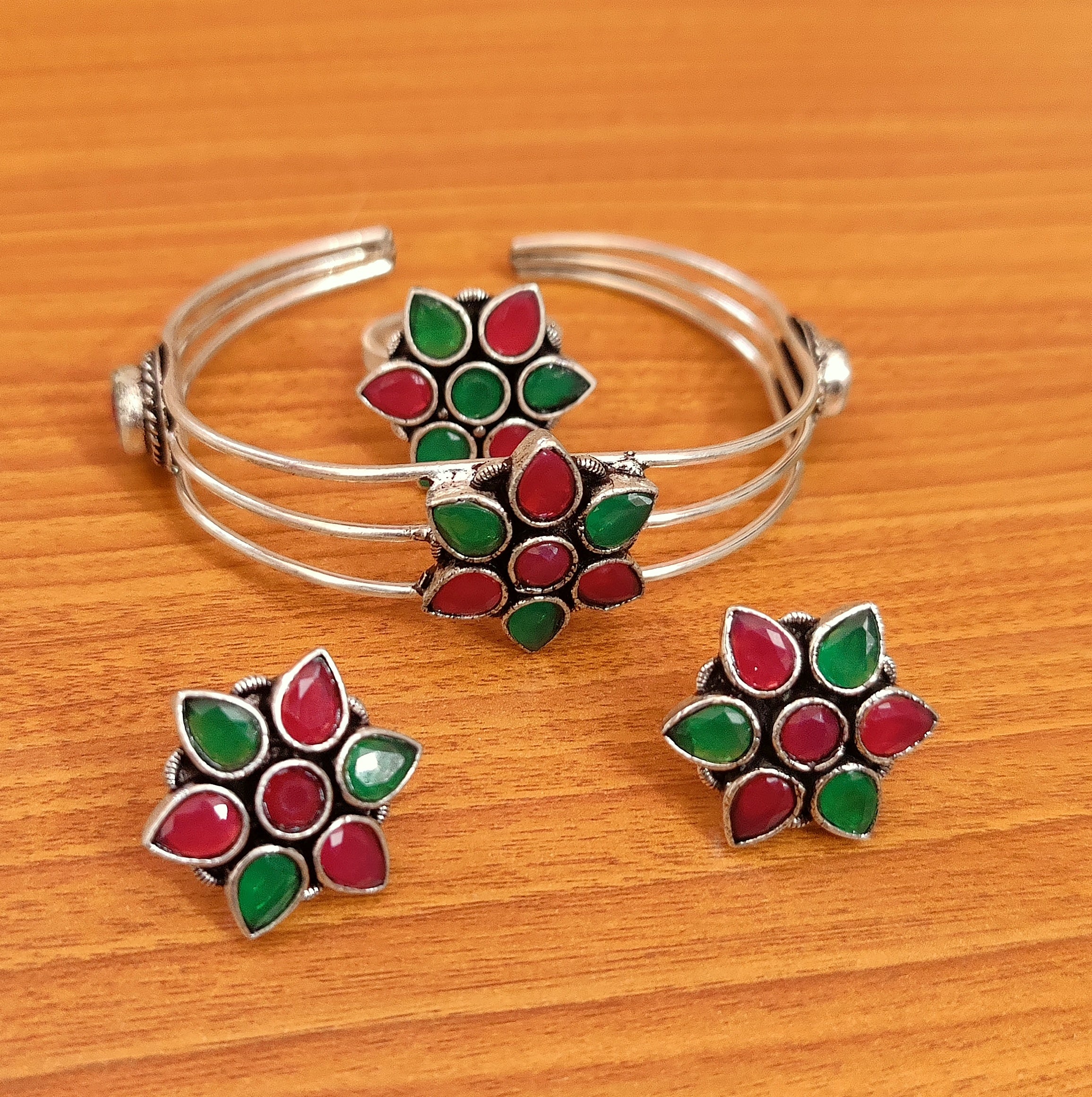 MULTICOLOUR GERMAN SILVER BRACELET EARRINGS & RING SET