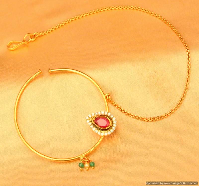 This kundan nose ring is handcrafted in silver alloy with imitation cz stones and ruby kundan stone of very fine quality . This nose ring is coated with fine gold rhodium plating which gives it a real look . The design itself is very unique and a perfect party wear.