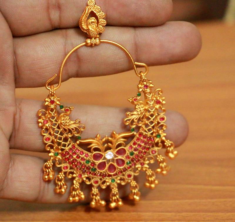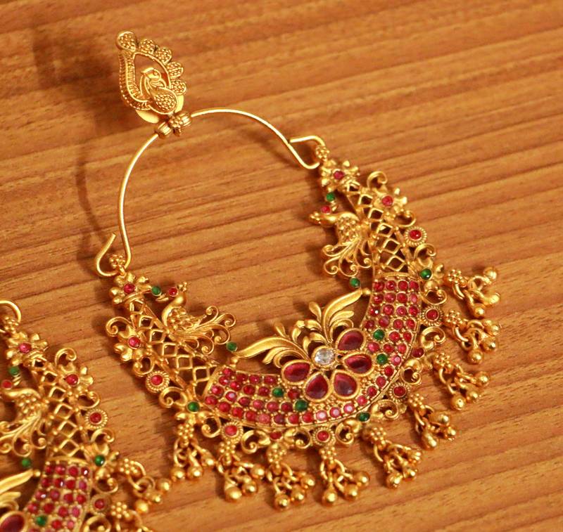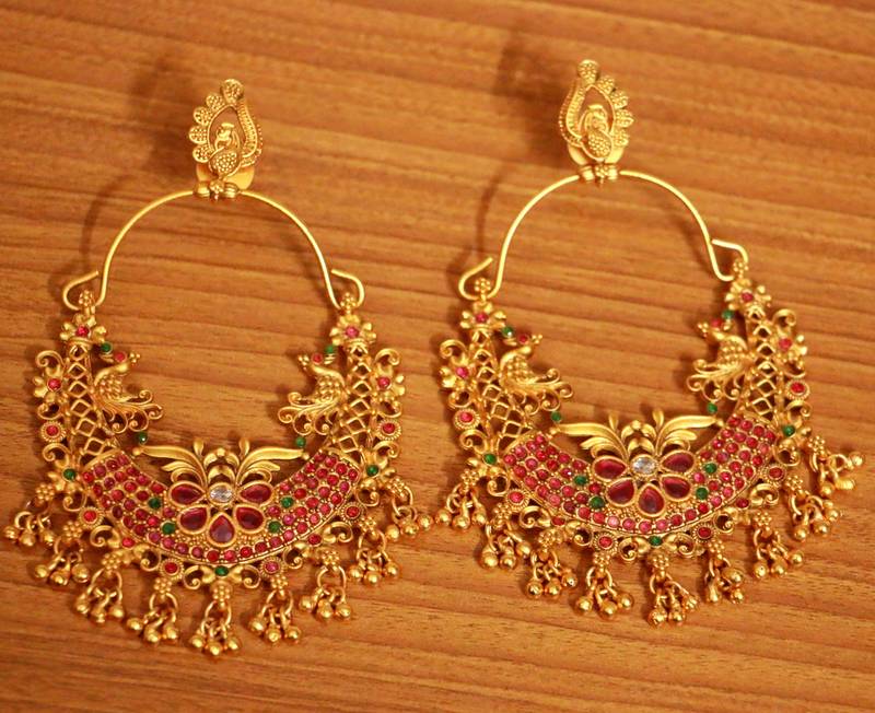 These peacock pattern earrings are handcrafted in copper alloy with imitation ruby stone of very fine quality. These artistic yet modern earrings are plated with high quality gold rhodium. The earrings are very light in weight.