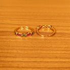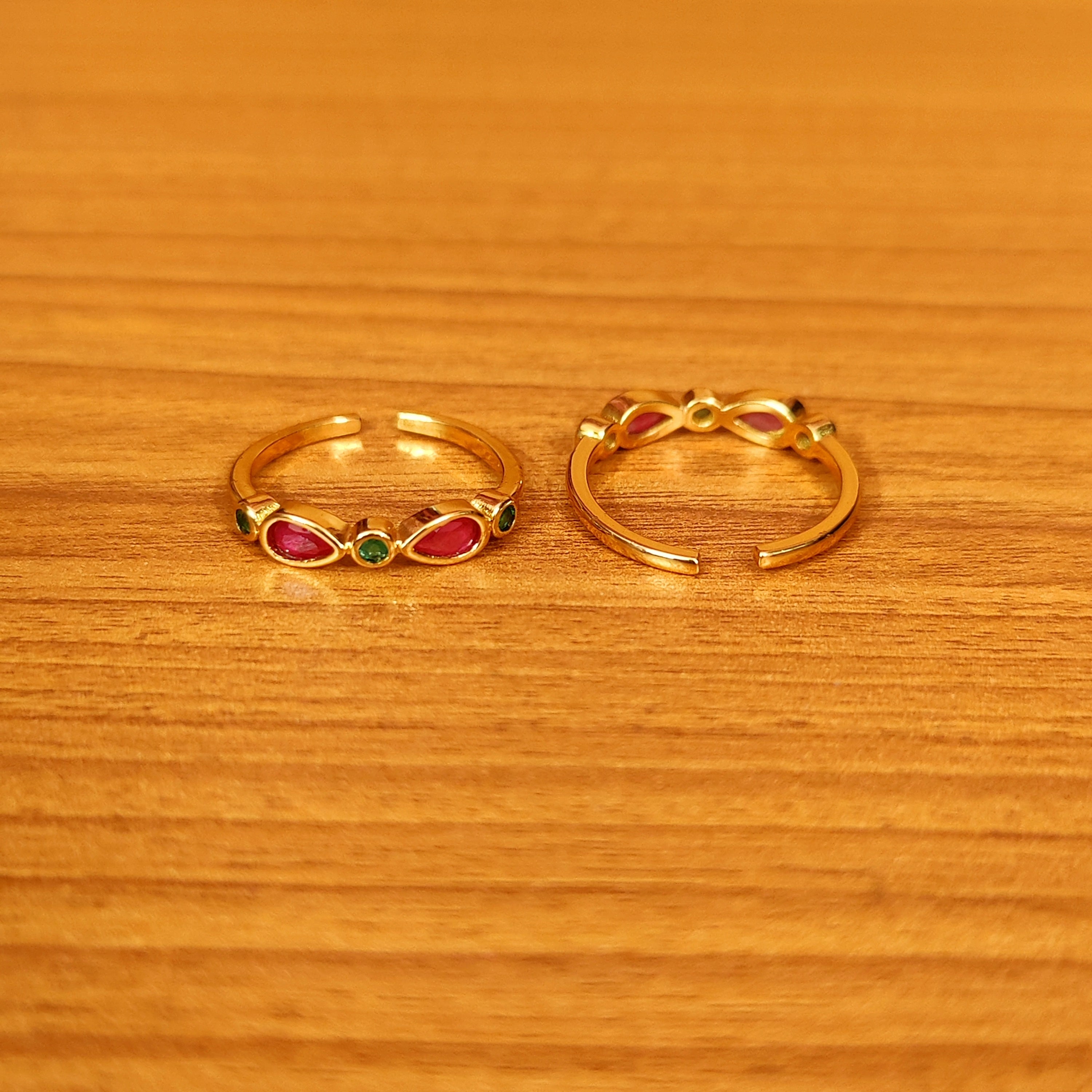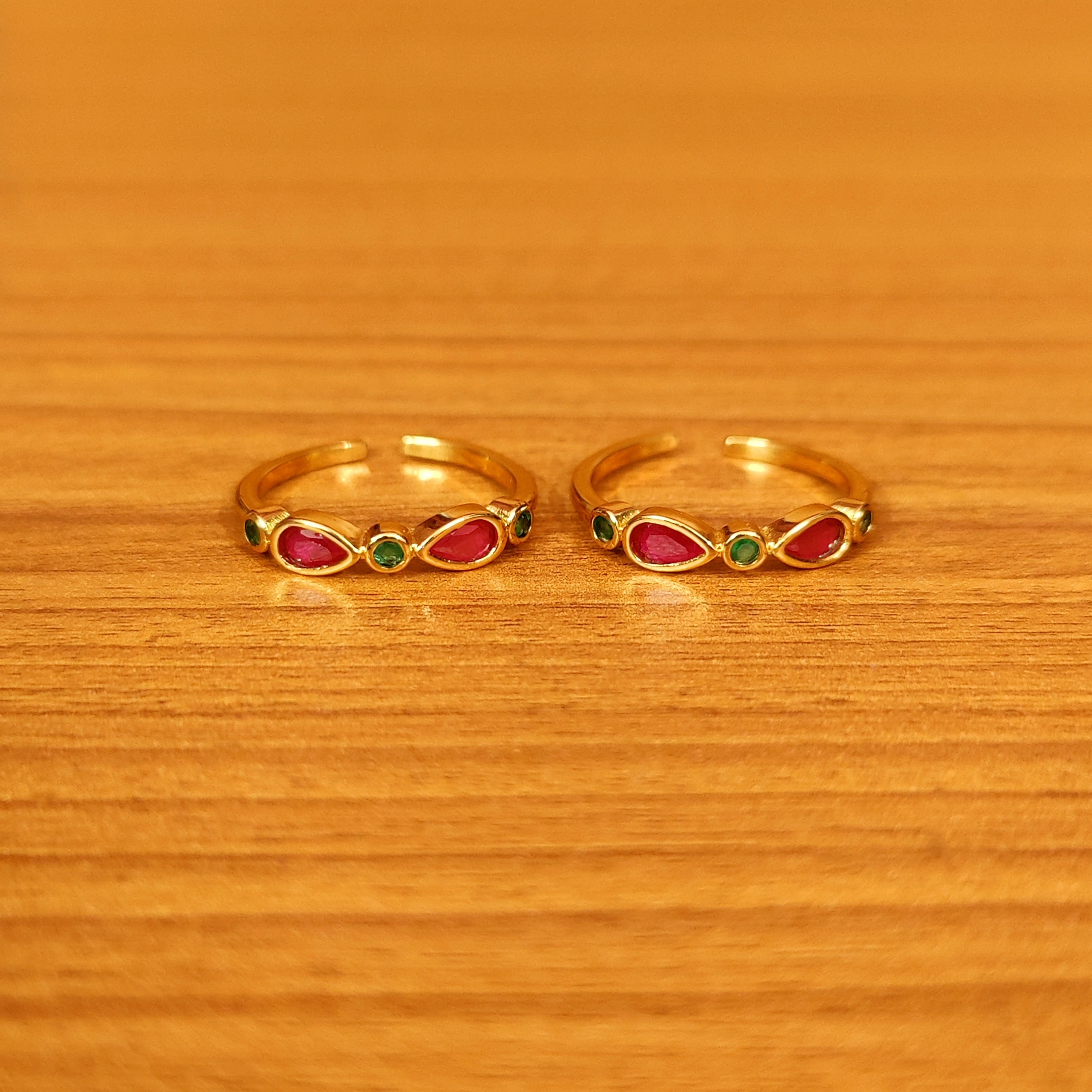 These gold look toe rings are made in silver and brass alloy with imitation ruby and emerald colour cz stones of very fine quality. These cute toe rings are handcrafted to perfection with high quality finish as seen in real diamond jewellery and are plated with 18kt nickle free gold rhodium that gives the design a real look.