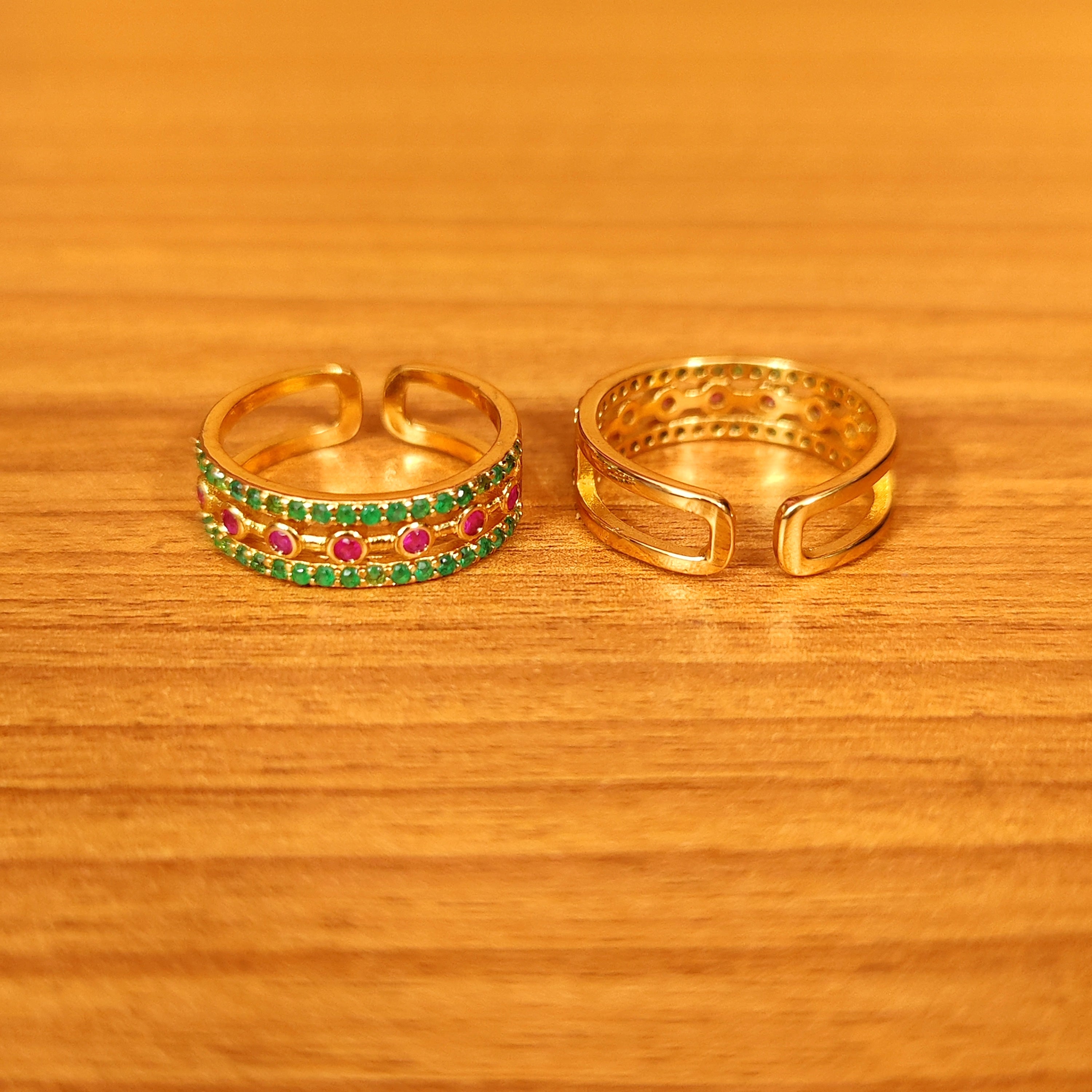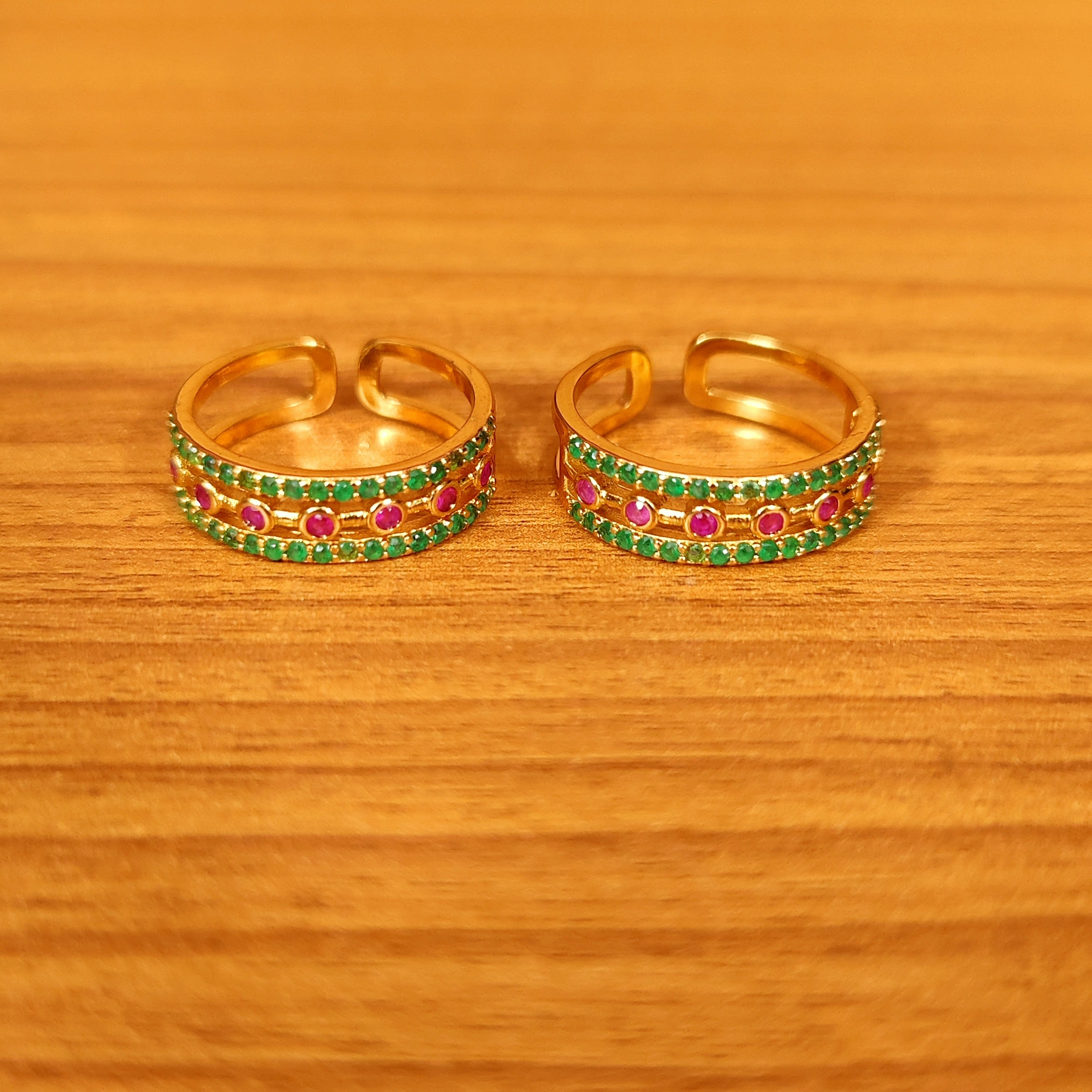 These gold look toe rings are made in silver and brass alloy with imitation ruby and emerald colour cz stones of very fine quality. These cute toe rings are handcrafted to perfection with high quality finish as seen in real diamond jewellery and are plated with 18kt nickle free gold rhodium that gives the design a real look.