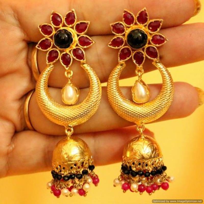 These beautiful earrings are handcrafted in copper alloy with imitation black onyx,ruby and polki work of very fine quality. These earrings are coated with 18 kt gold polish which give them a unique look . An absolutely stunning piece to own and are very light in weight.