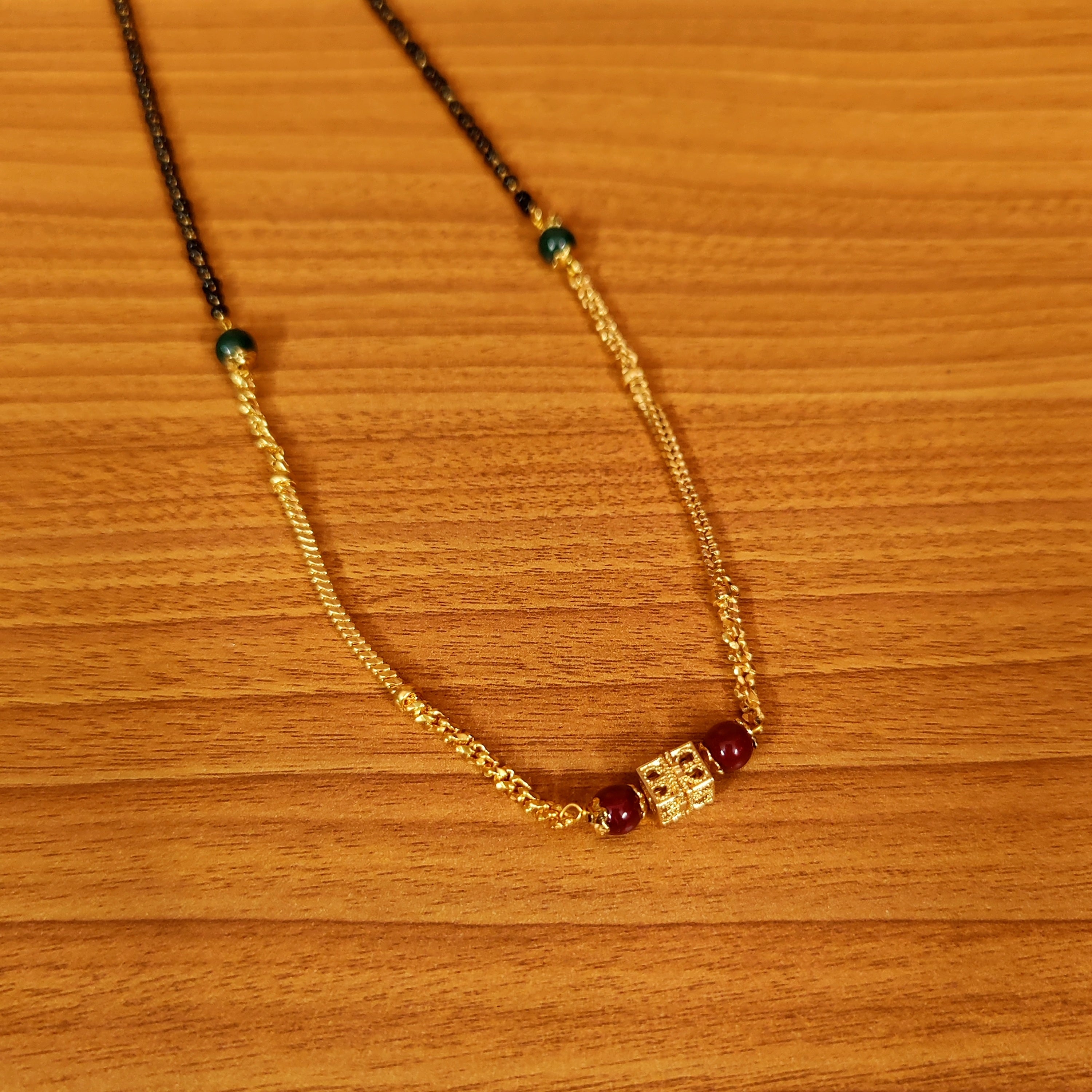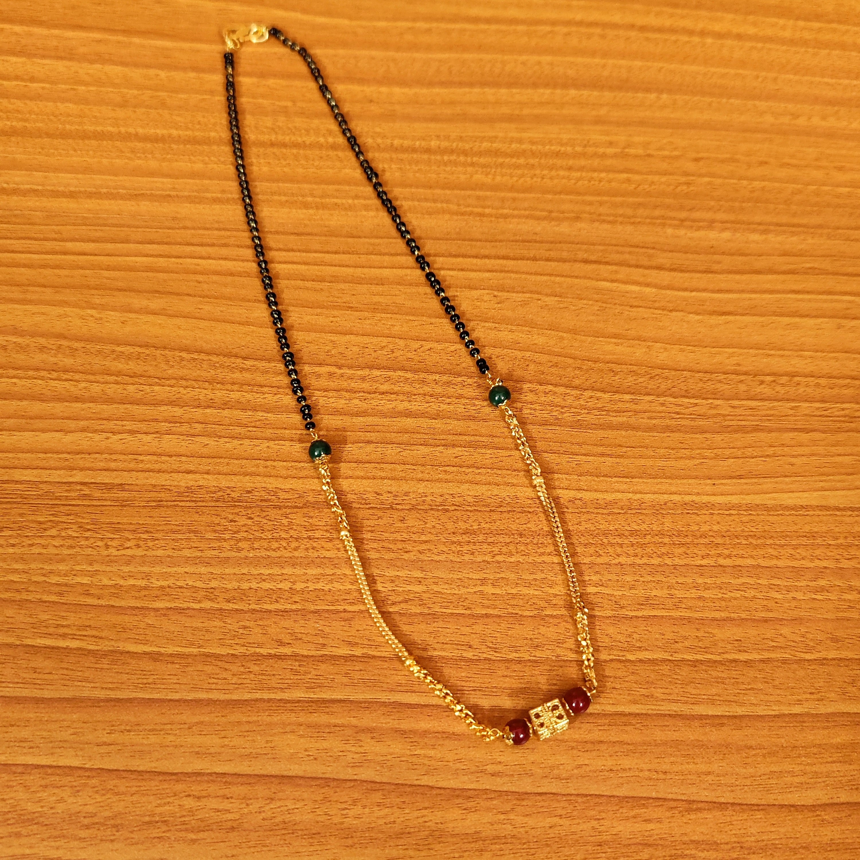 This beautiful mangalsutra is handcrafted in copper alloy with imitation premium quality multicolour pearls of very fine quality . Give this typical Mangal Sutra a new and classy look and make this necessary jewellery a fashion statement with this gorgeously crafted Mangalsutra with golden beads that glitter like golden with a golden touch teamed with the auspicious black beads.