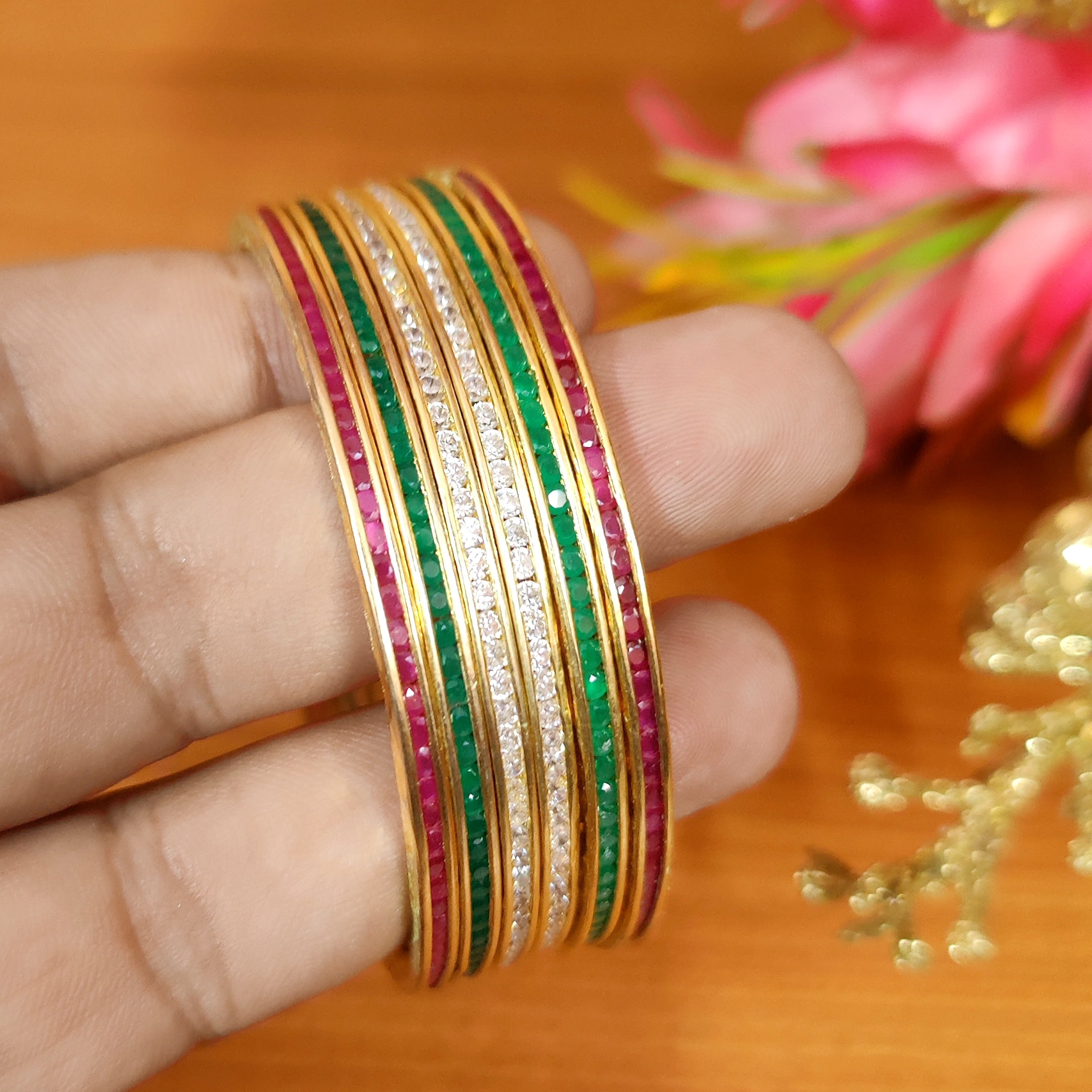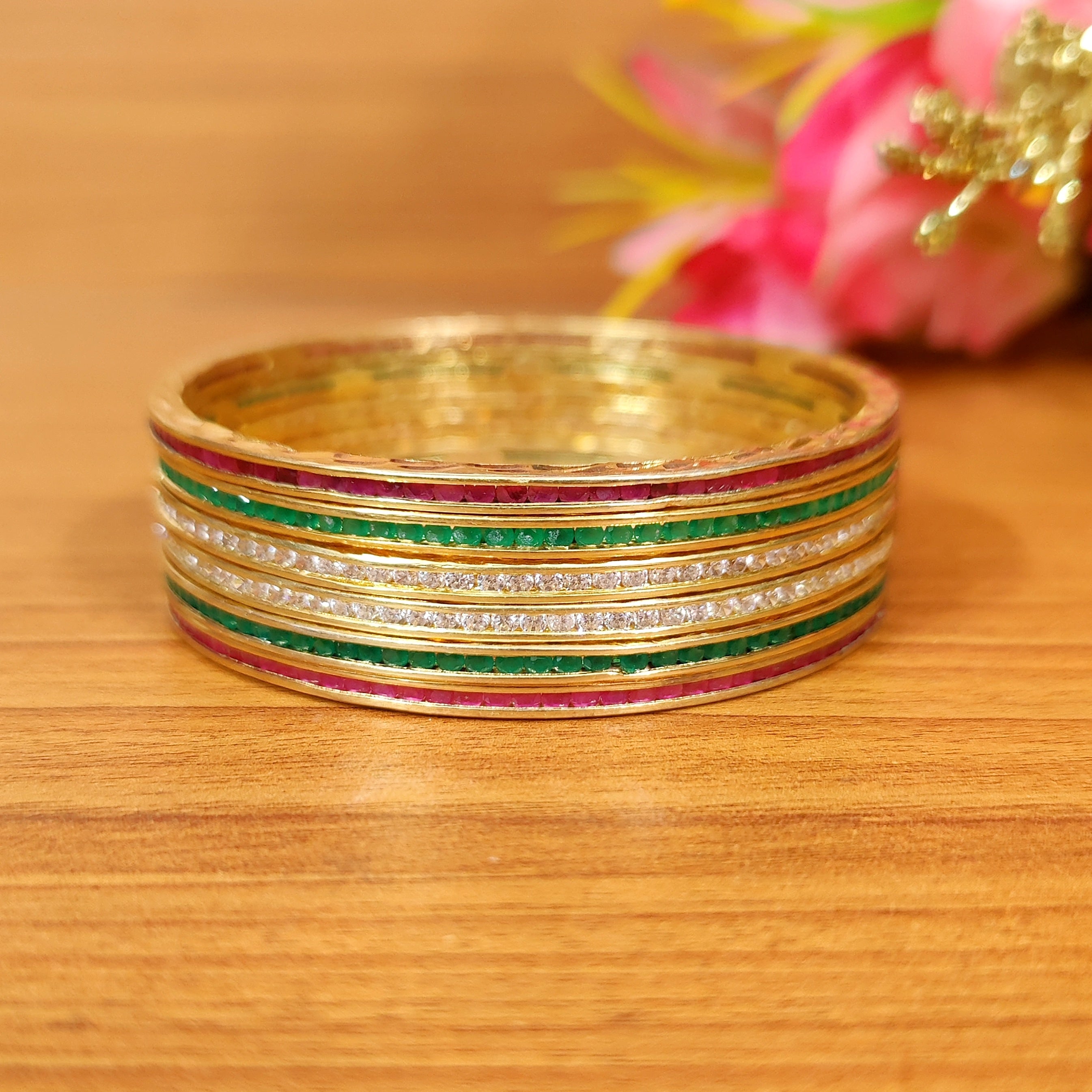 Add a splash of vibrant elegance to your ensemble with the Multicolour Gold Plated Fine CZ Thin Bangles from Sanvi Jewels. These delicate bangles are studded with multicolored cubic zirconia stones, offering a subtle yet striking appeal, all set in a sleek gold-plated design. Perfect for stacking or wearing solo, these bangles bring a playful touch of color and sophistication to both casual and festive looks.