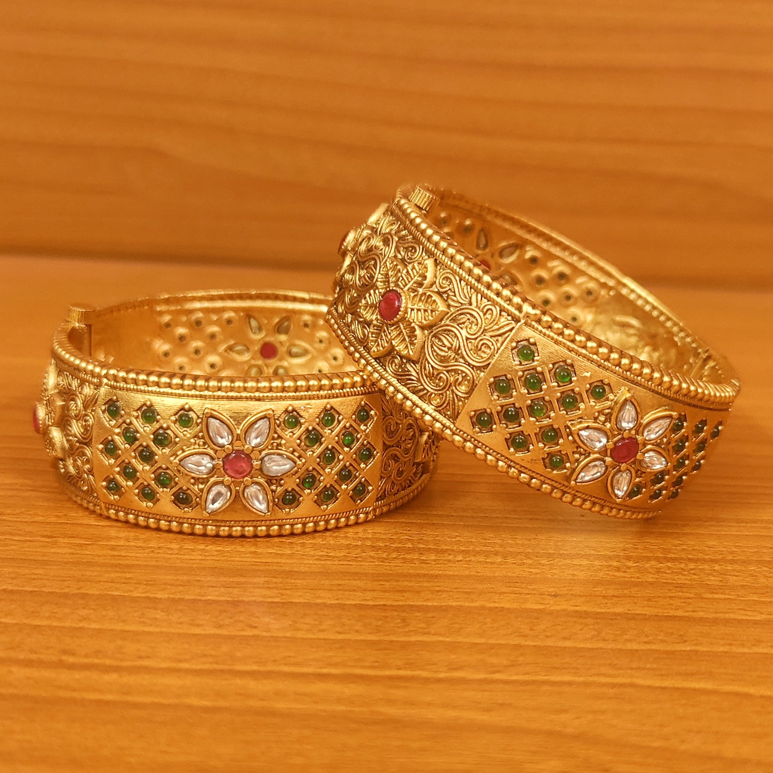 These beautiful matt gold bangles are handcrafted in copper alloy with imitation ruby and emerald colour stone with hand graved carving work of very fine quality. These bangles are coated with 18 kt matt gold rajwadi plating that gives a real look to the design, these bangles comes with a pair and are openable which means if you are selecting 2.4 size, it can fit both 2.4 size and 2.6 size.