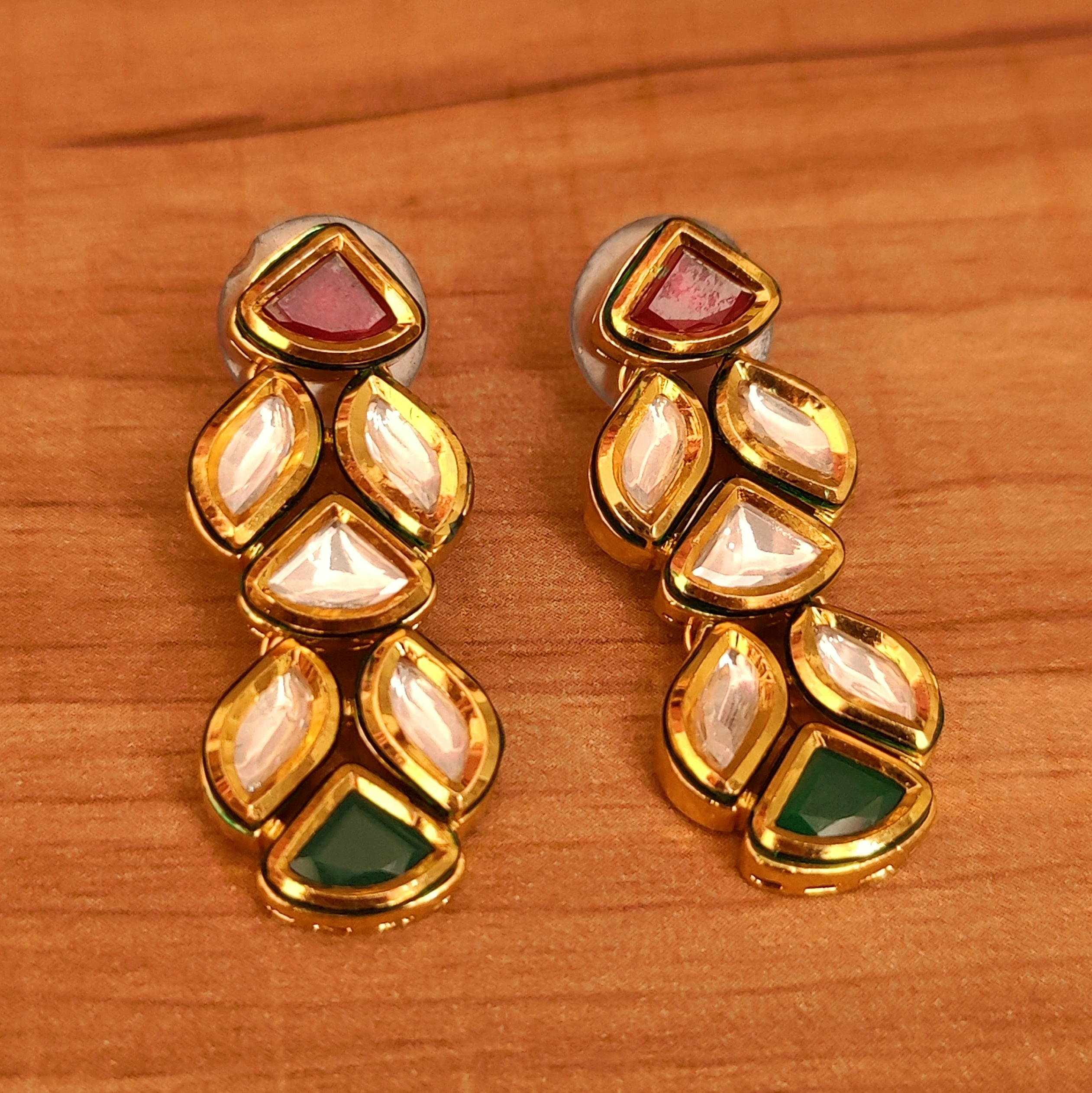 These beautiful earrings are handcrafted in brass alloy with imitation red & green colour stone and kundan with meenakari work of very fine quality. these artistic yet modern earrings are plated with high quality gold rhodium. the earrings are very light in weight.