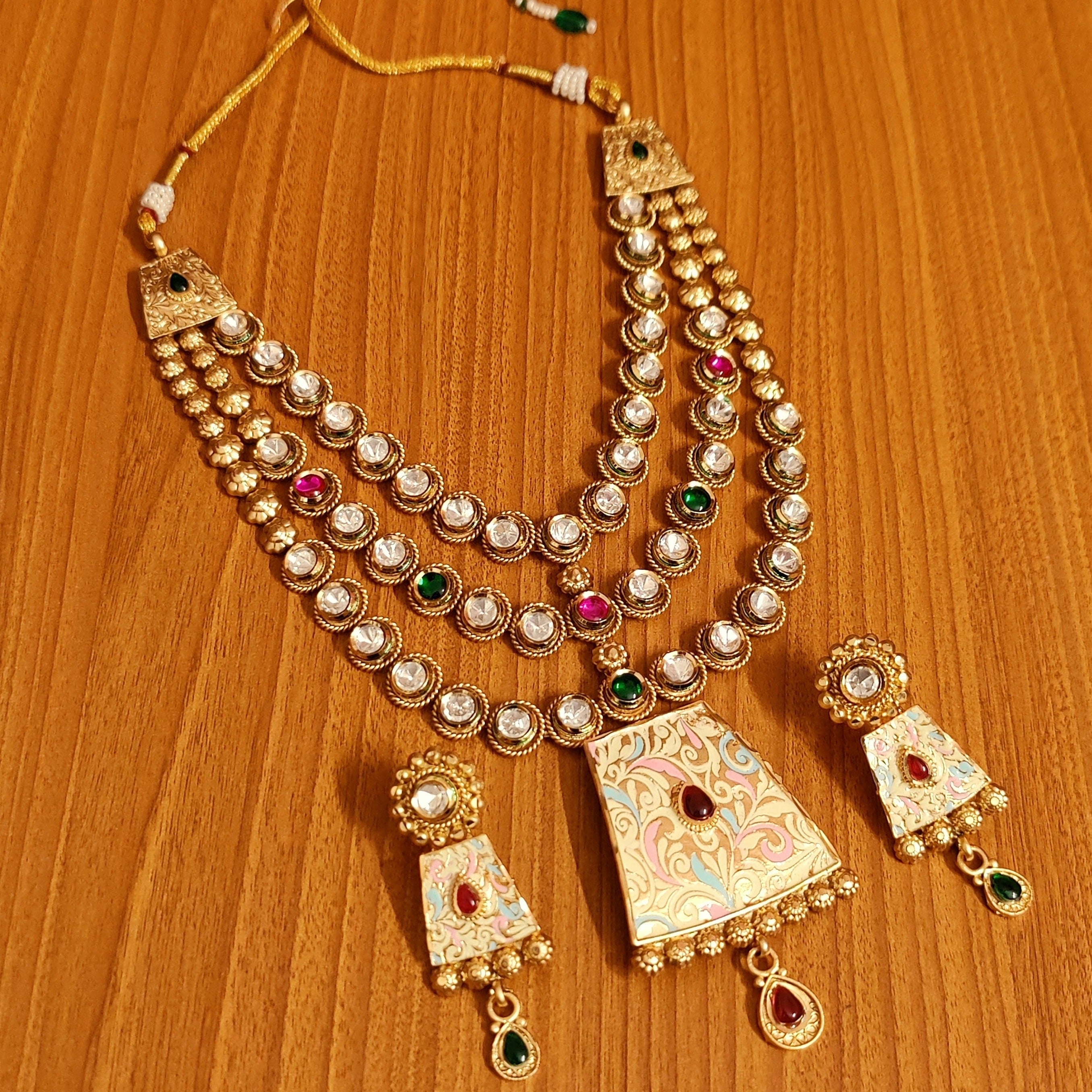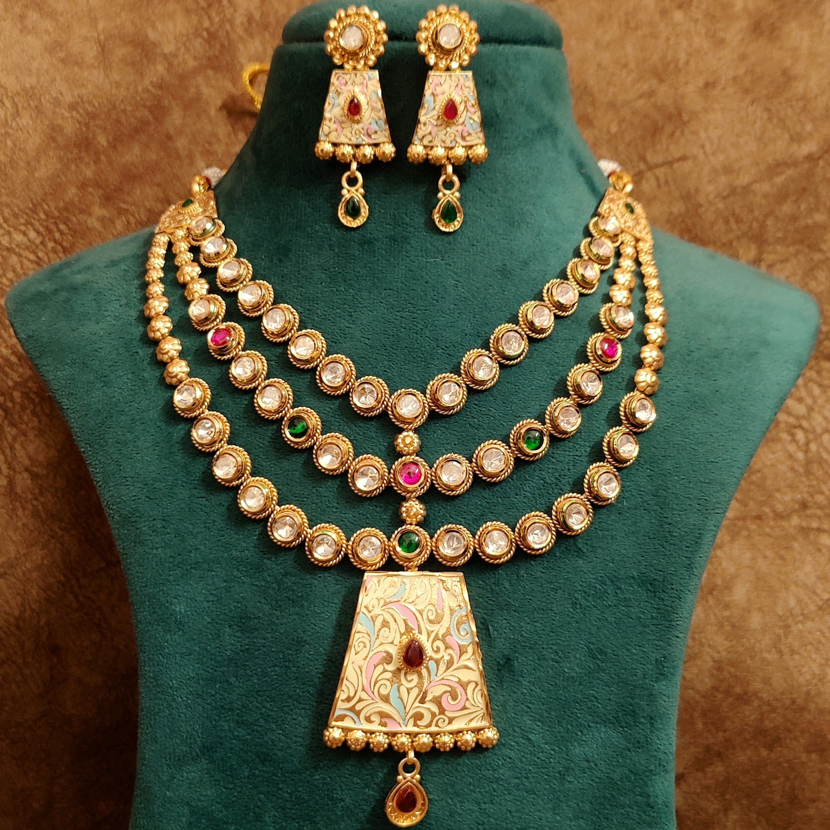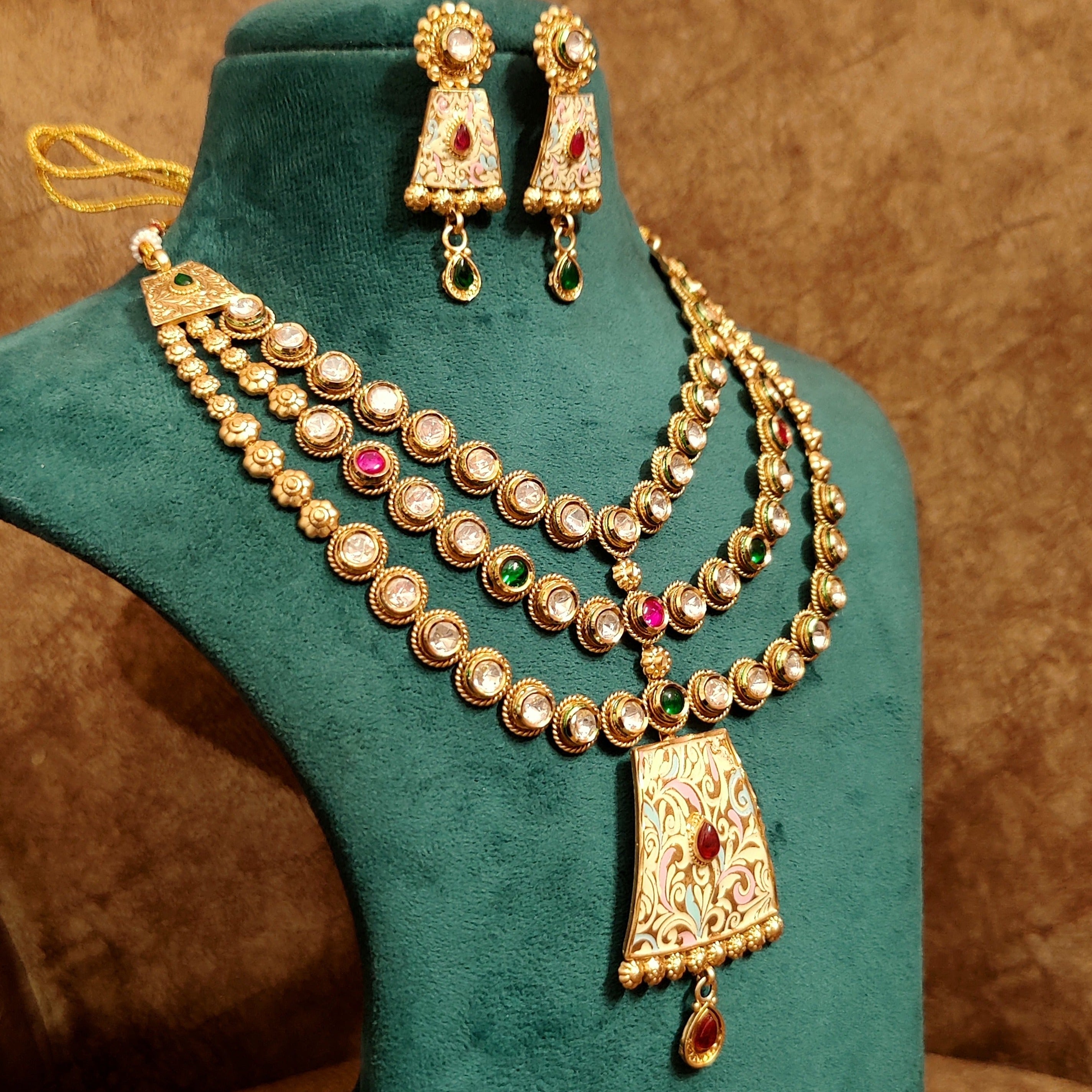 MULTICOLOUR KUNDAN POLKI 3 LAYERED NECKLACE SET