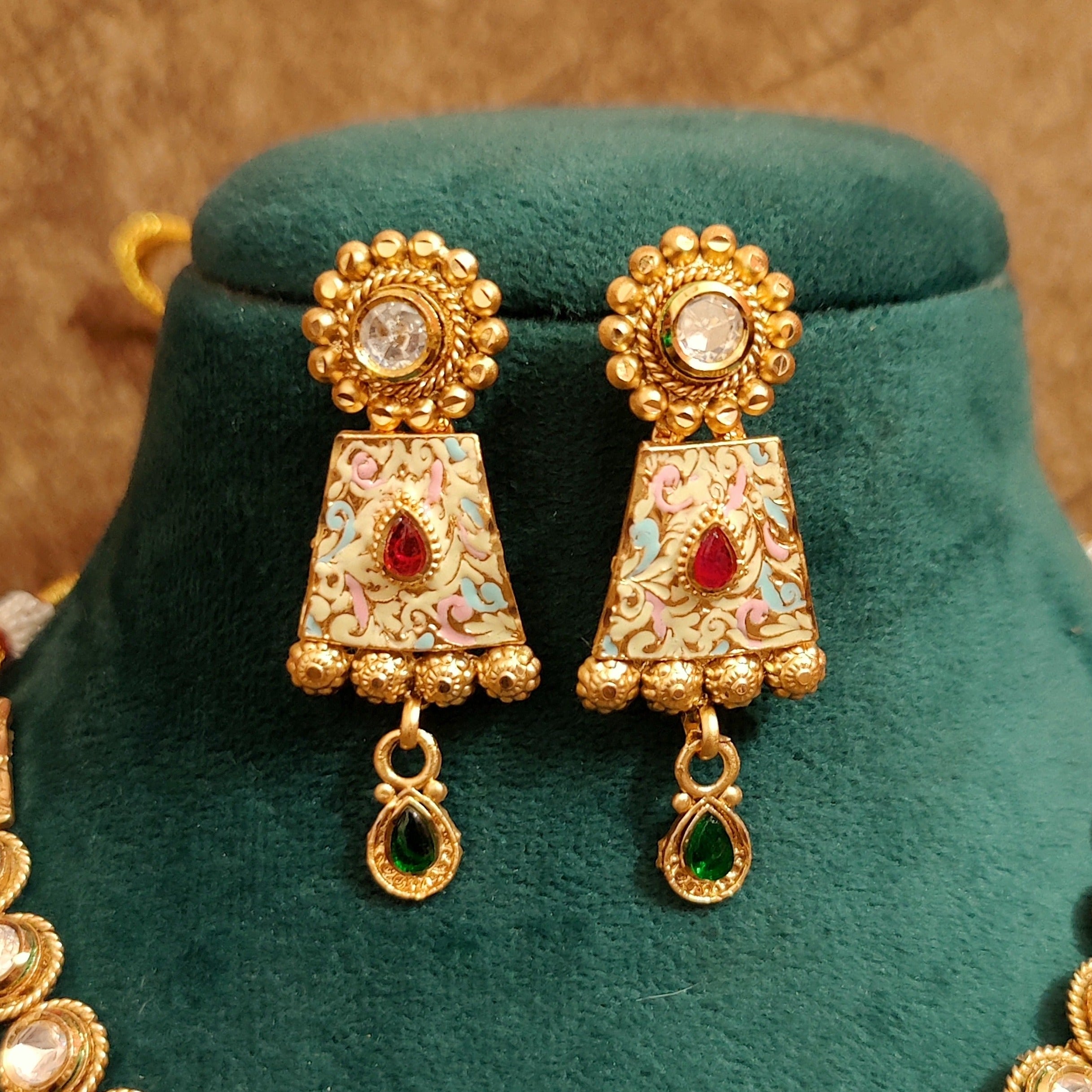 This multicolour kundan polki necklace set is a wedding wear must-have. Adorned with ruby & emerald coloured stones and intricate meenakari work, this 1 gram gold plated set is both budget-friendly and lightweight. Make a statement with its multilayered design, completed by elegant matching earrings.