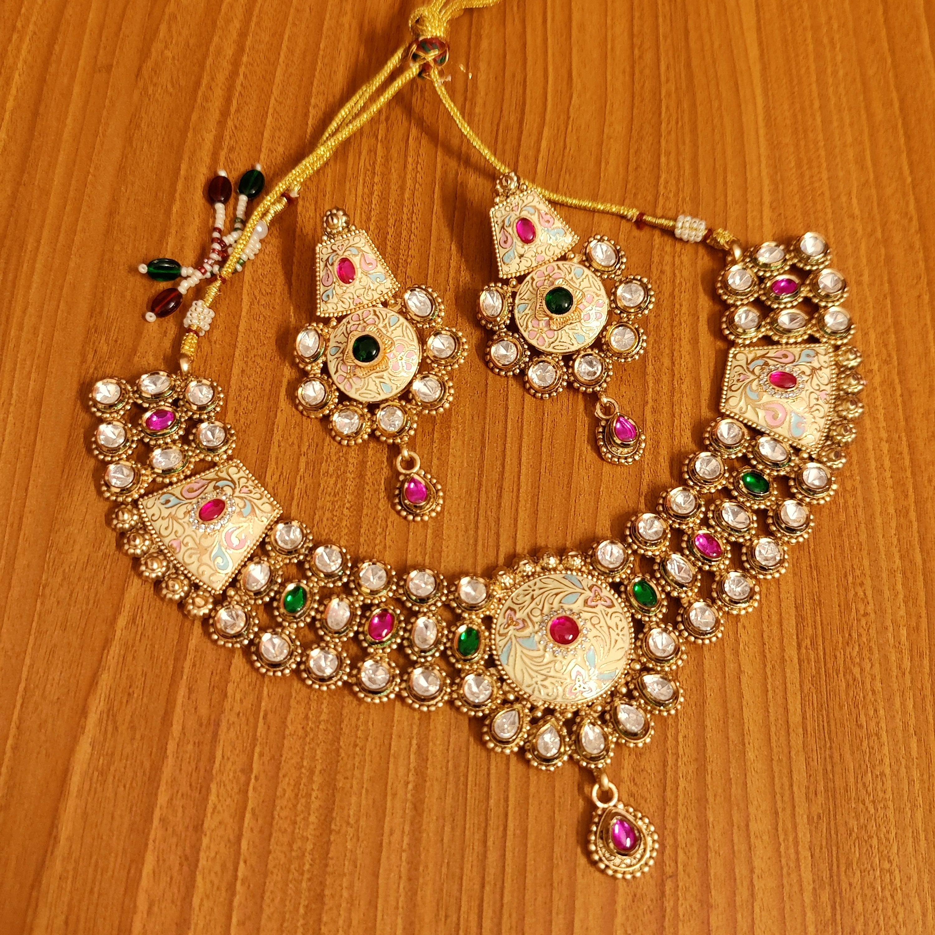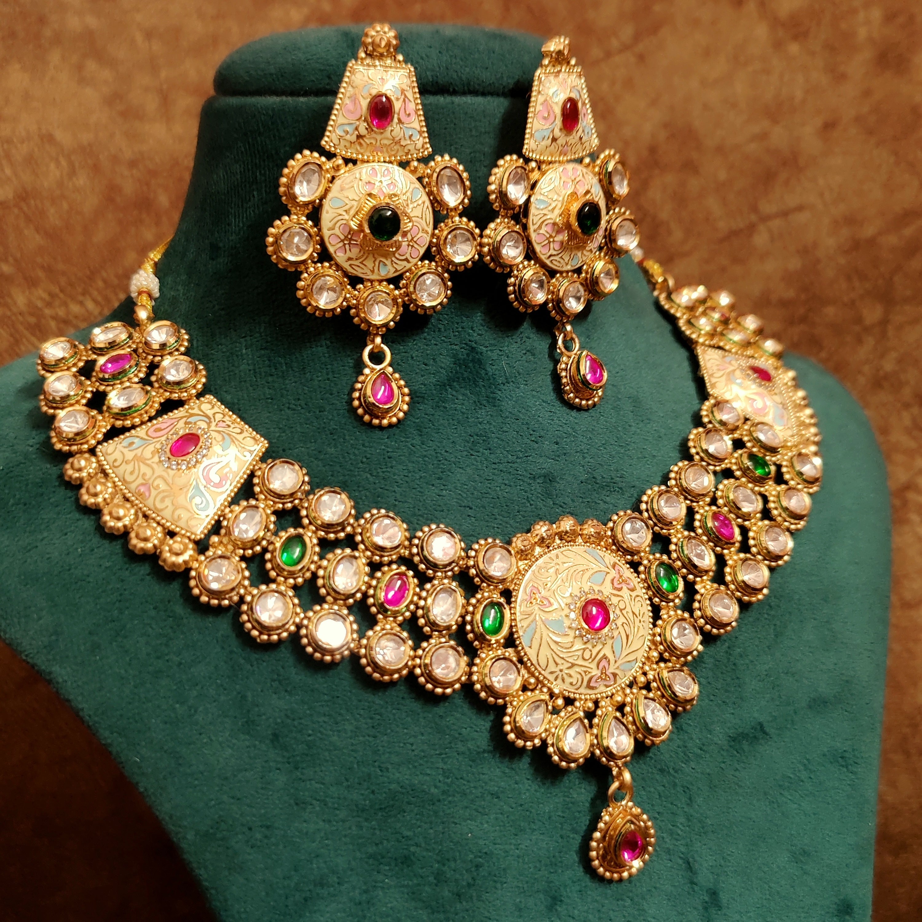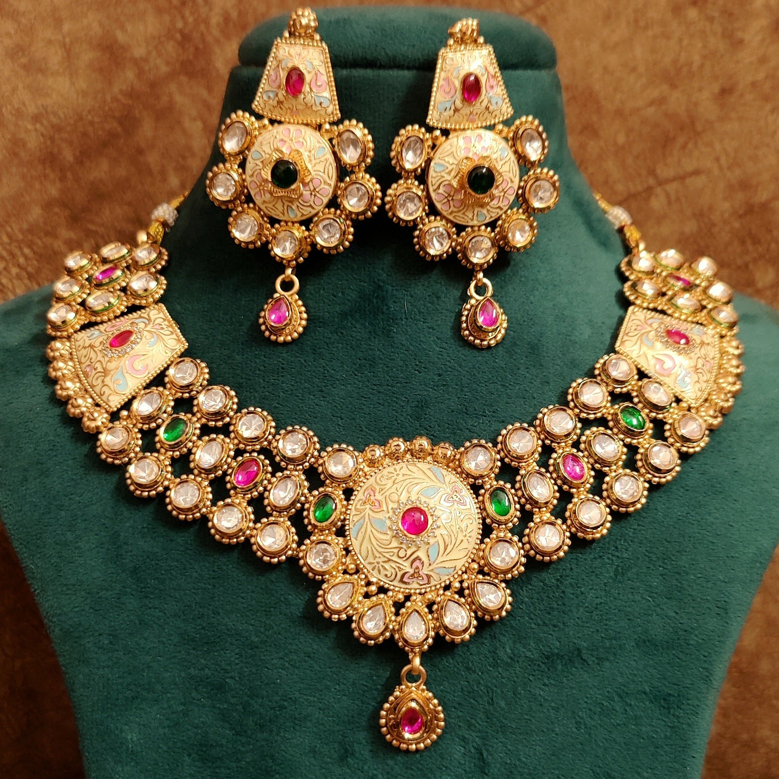 MULTICOLOUR KUNDAN POLKI MEENAKARI GOLD PLATED NECKLACE SET