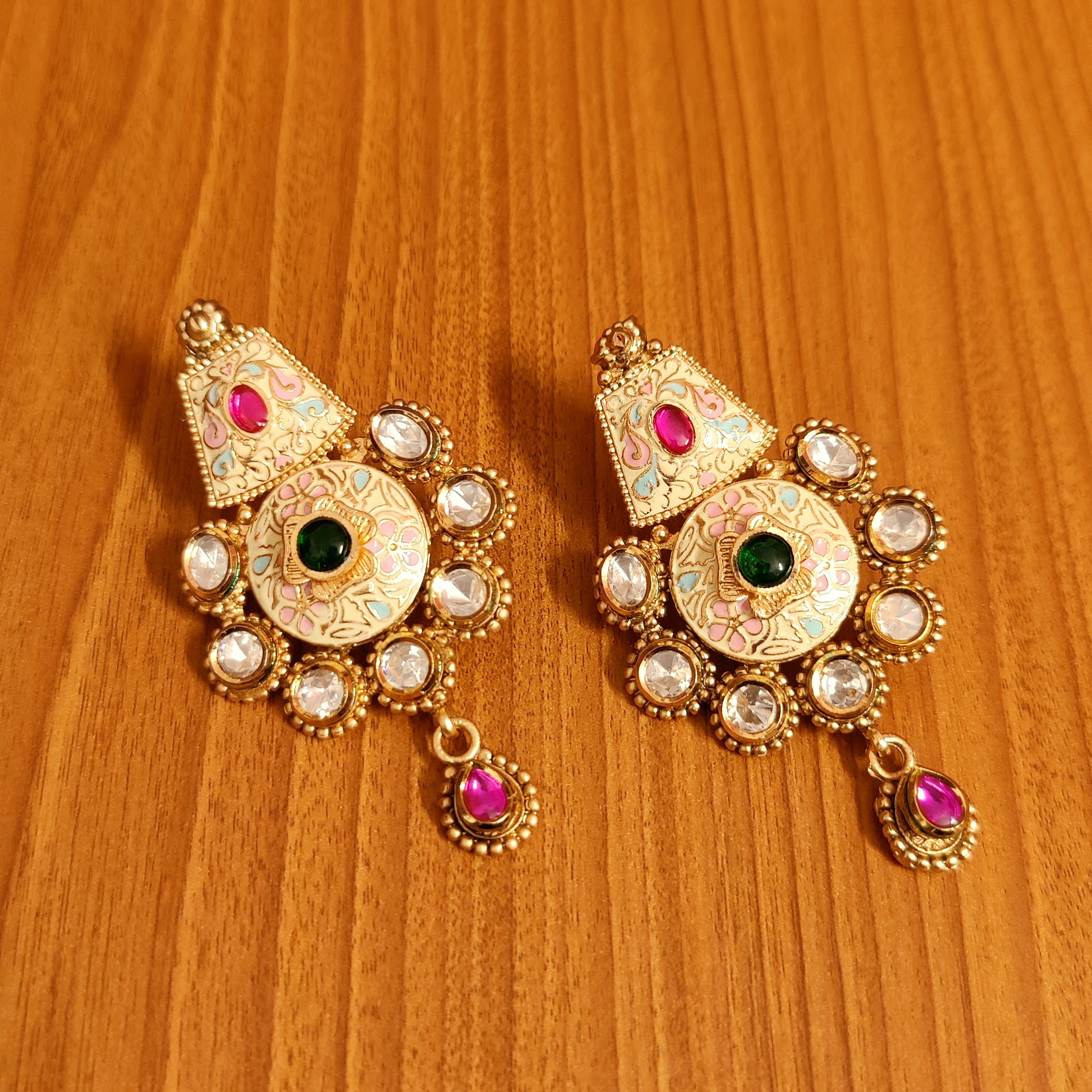Elevate your look with our multicolour kundan polki Necklace Set! Featuring mesmerizing green and red kundan stones, this set is adorned with intricate kundan polki and meenakari work. The perfect matching pair of earrings completes the 22kt gold plated set. Perfect for weddings, parties, or any special occasion. Stand out with this unique and trend-setting necklace set!