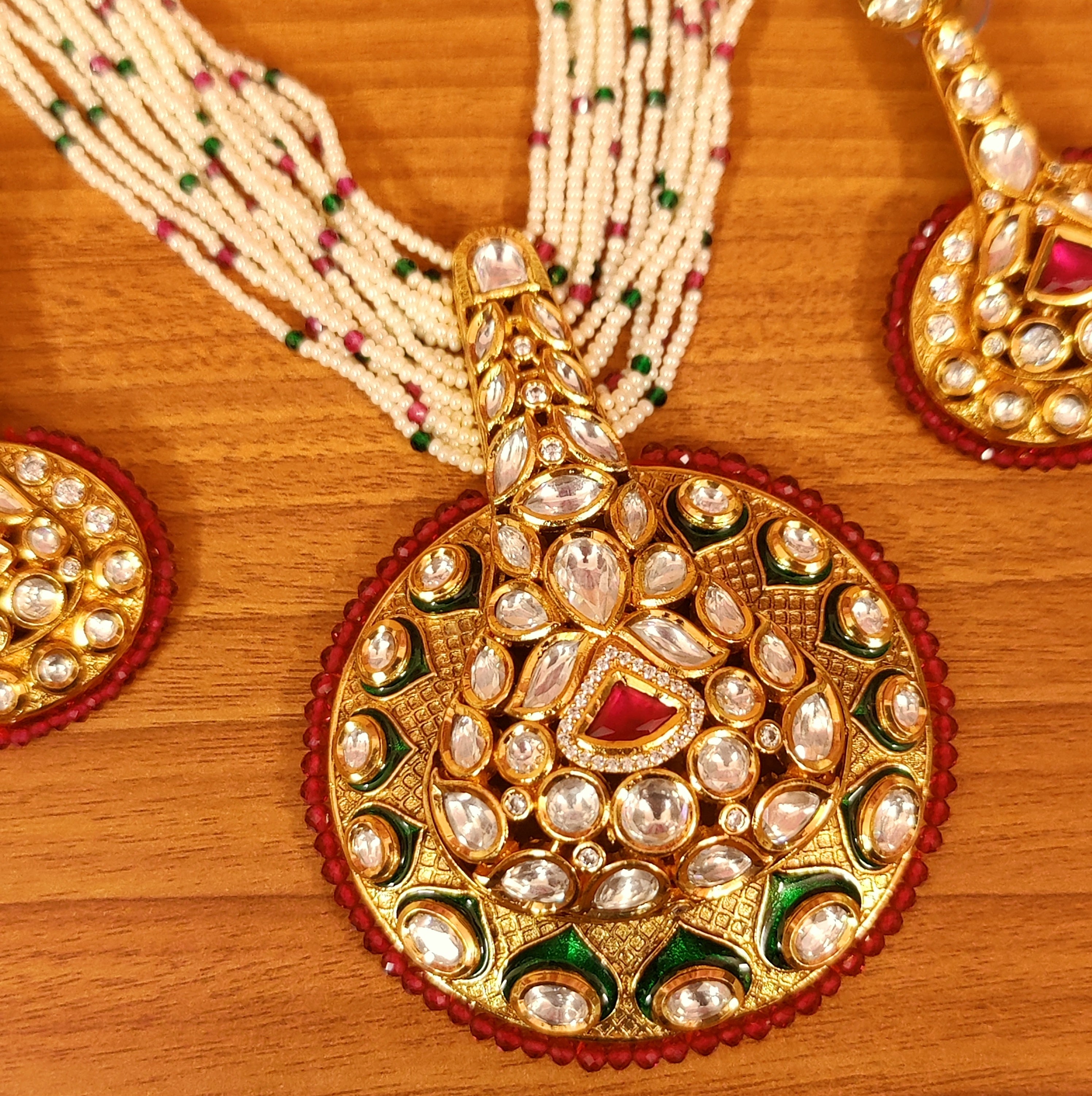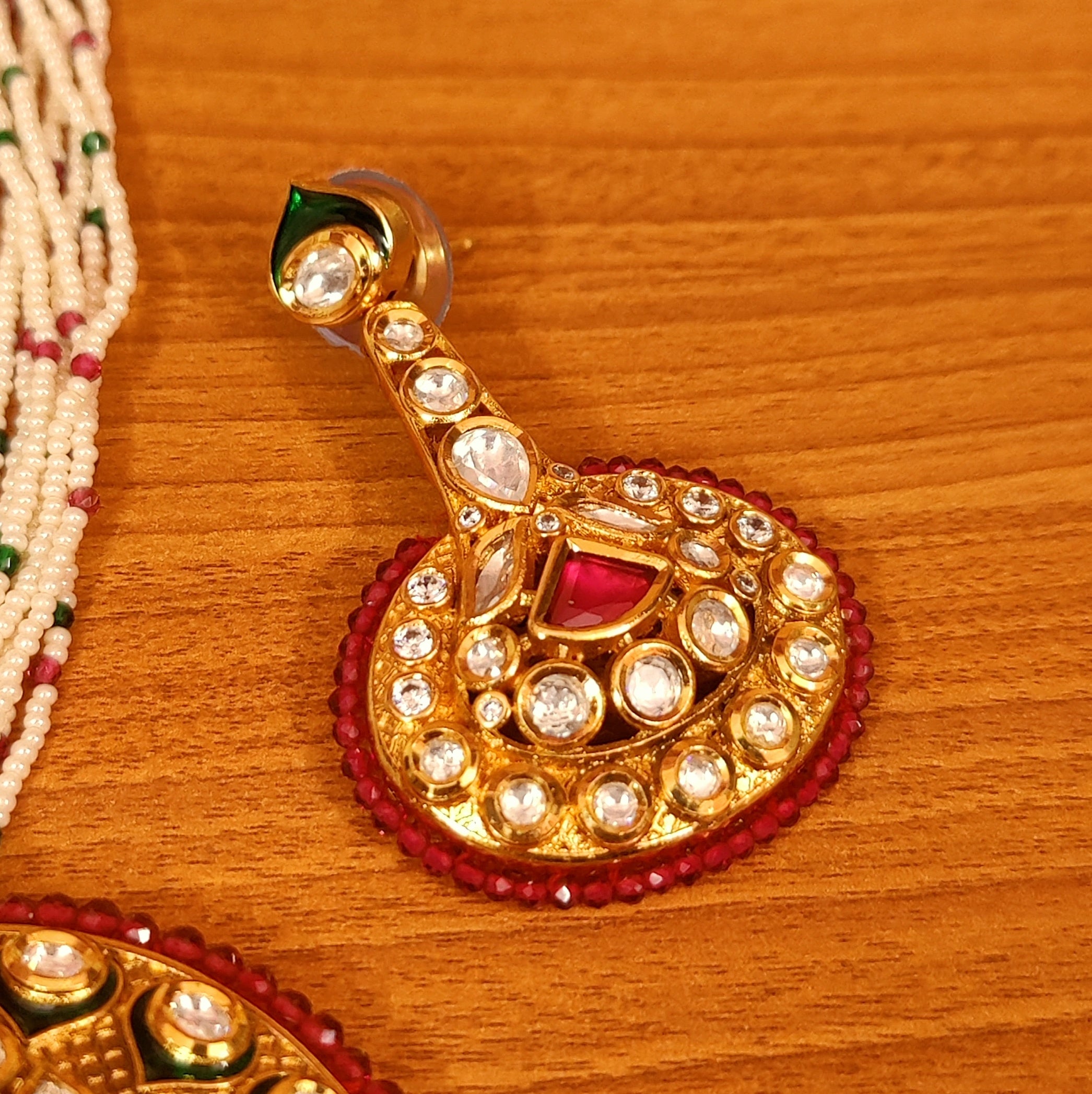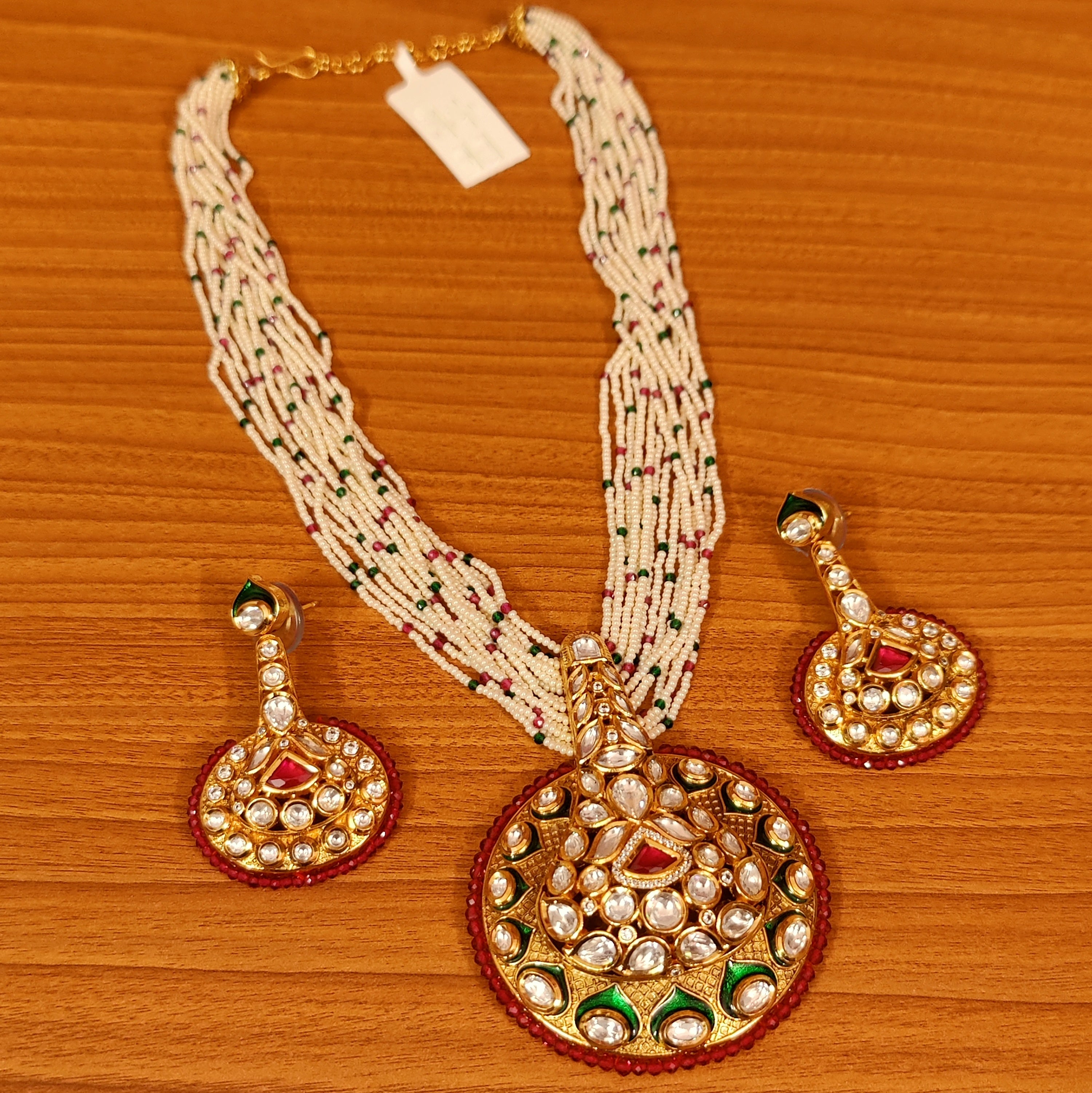 This beautiful necklace set is handcrafted in brass alloy with imitation red colour stone & semi precious pearls, beads and kundan with meenakari work of very fine quality . this necklace set is coated with 18 kt gold rhodium plating that gives a real gold look . an absolutely stunning piece to own and are light in weight.