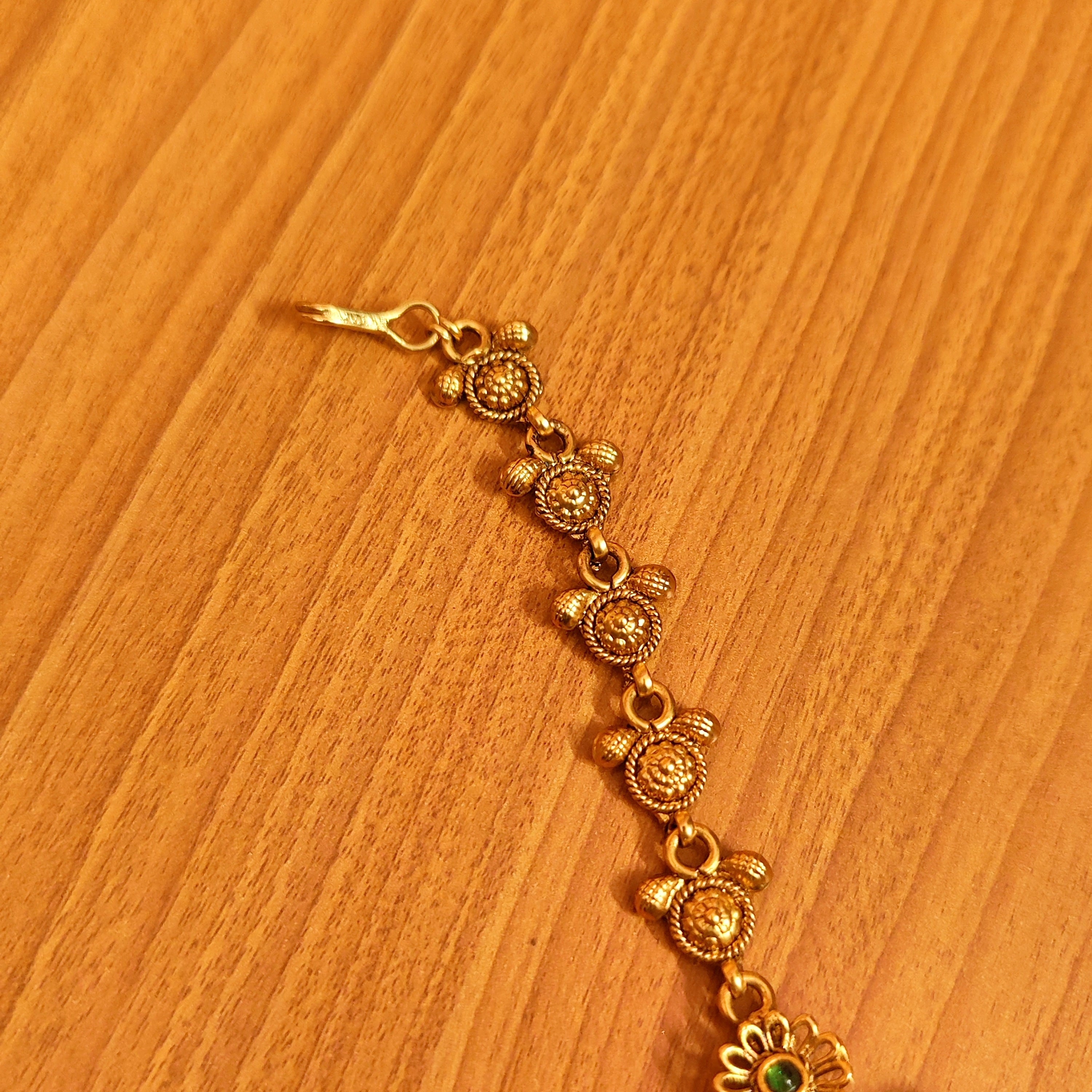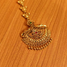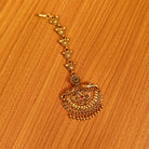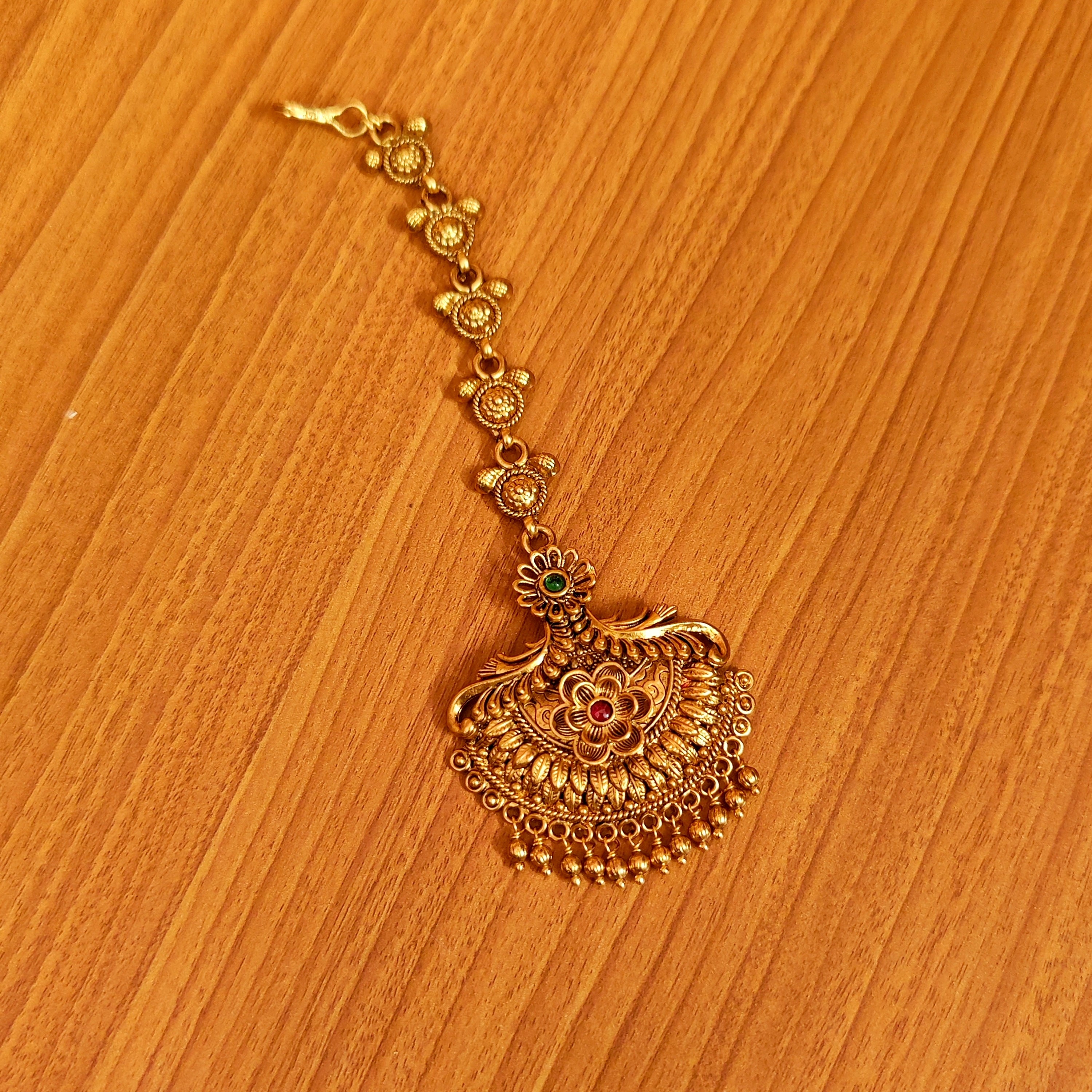 This beautiful bridal look mathapatti is handcrafted in copper alloy with minute & intricate gold work of very fine quality . This mathapatti is coated with 22 Kt matt gold plating which gives a very real look to the design . An absolutely gorgeous piece and is very light in weight.